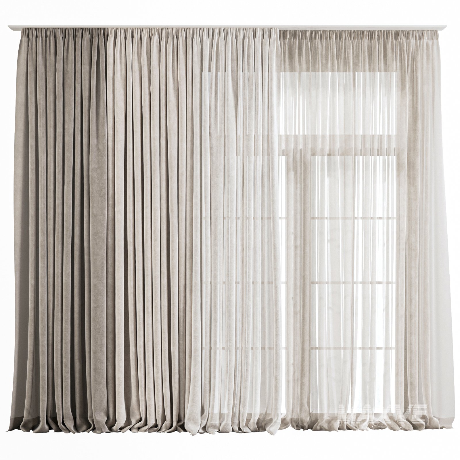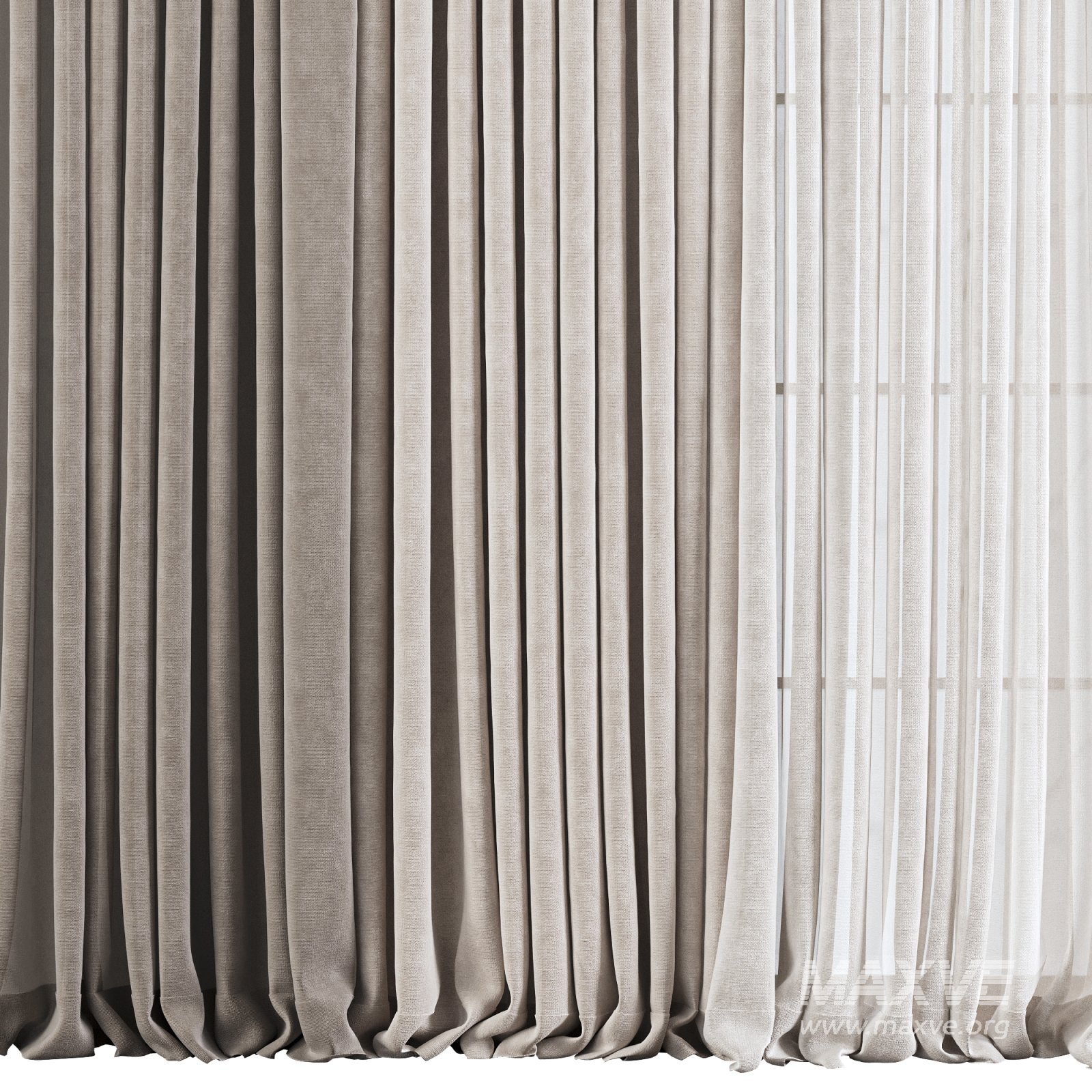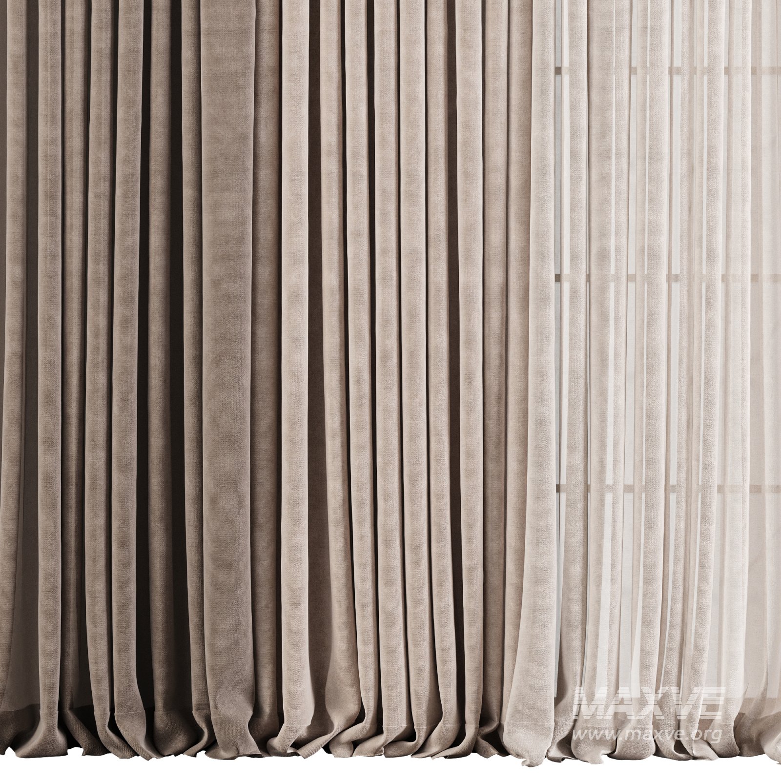 Realistic 3D model of a double-layer curtain set designed for full-height or large windows. The combination of a dense outer layer with a lightweight sheer inner curtain creates a balanced look that provides both privacy and natural light. Ideal for modern and minimal interiors, with natural pleats and soft fabric fall for photorealistic renders.