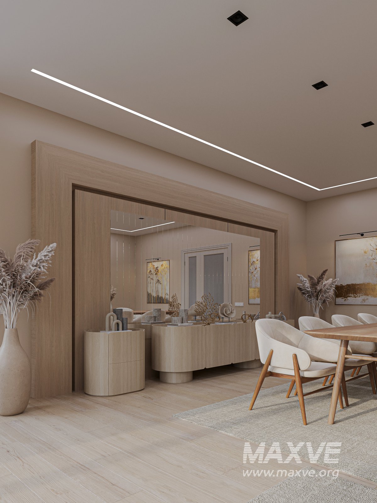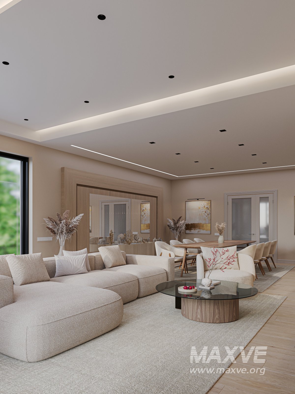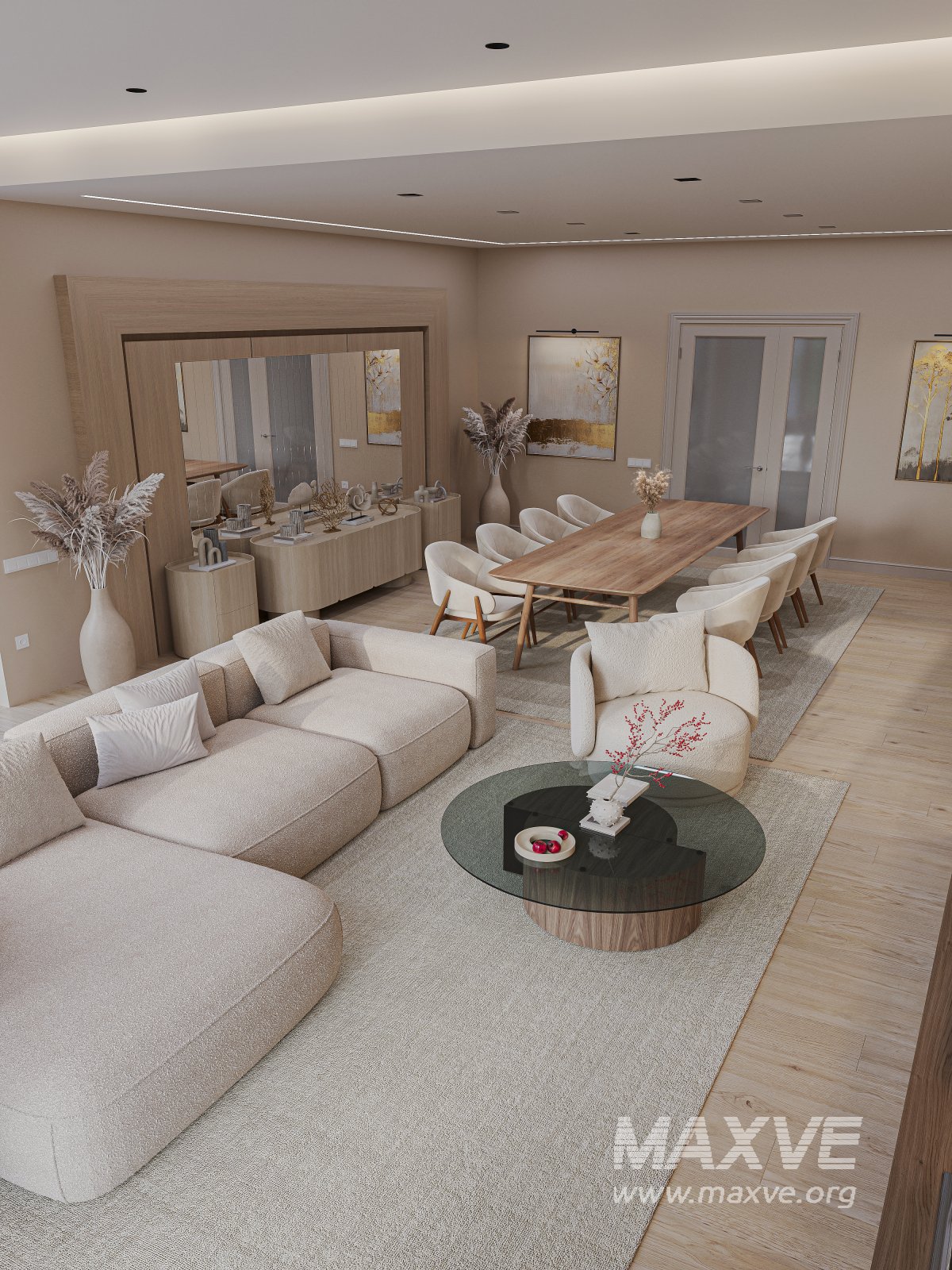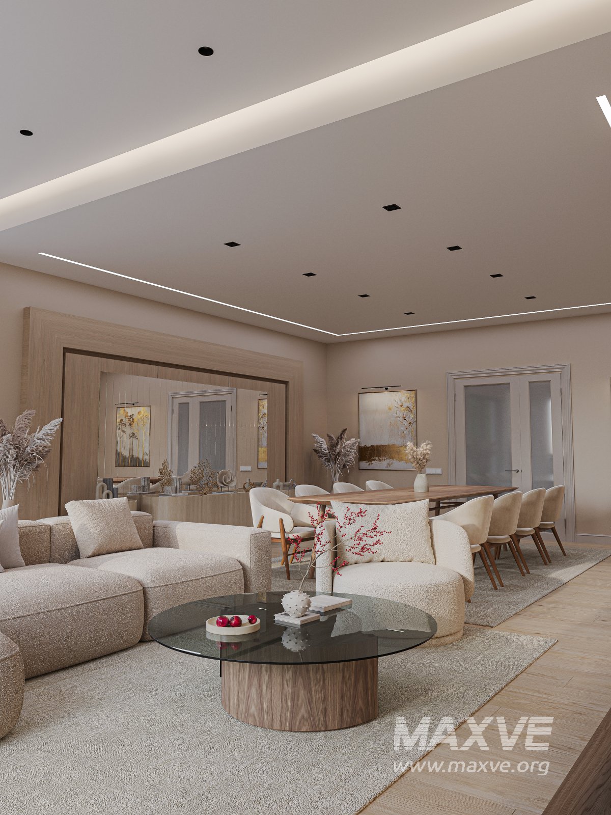 This interior combines comfort and aesthetics in soft beige and pastel tones. A spacious cozy sofa, modern LED lighting system, natural wood furniture, and minimalistic decor come together to create the perfect relaxing atmosphere.