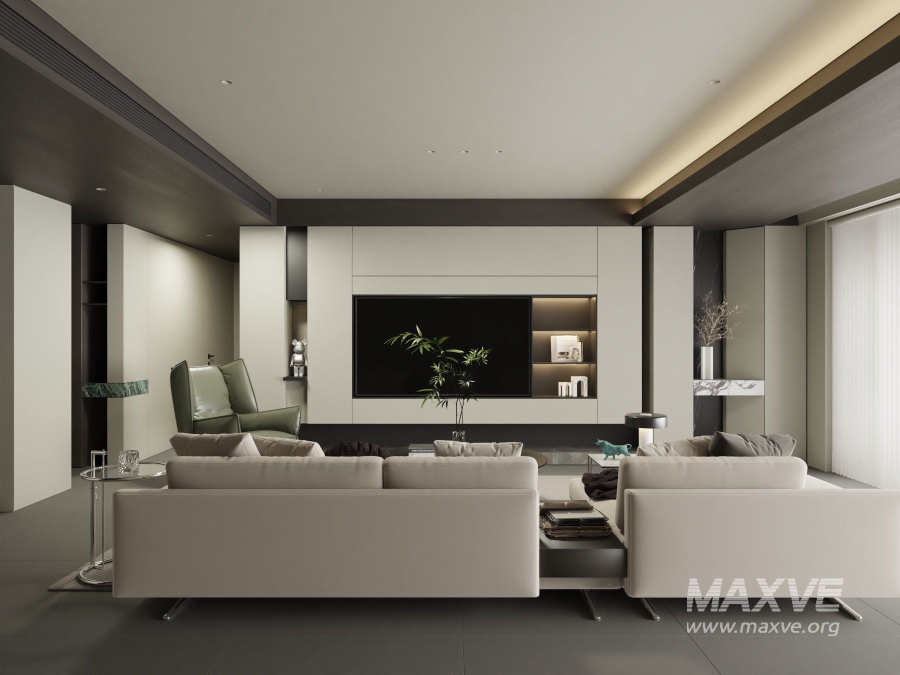 This Modern living room 3D scene was built in 3ds Max 2021 and rendered using Vray. It includes clean geometry, proper scene organization, and is optimized for smooth rendering performance. The model setup follows standard practices, making it easy to import and adapt into a variety of workflows. Delivered in MAX format, it is well-suited for architectural visualization, concept development, or design presentation. Dominant color tones include: White tones, Pink tones, Green tones, Beige tones, Silver tones, Gray tones.