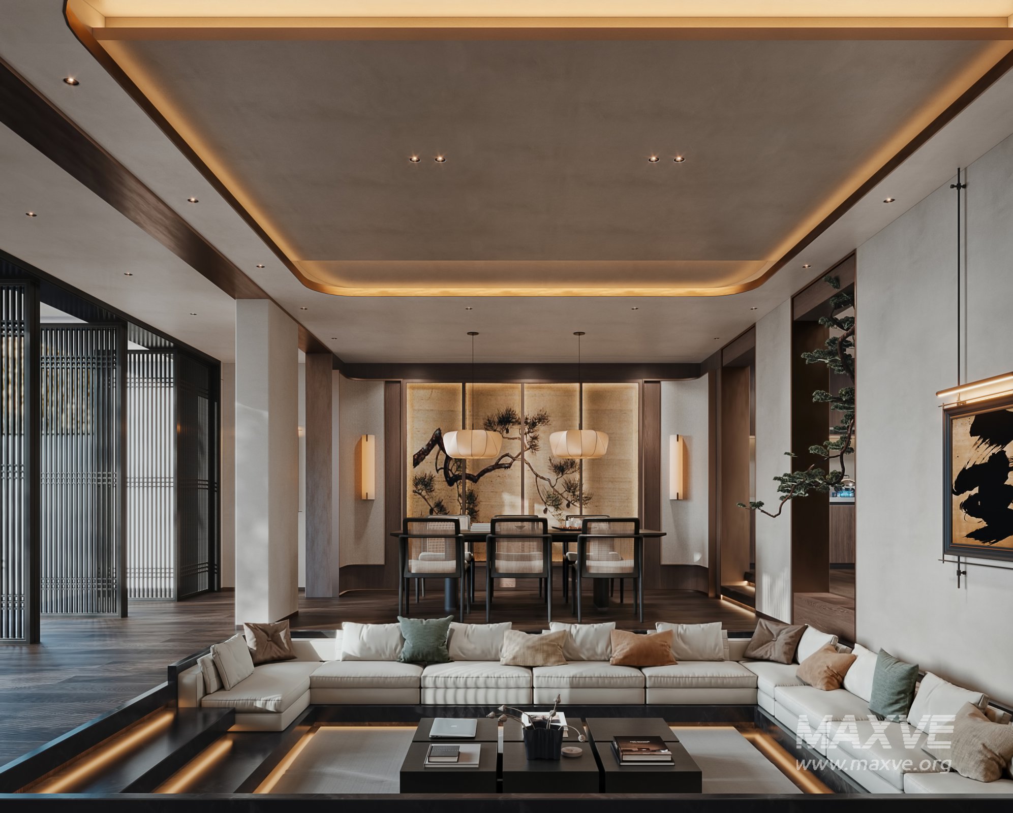 This Modern living room dining room 3D scene was built in 3ds Max 2021 and rendered using Corona. It includes clean geometry, proper scene organization, and is optimized for smooth rendering performance. The model setup follows standard practices, making it easy to import and adapt into a variety of workflows. Delivered in MAX format, it is well-suited for architectural visualization, concept development, or design presentation. Dominant color tones include: White tones, Beige tones, Gray tones, Black tones.