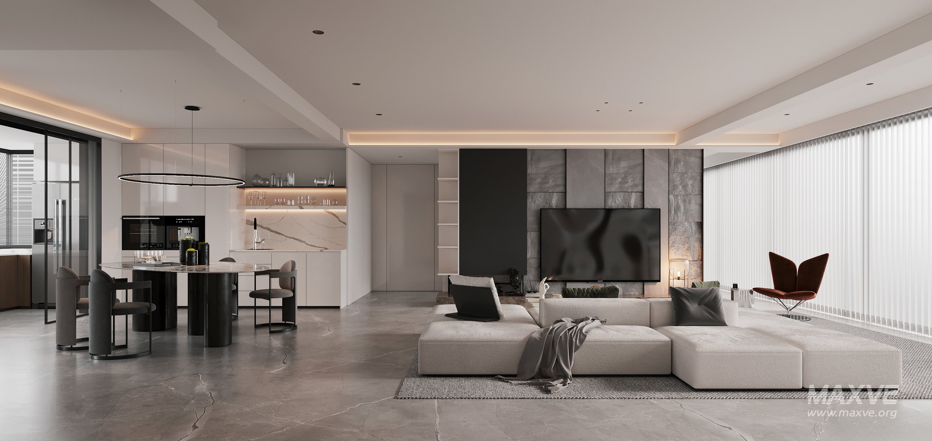 This Modern living room dining room 3D scene was built in 3ds Max 2021 and rendered using Corona. It includes clean geometry, proper scene organization, and is optimized for smooth rendering performance. The model setup follows standard practices, making it easy to import and adapt into a variety of workflows. Delivered in MAX format, it is well-suited for architectural visualization, concept development, or design presentation. Dominant color tones include: White tones, Orange tones, Beige tones, Silver tones.