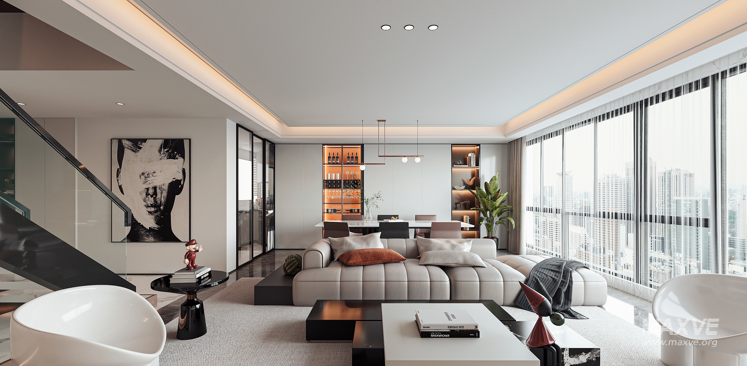 This Modern living room dining room 3D scene was built in 3ds Max 2021 and rendered using Corona. It includes clean geometry, proper scene organization, and is optimized for smooth rendering performance. The model setup follows standard practices, making it easy to import and adapt into a variety of workflows. Delivered in MAX format, it is well-suited for architectural visualization, concept development, or design presentation. Dominant color tones include: White tones, Beige tones, Silver tones, Gray tones.
