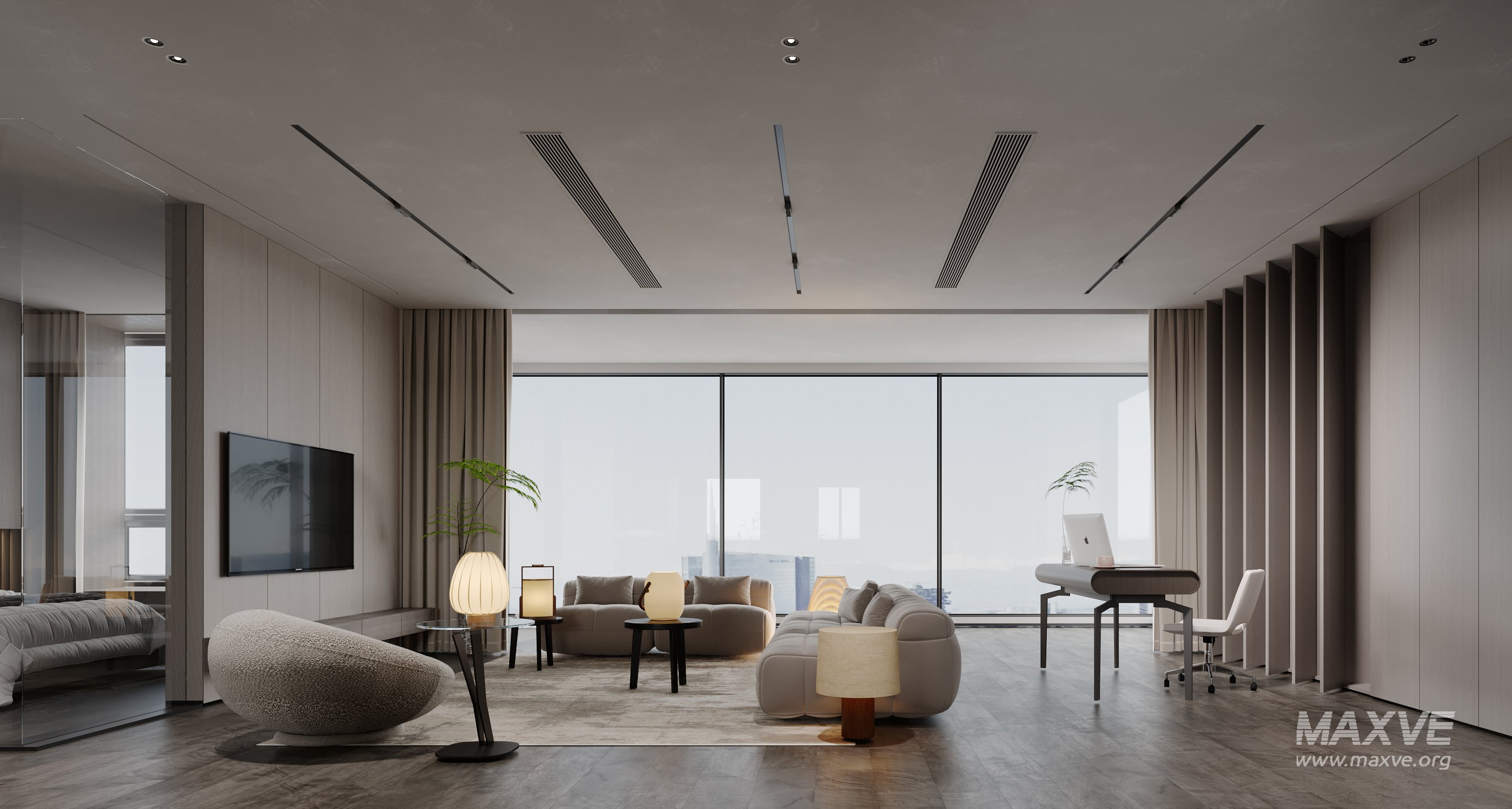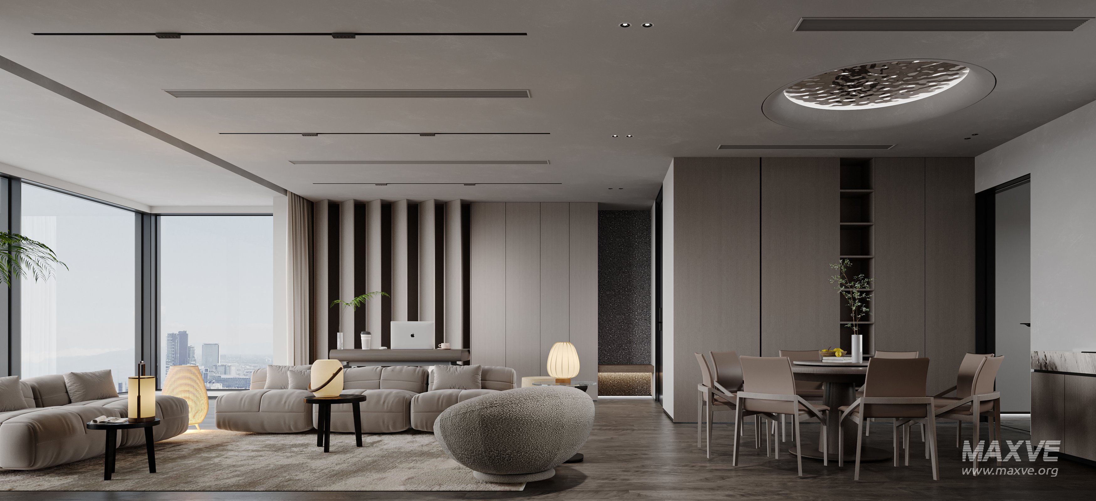 This Modern living room dining room 3D scene was built in 3ds Max 2021 and rendered using Corona. It includes clean geometry, proper scene organization, and is optimized for smooth rendering performance. The model setup follows standard practices, making it easy to import and adapt into a variety of workflows. Delivered in MAX format, it is well-suited for architectural visualization, concept development, or design presentation. Dominant color tones include: White tones, Beige tones.