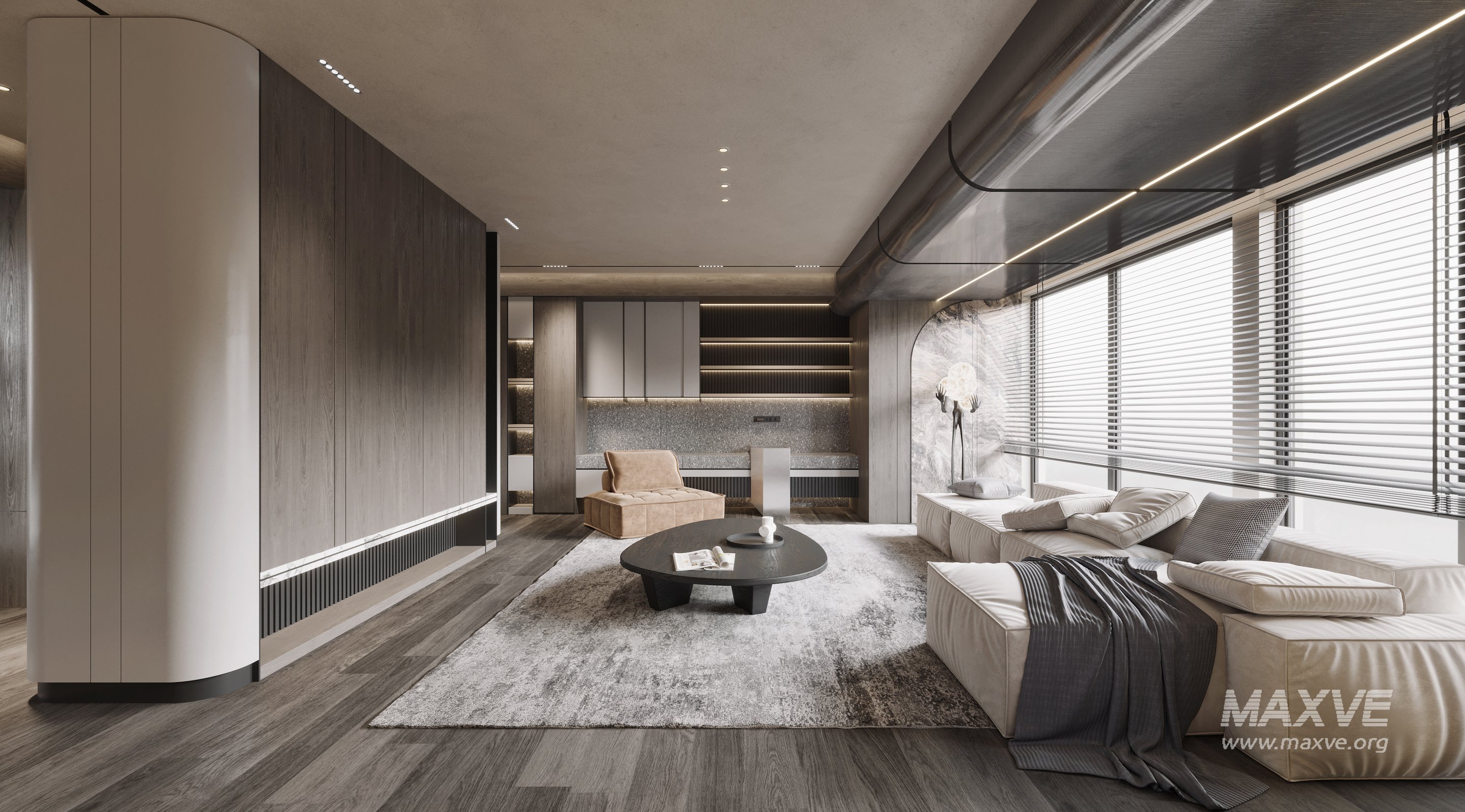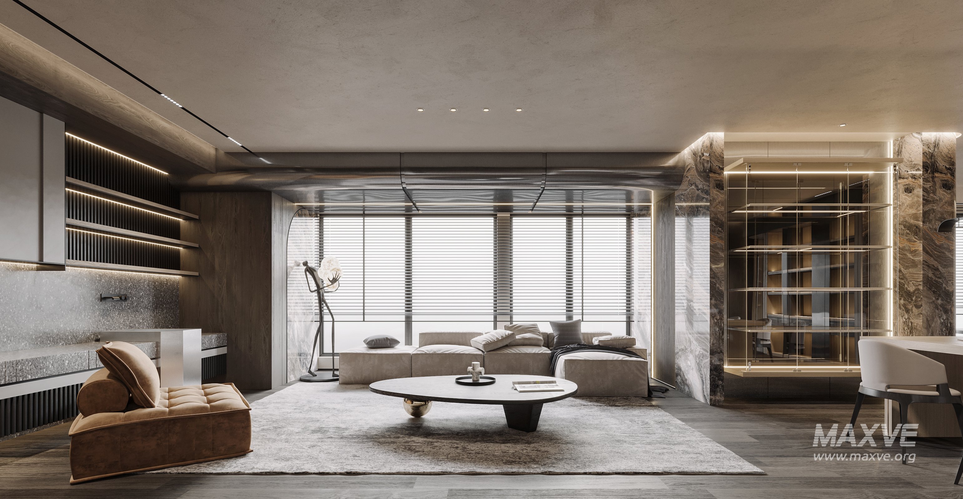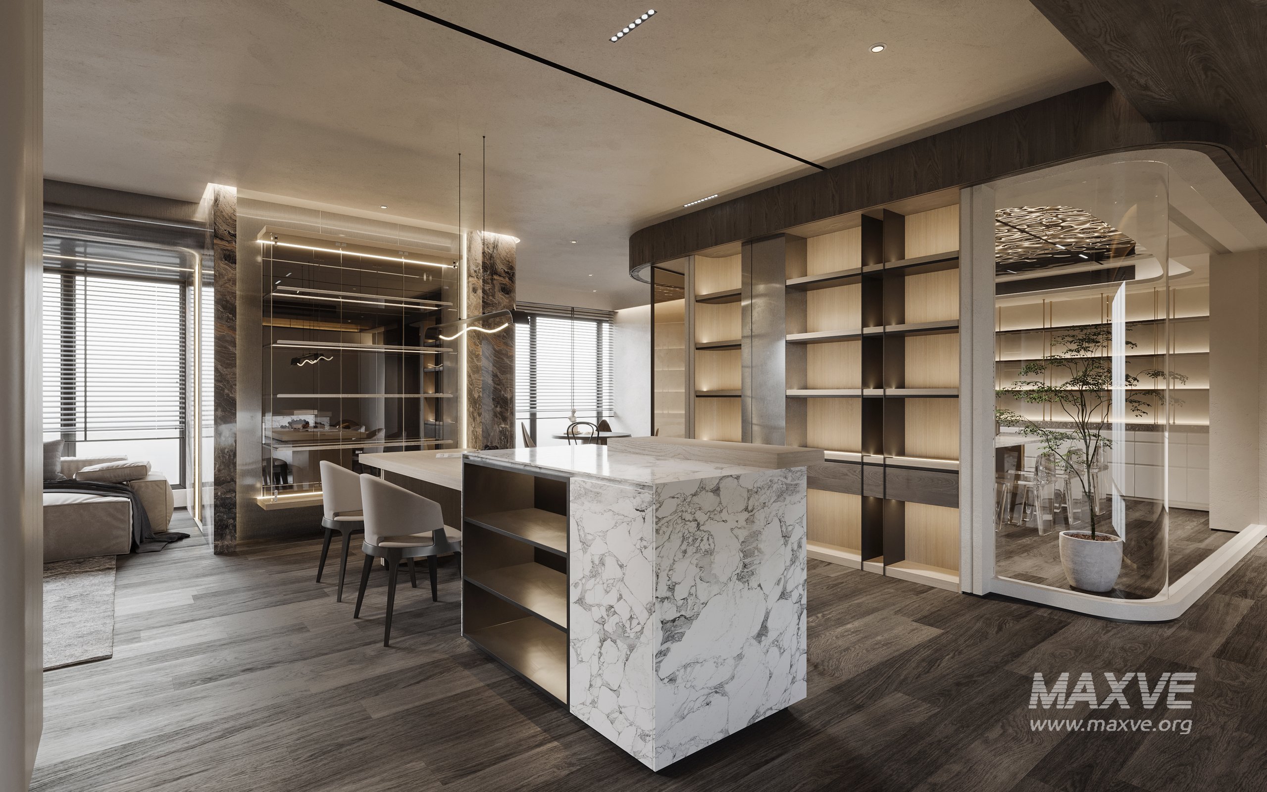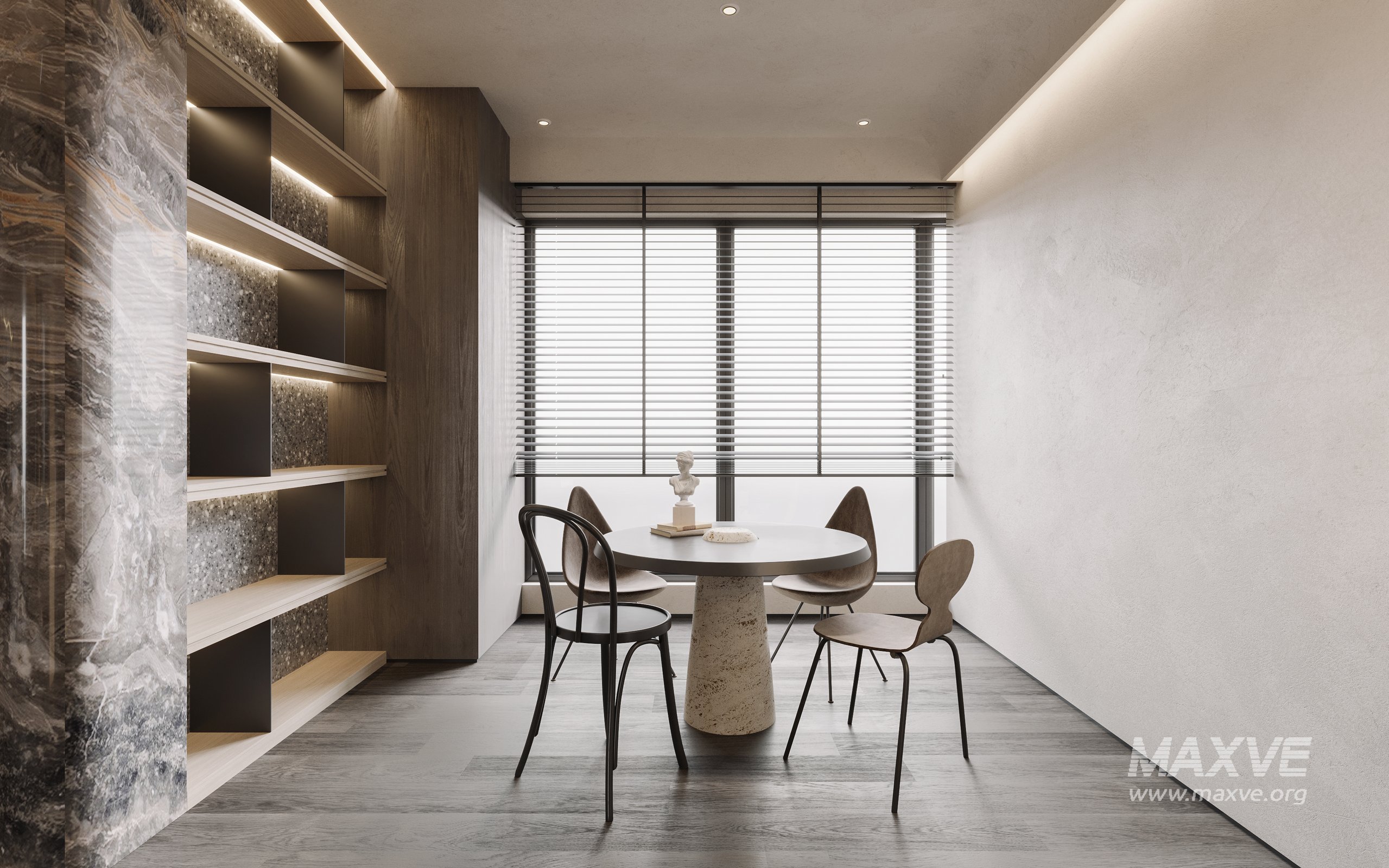 This fully textured interior scene with natural light setup is ready to render with Corona Renderer for 3D Studio MAX. This file does not have any type of protection. You can reuse the scene, the render settings, the lights, the materials, but above all, you can learn from the file by moving inside the project, observing how the light was created and handled, how materials are developed, what role each texture plays within them, and the values used in every single option.