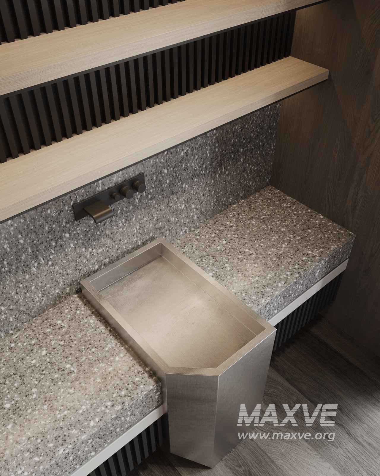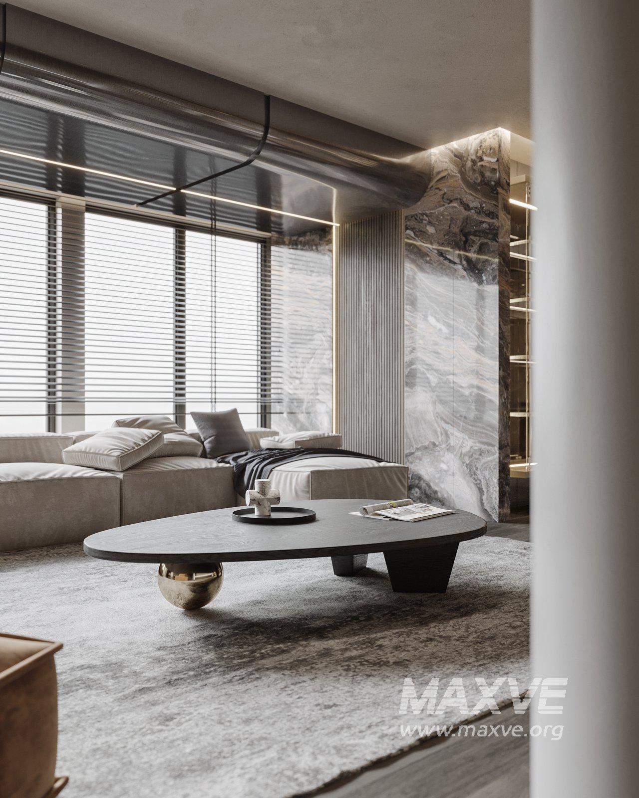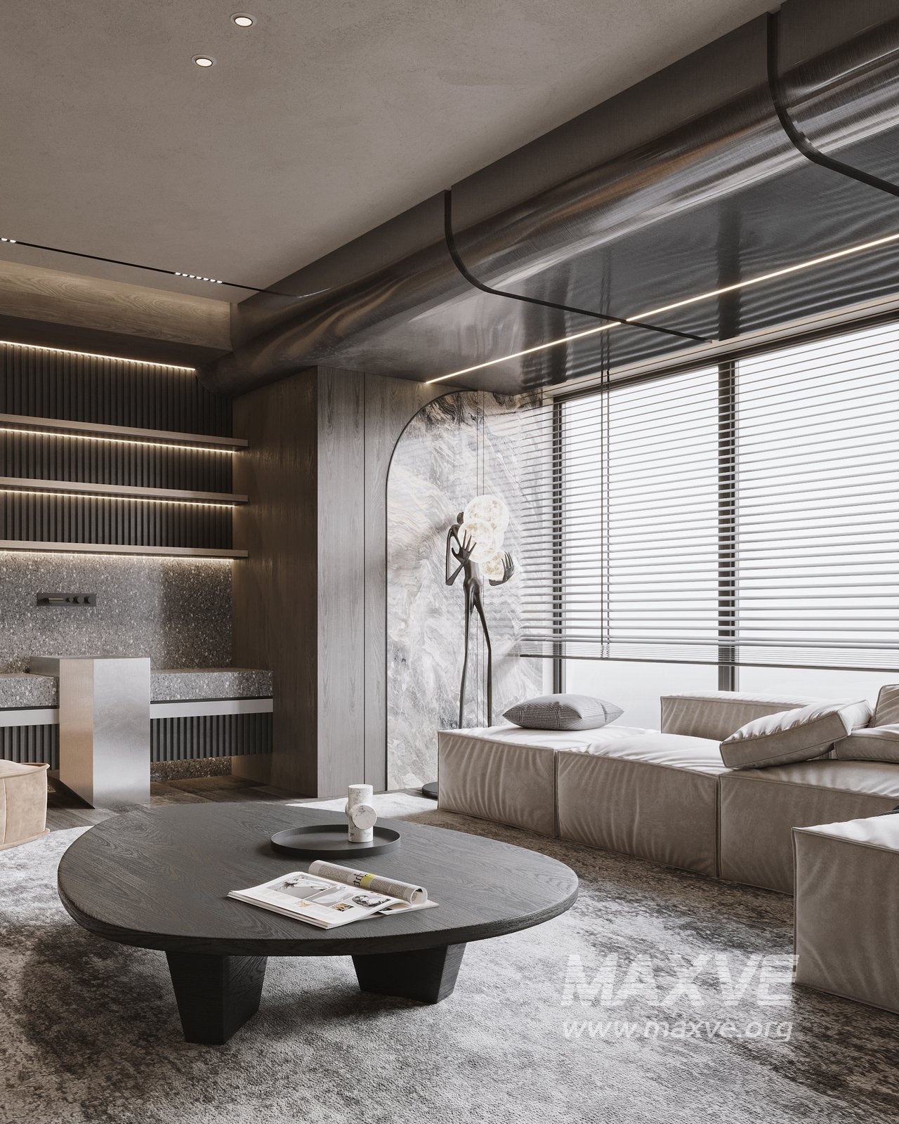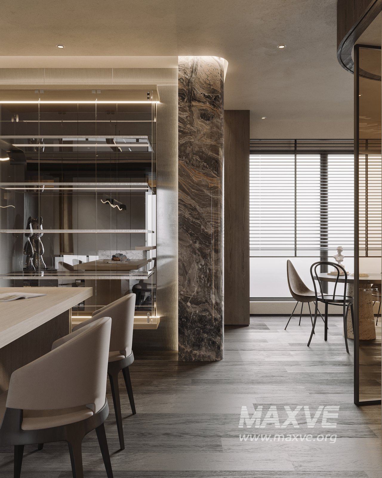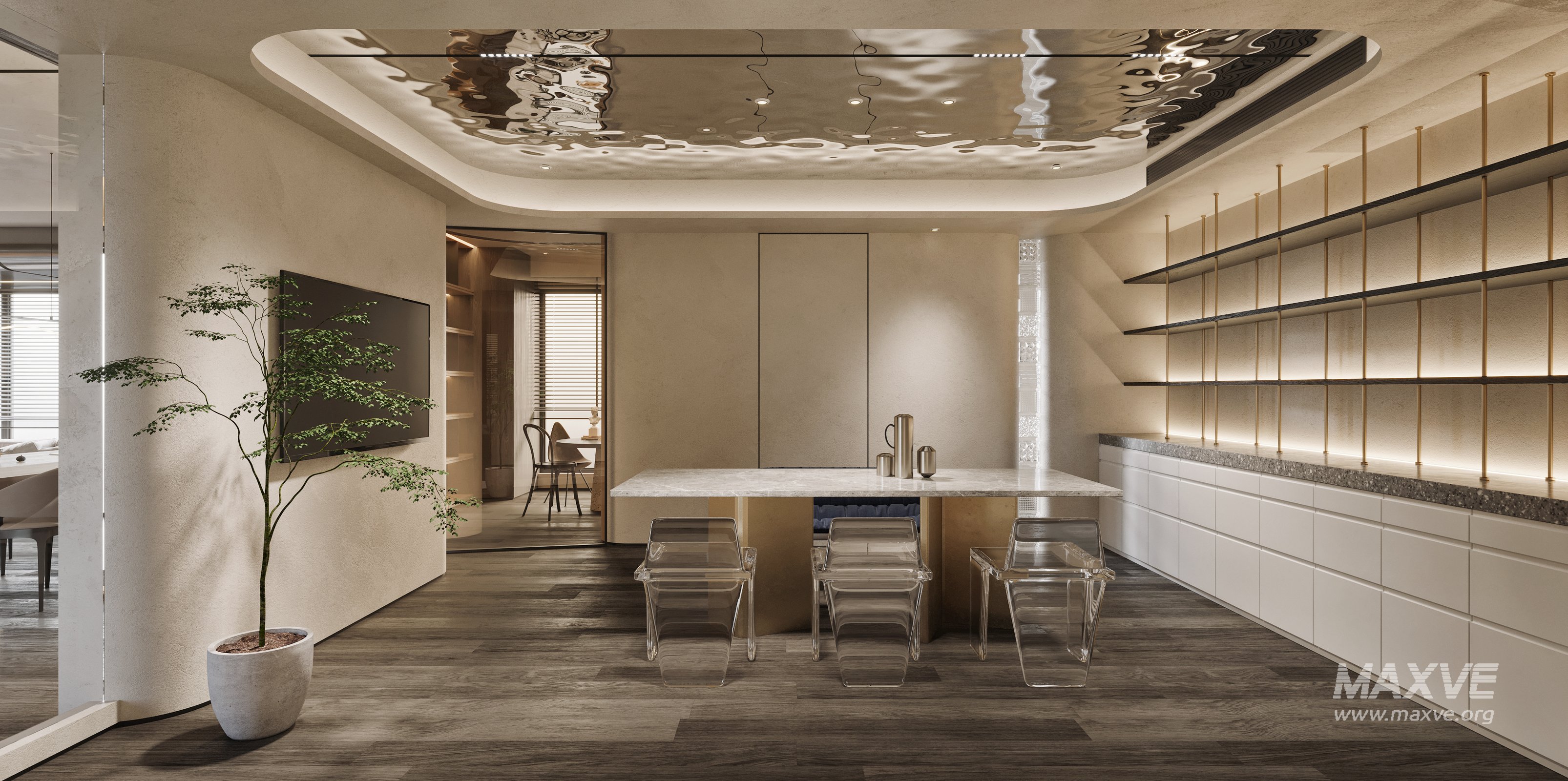 This fully textured interior scene with natural light setup is ready to render with Corona Renderer for 3D Studio MAX. This file does not have any type of protection. You can reuse the scene, the render settings, the lights, the materials, but above all, you can learn from the file by moving inside the project, observing how the light was created and handled, how materials are developed, what role each texture plays within them, and the values used in every single option.