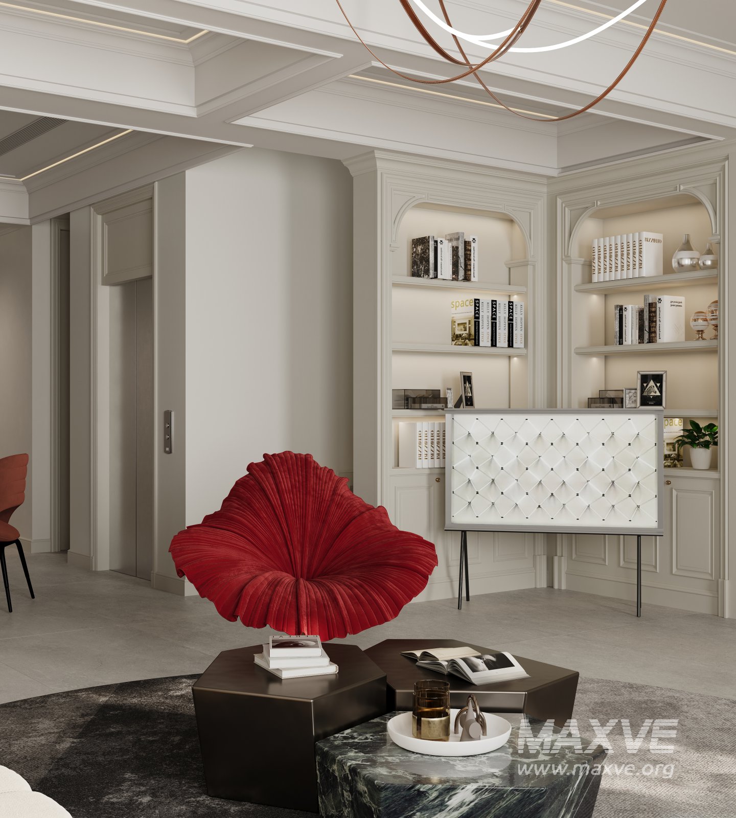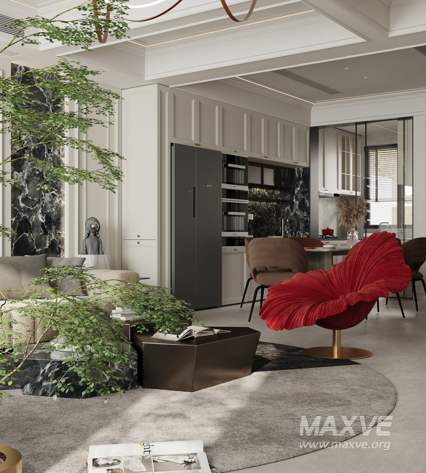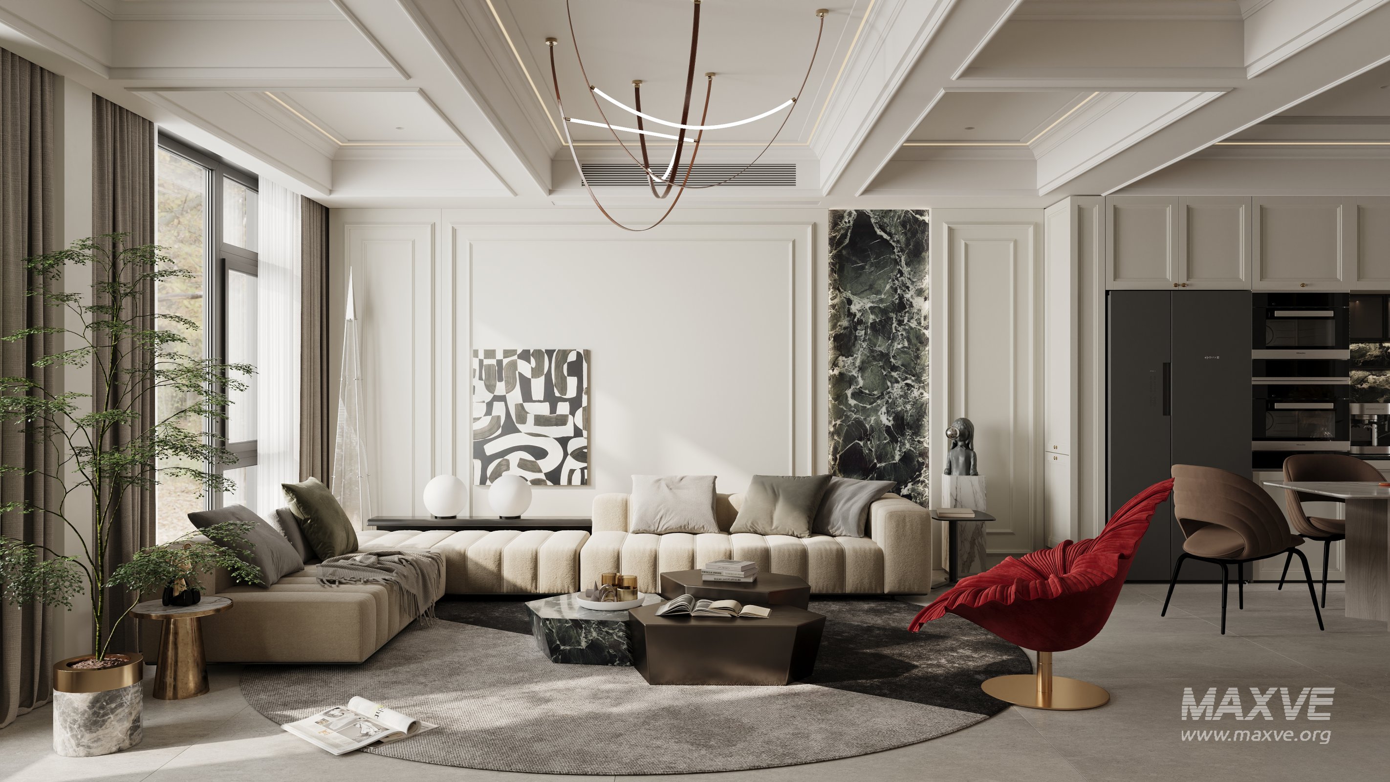 This Modern Luxurious living room and dining room 3D scene was built in 3ds Max 2021 and rendered using Corona. It includes clean geometry, proper scene organization, and is optimized for smooth rendering performance. The model setup follows standard practices, making it easy to import and adapt into a variety of workflows. Delivered in MAX format, it is well-suited for architectural visualization, concept development, or design presentation. Dominant color tones include: White tones, Beige tones, Silver tones, Gray tones.