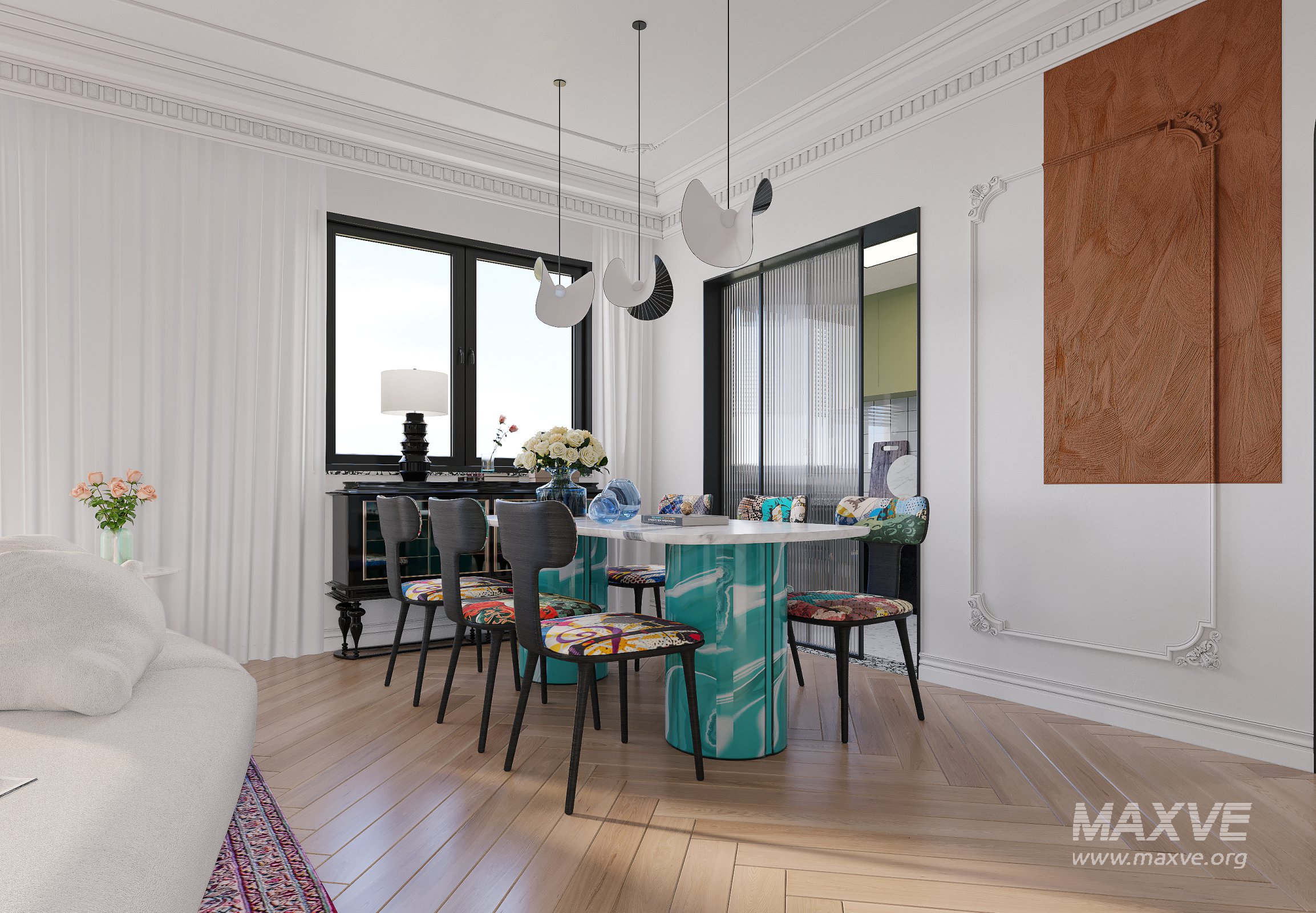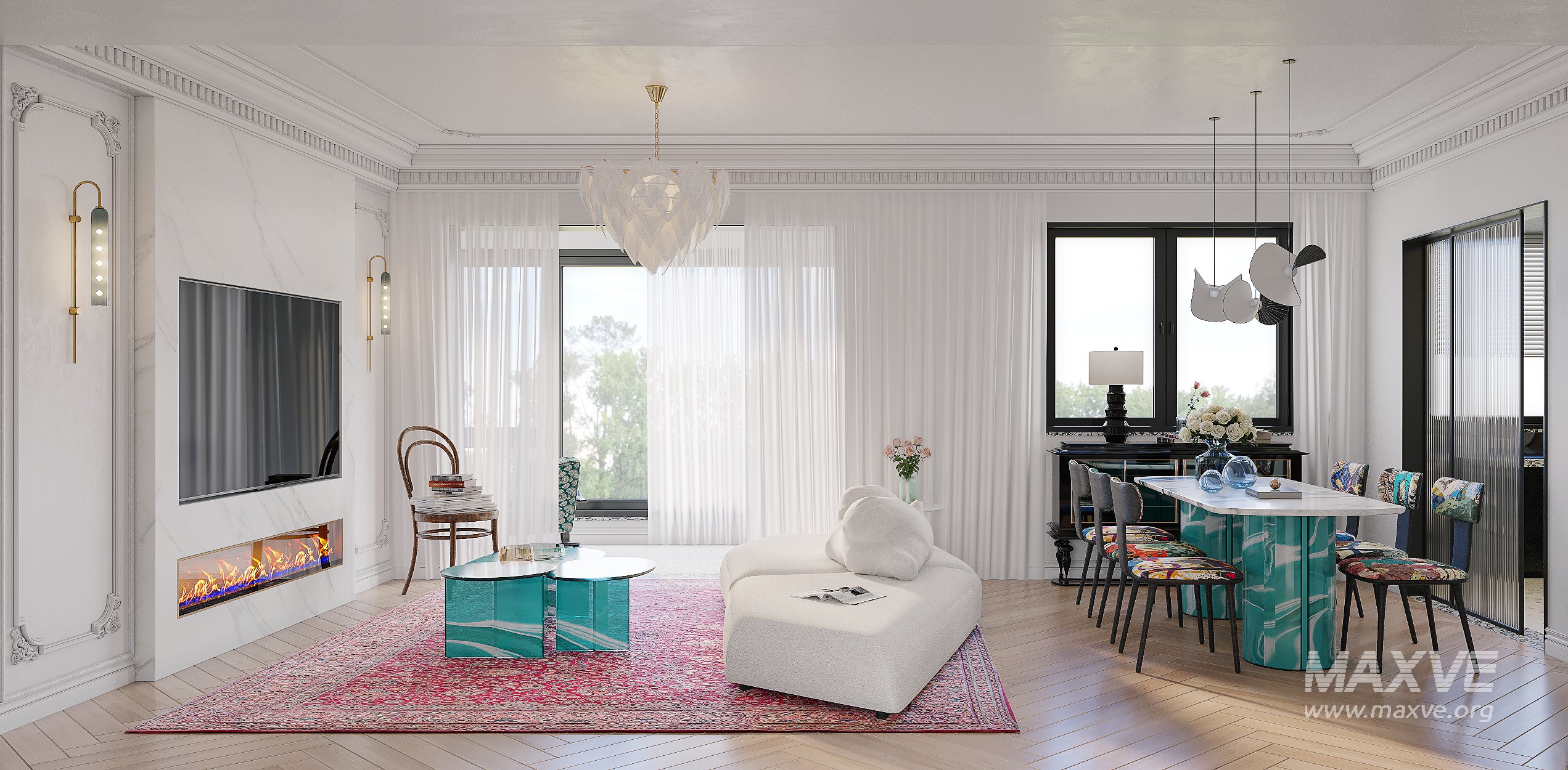 This Modern Luxurious living room and dining room bedroom 3D scene was built in 3ds Max 2021 and rendered using Corona. It includes clean geometry, proper scene organization, and is optimized for smooth rendering performance. The model setup follows standard practices, making it easy to import and adapt into a variety of workflows. Delivered in MAX format, it is well-suited for architectural visualization, concept development, or design presentation. Dominant color tones include: White tones, Orange tones, Cyan tones, Beige tones, Gray tones.