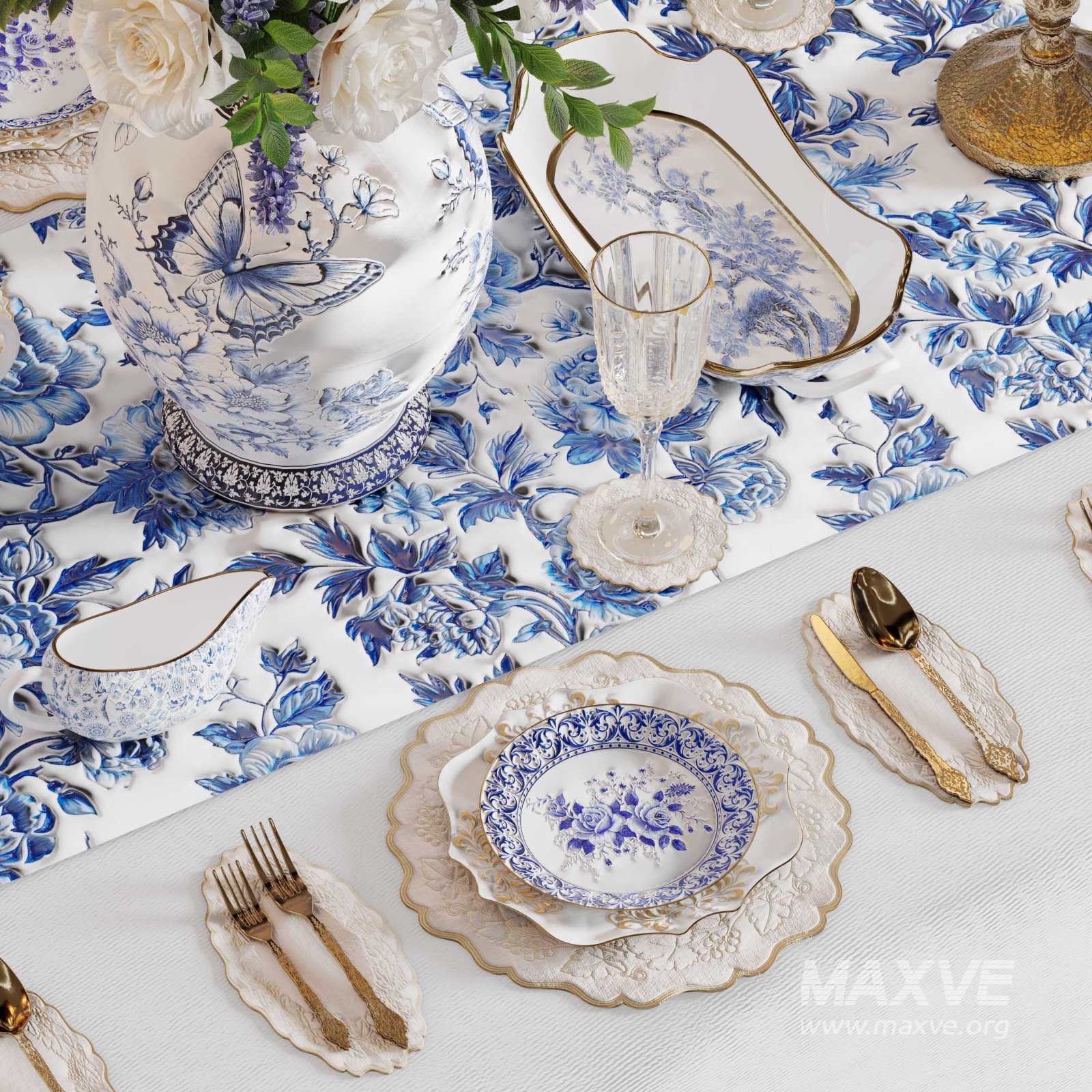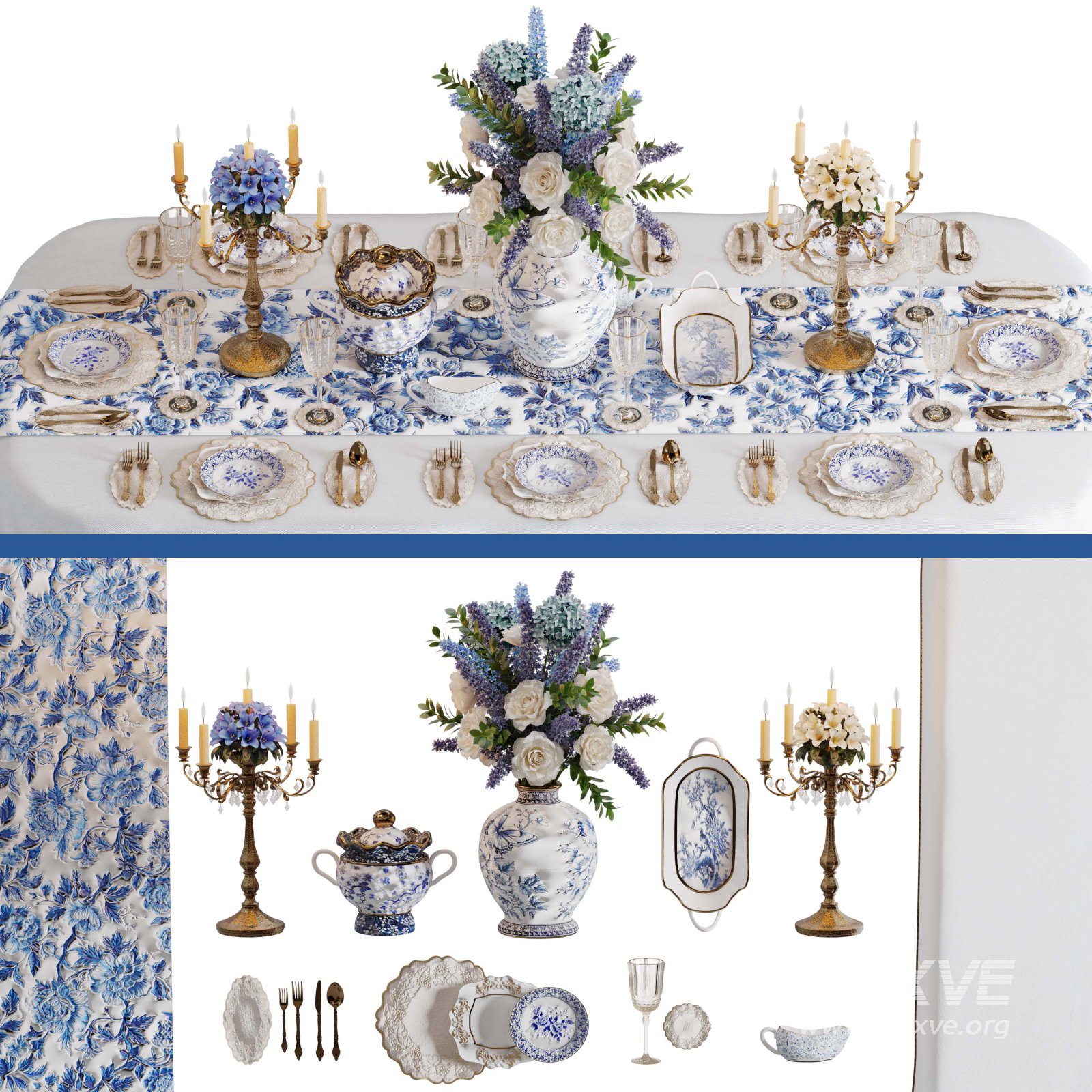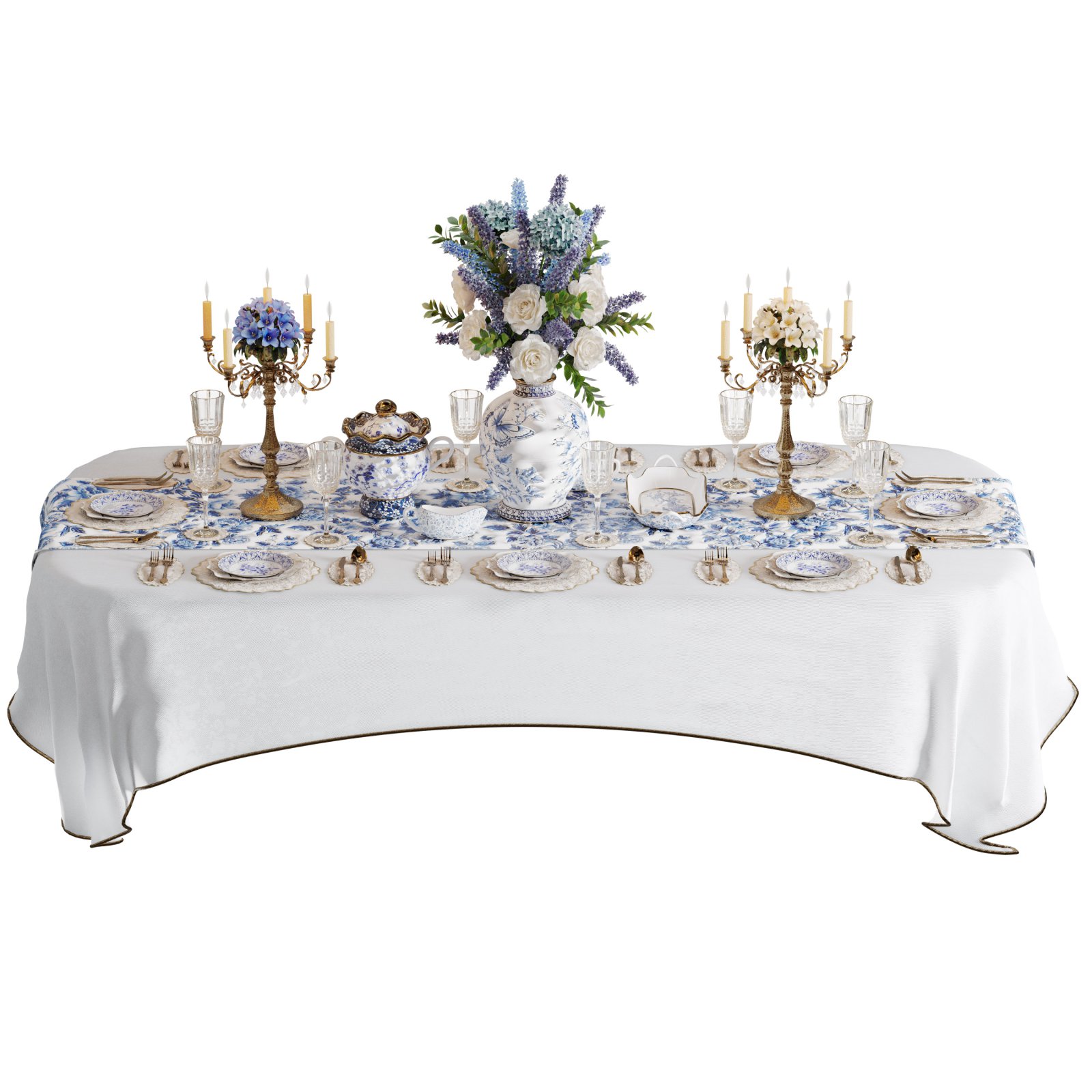 A highly detailed 3D model of a luxury dining table set in blue and white tones. The scene features elegant porcelain tableware, golden cutlery, floral arrangements, and vintage candelabras — perfect for classic or royal-style interiors. Ideal for dining room renders, wedding setups, and luxury banquet scenes.