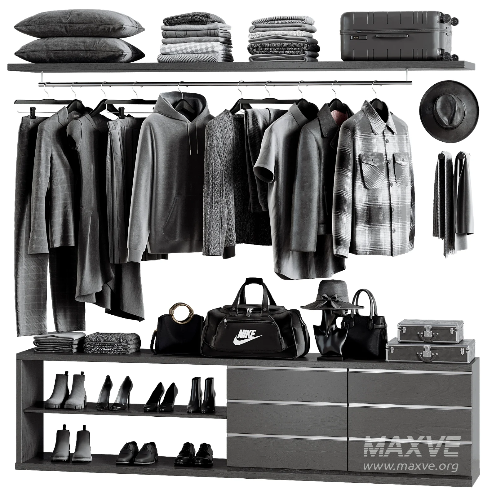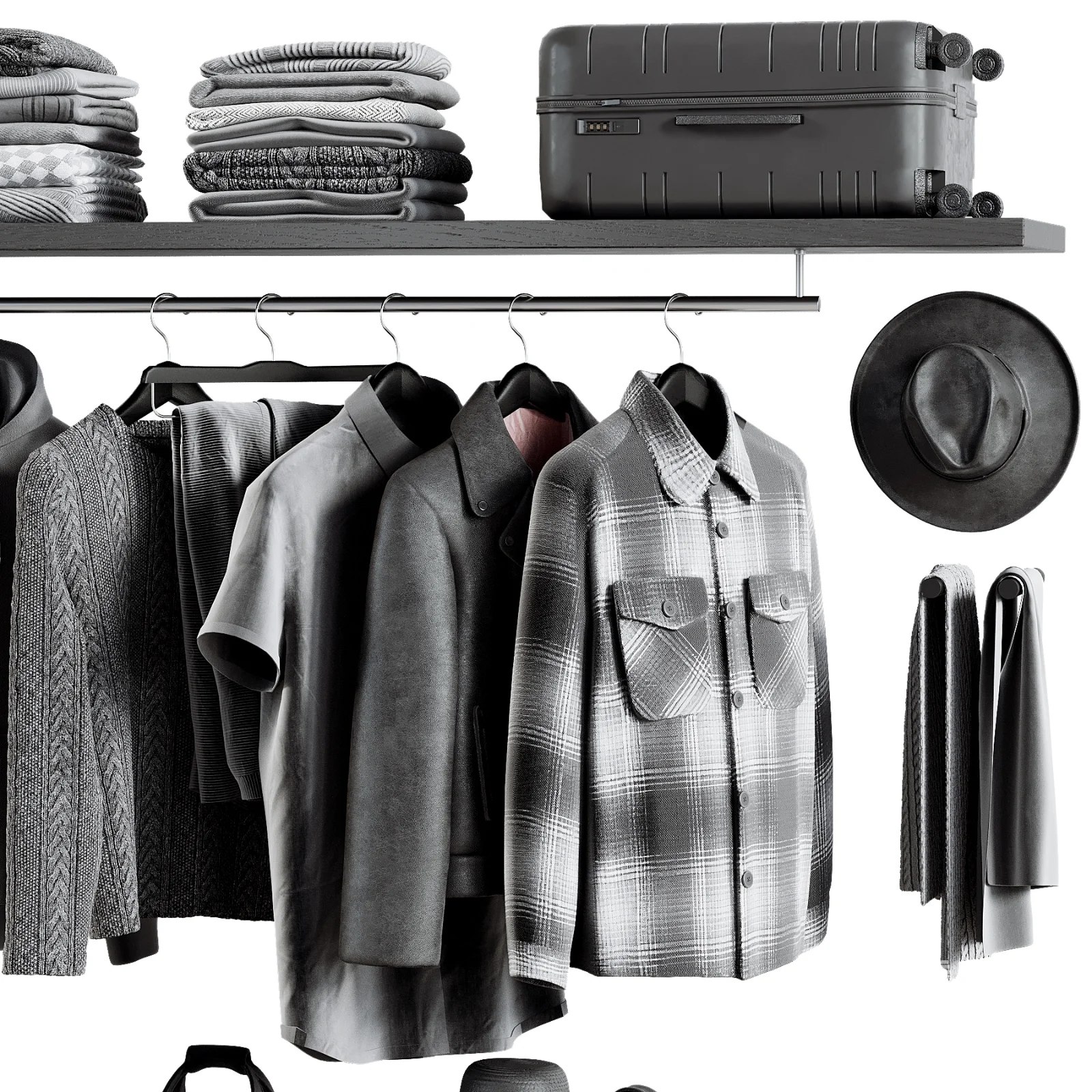 A modern minimal wardrobe setup featuring clothing, shoes, and accessories in a neutral color palette. Ideal for interior visualization, fashion retail design, wardrobe concepts, and lifestyle presentations.