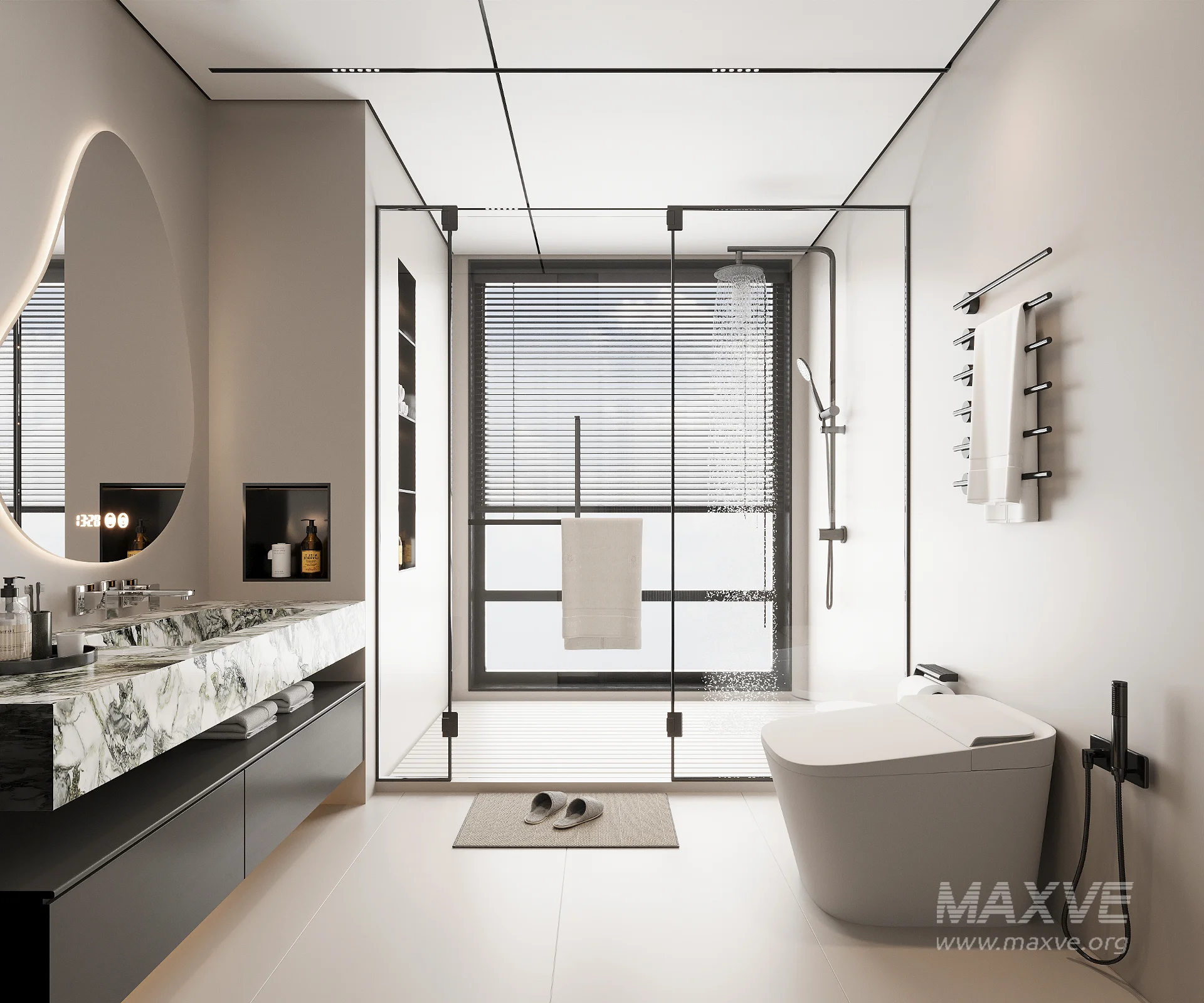 This modern bathroom 3D scene was built in 3ds Max 2018 and rendered using Vray. It includes clean geometry, proper scene organization, and is optimized for smooth rendering performance. The model setup follows standard practices, making it easy to import and adapt into a variety of workflows. Delivered in MAX format, it is well-suited for architectural visualization, concept development, or design presentation.