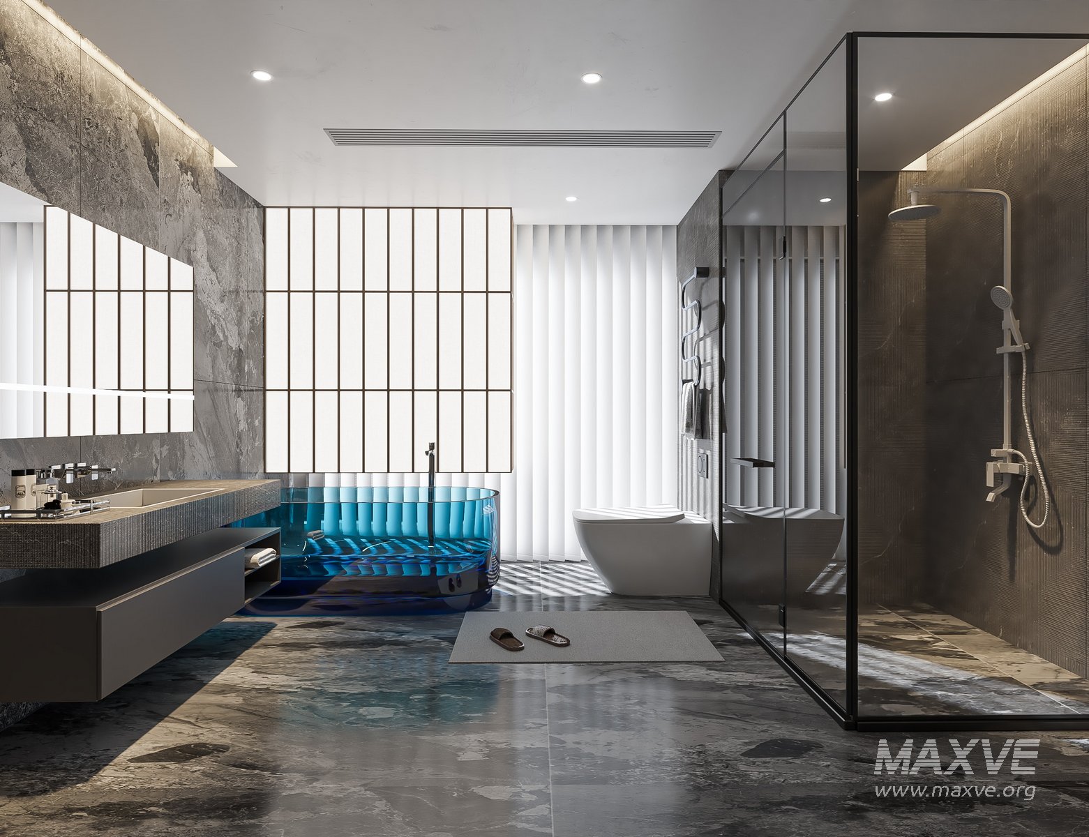This Modern bathroom 3D scene was built in 3ds Max 2018 and rendered using Vray. It includes clean geometry, proper scene organization, and is optimized for smooth rendering performance. The model setup follows standard practices, making it easy to import and adapt into a variety of workflows. Delivered in MAX format, it is well-suited for architectural visualization, concept development, or design presentation.