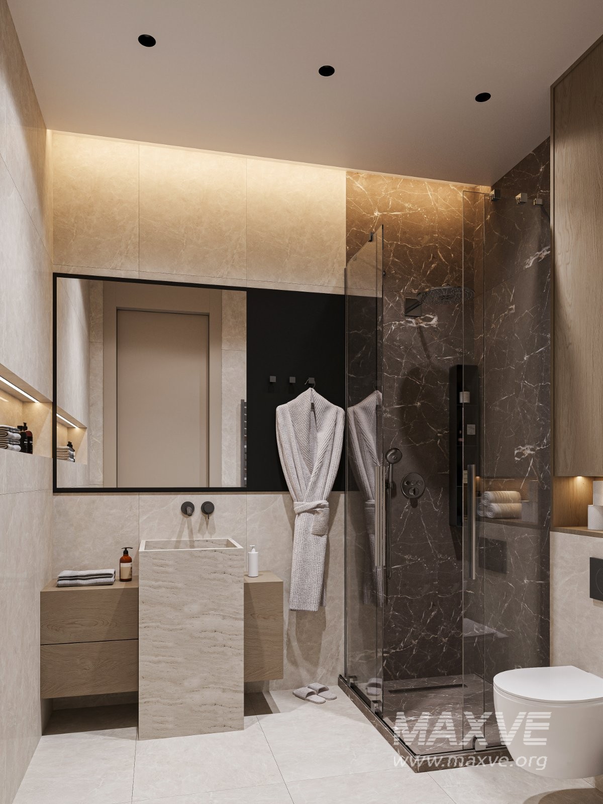 This bathroom interior showcases a perfect balance between modern design and functional comfort. Natural stone textures, neutral color tones, and wooden elements create a calm and harmonious atmosphere.
