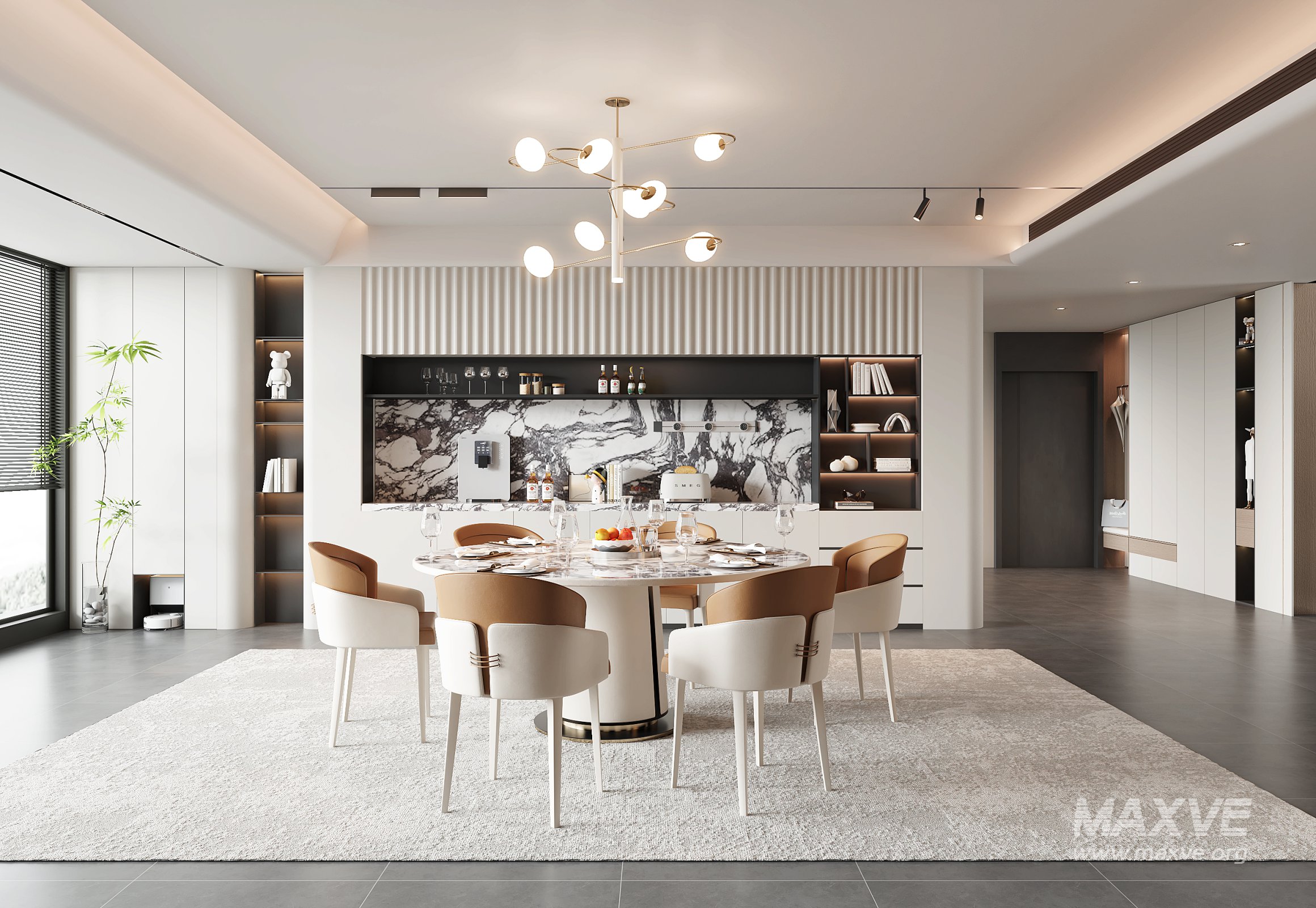This Modern dining room 3D scene was built in 3ds Max 2018 and rendered using Vray. It includes clean geometry, proper scene organization, and is optimized for smooth rendering performance. The model setup follows standard practices, making it easy to import and adapt into a variety of workflows. Delivered in MAX format, it is well-suited for architectural visualization, concept development, or design presentation.