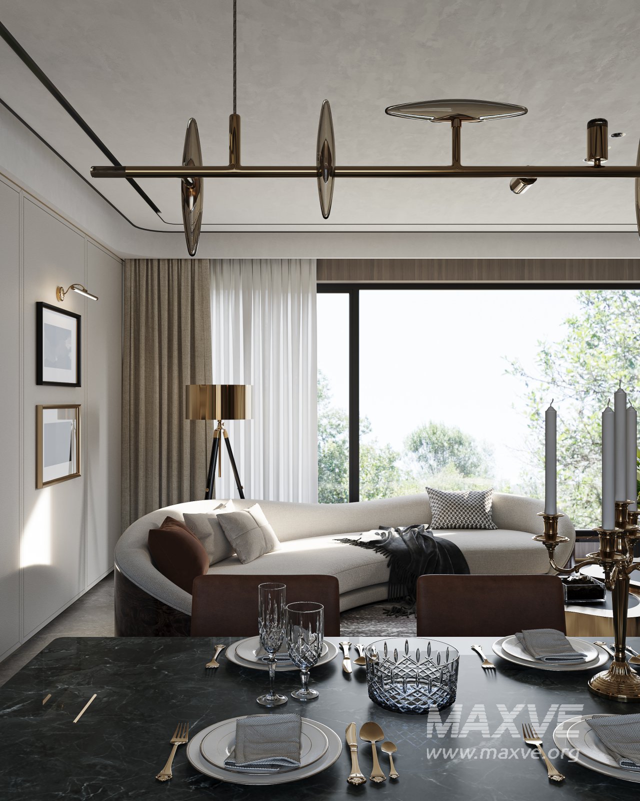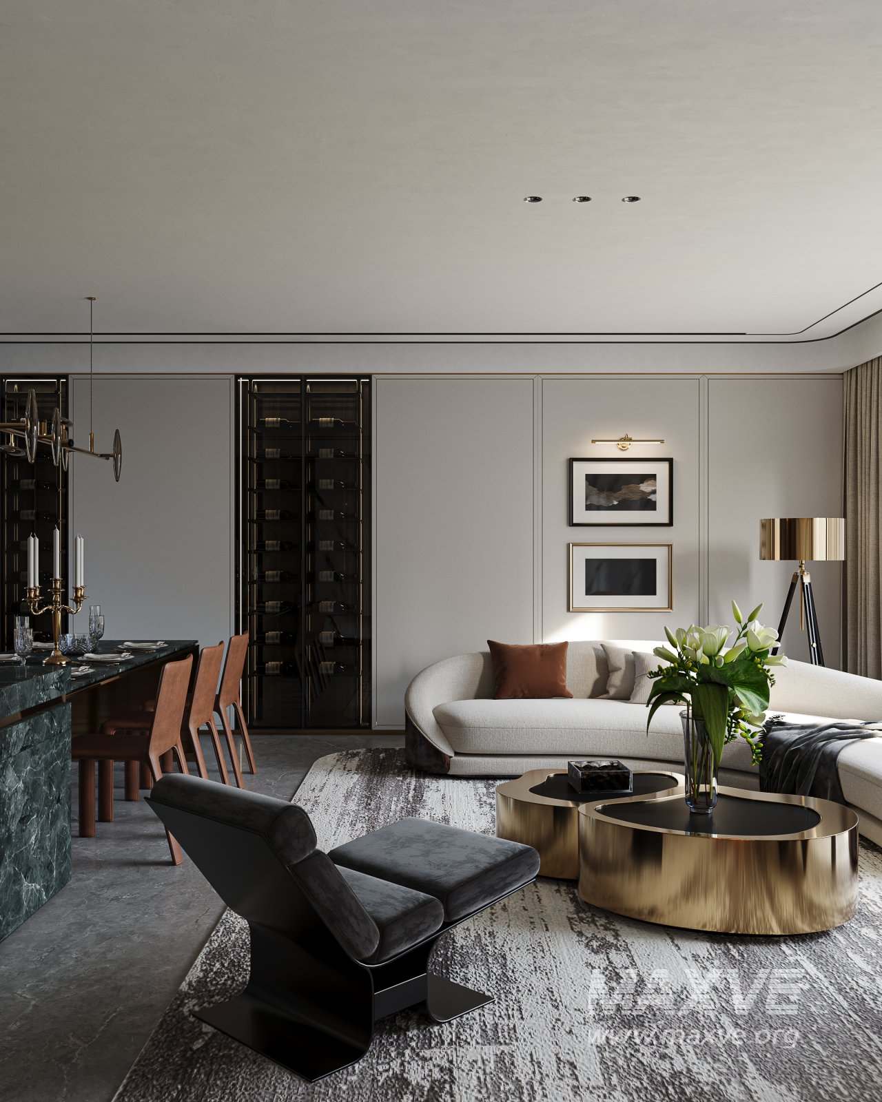 This Modern living and dining room 3D scene was built in 3ds Max 2021 and rendered using Corona. It includes clean geometry, proper scene organization, and is optimized for smooth rendering performance. The model setup follows standard practices, making it easy to import and adapt into a variety of workflows. Delivered in MAX format, it is well-suited for architectural visualization, concept development, or design presentation. Dominant color tones include: Dark green tones, Beige tones, Silver tones.
