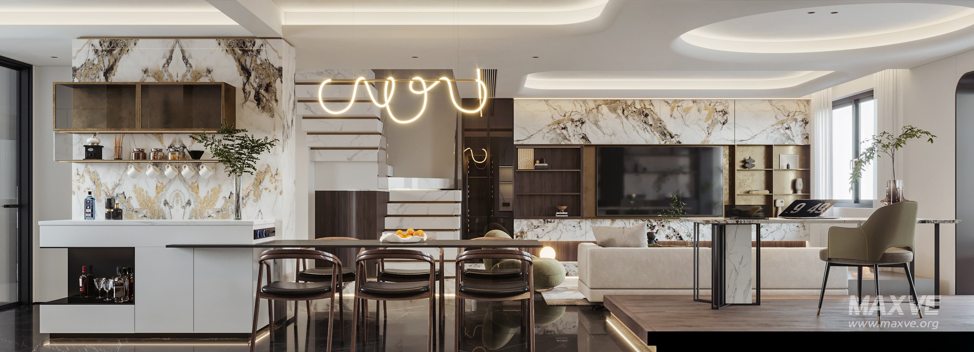 This Modern living room and dining room interior scene 3D scene was built in 3ds Max 2021 and rendered using Corona. It includes clean geometry, proper scene organization, and is optimized for smooth rendering performance. The model setup follows standard practices, making it easy to import and adapt into a variety of workflows. Delivered in MAX format, it is well-suited for architectural visualization, concept development, or design presentation. Dominant color tones include: White tones, Beige tones.