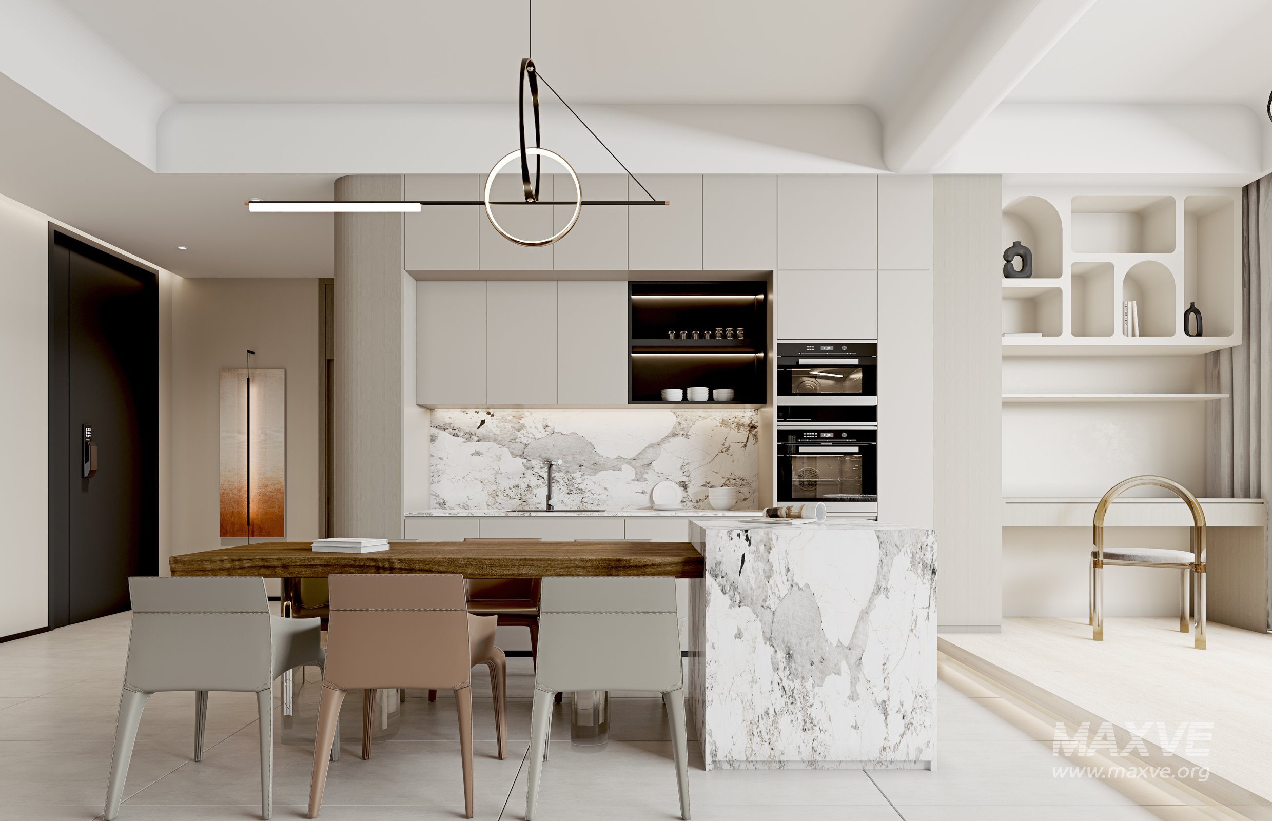 This Modern living room and dining room interior scene 3D scene was built in 3ds Max 2021 and rendered using Corona. It includes clean geometry, proper scene organization, and is optimized for smooth rendering performance. The model setup follows standard practices, making it easy to import and adapt into a variety of workflows. Delivered in MAX format, it is well-suited for architectural visualization, concept development, or design presentation. Dominant color tones include: White tones, Beige tones, Silver tones, Gray tones.