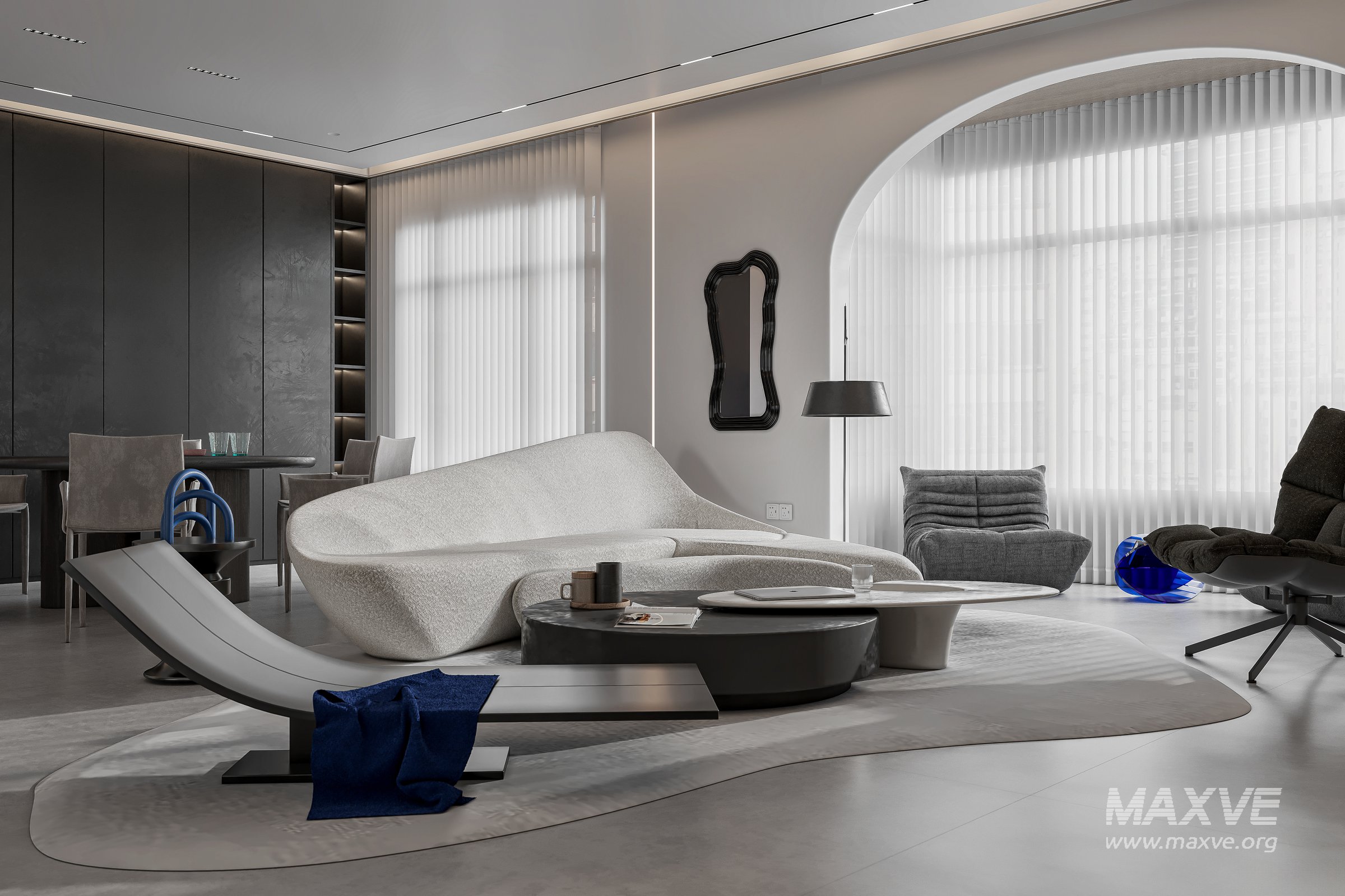 This Modern living room and dining room interior scene 3D scene was built in 3ds Max 2021 and rendered using Corona. It includes clean geometry, proper scene organization, and is optimized for smooth rendering performance. The model setup follows standard practices, making it easy to import and adapt into a variety of workflows. Delivered in MAX format, it is well-suited for architectural visualization, concept development, or design presentation. Dominant color tones include: White tones, Beige tones, Silver tones.