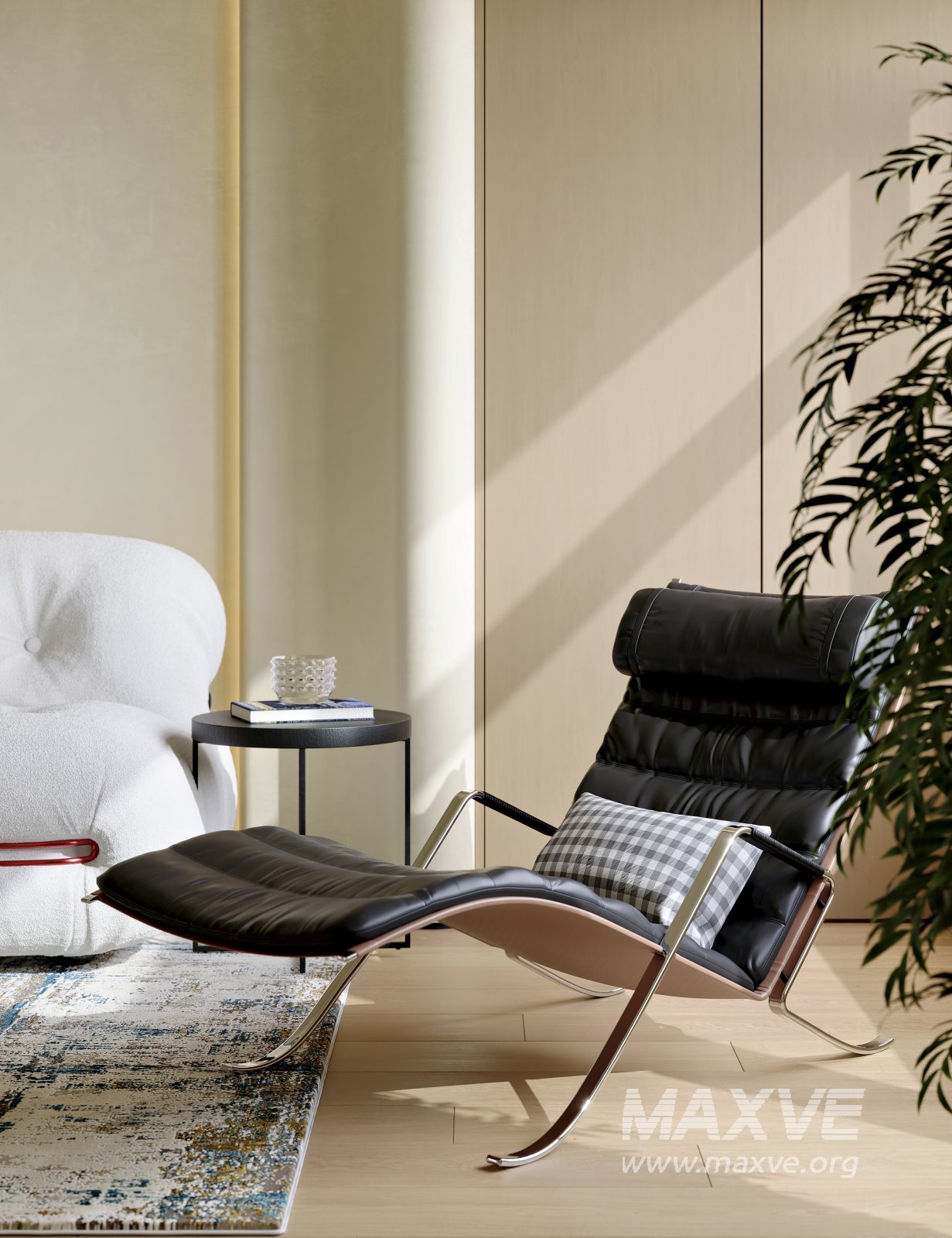 Modern living room and dining room interior scene