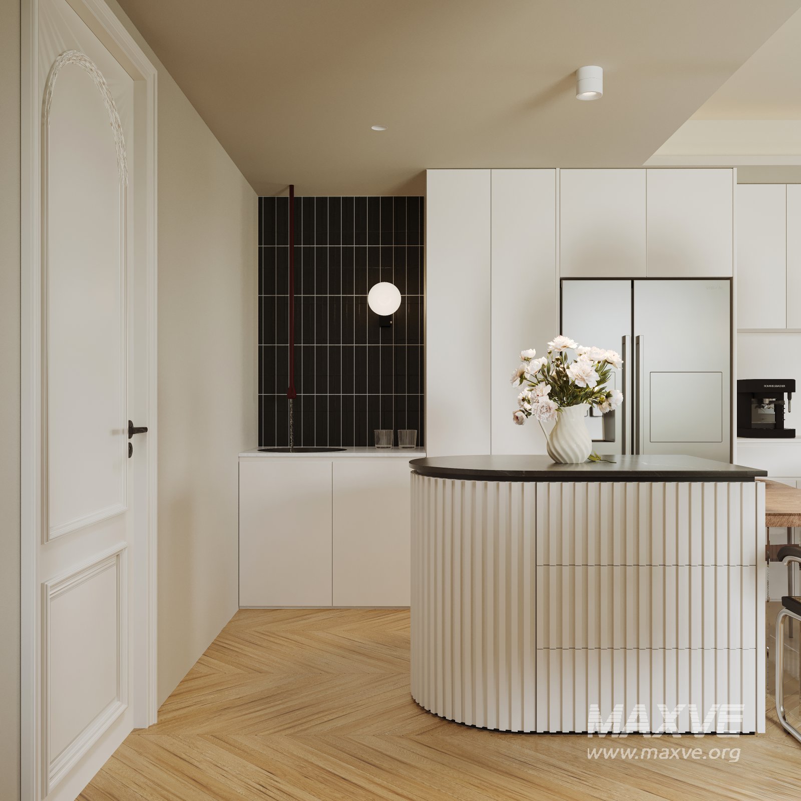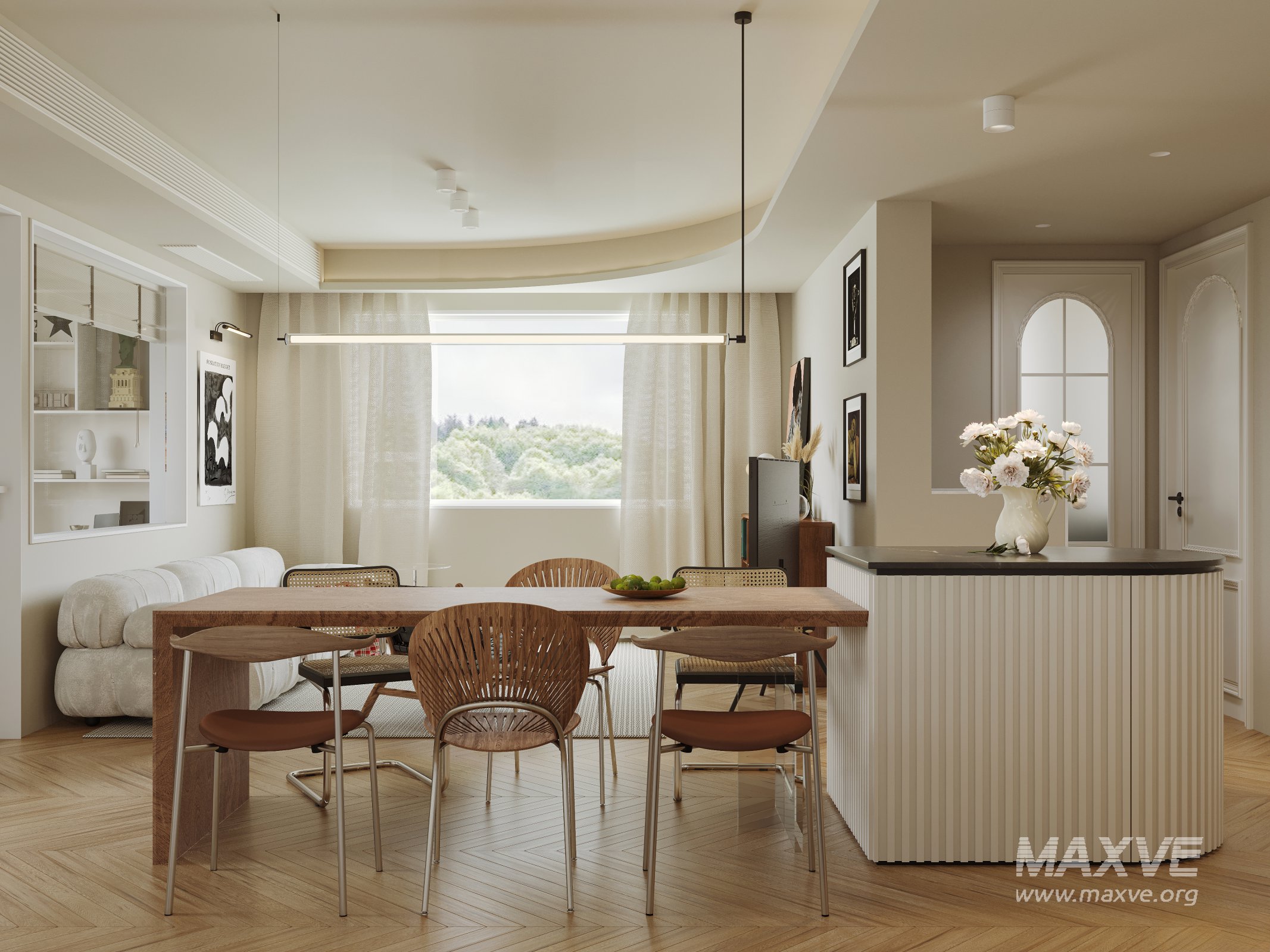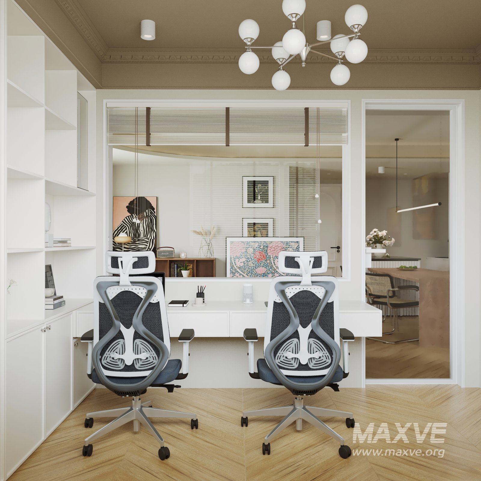 This Modern living room and dining room office room interior scene 3D scene was built in 3ds Max 2021 and rendered using Corona. It includes clean geometry, proper scene organization, and is optimized for smooth rendering performance. The model setup follows standard practices, making it easy to import and adapt into a variety of workflows. Delivered in MAX format, it is well-suited for architectural visualization, concept development, or design presentation. Dominant color tones include: White tones, Beige tones, Silver tones, Gray tones.