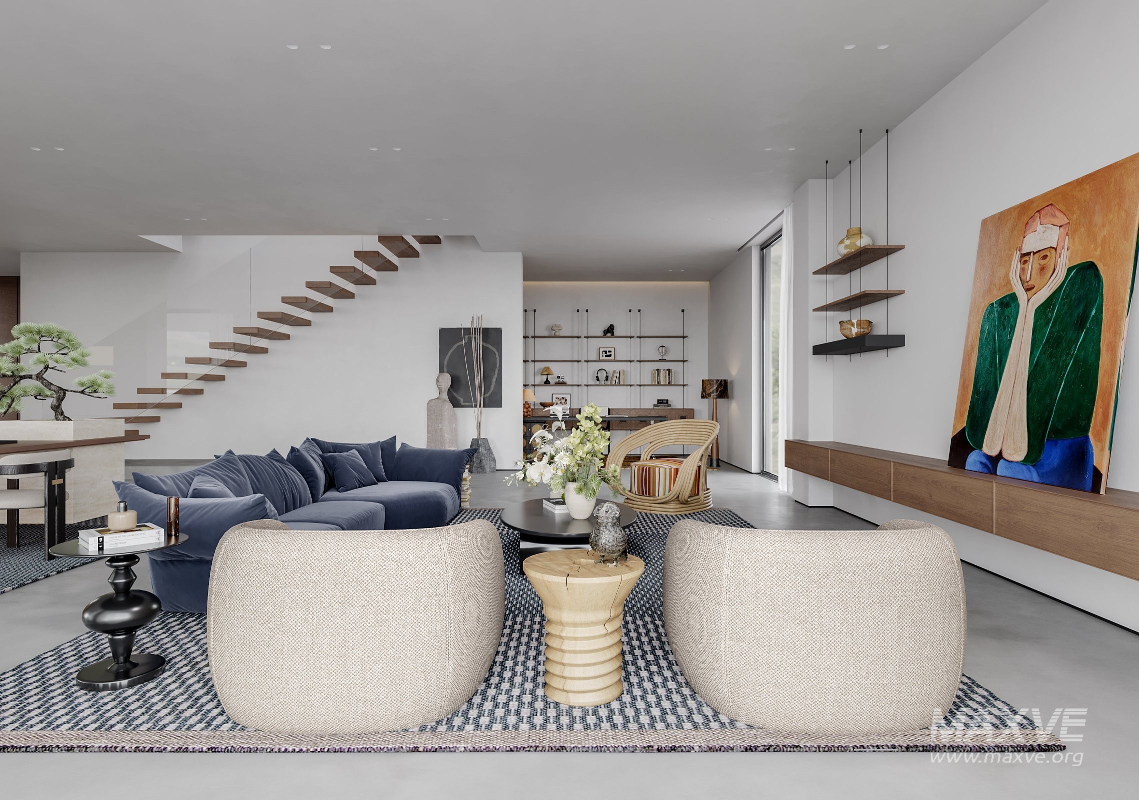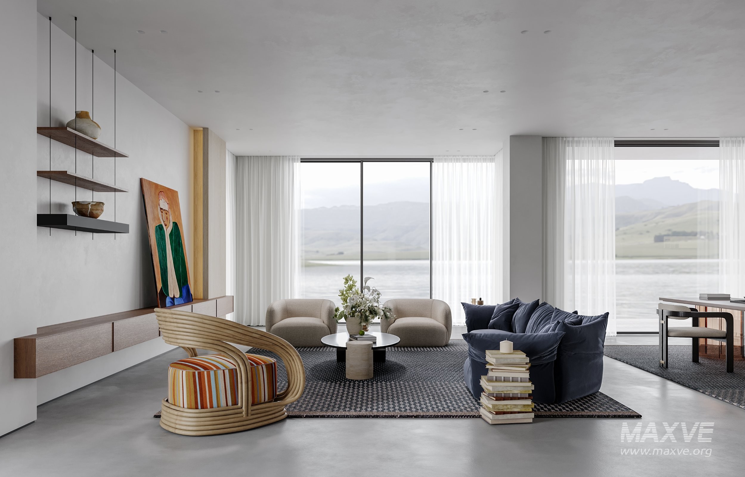 This Modern living room and dining room office room interior scene 3D scene was built in 3ds Max 2021 and rendered using Corona. It includes clean geometry, proper scene organization, and is optimized for smooth rendering performance. The model setup follows standard practices, making it easy to import and adapt into a variety of workflows. Delivered in MAX format, it is well-suited for architectural visualization, concept development, or design presentation. Dominant color tones include: White tones, Beige tones, Silver tones, Gray tones.