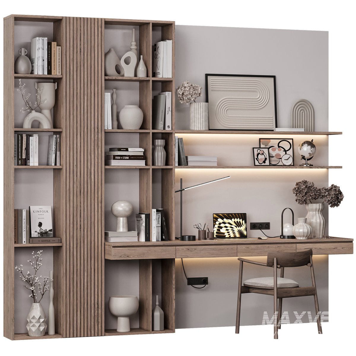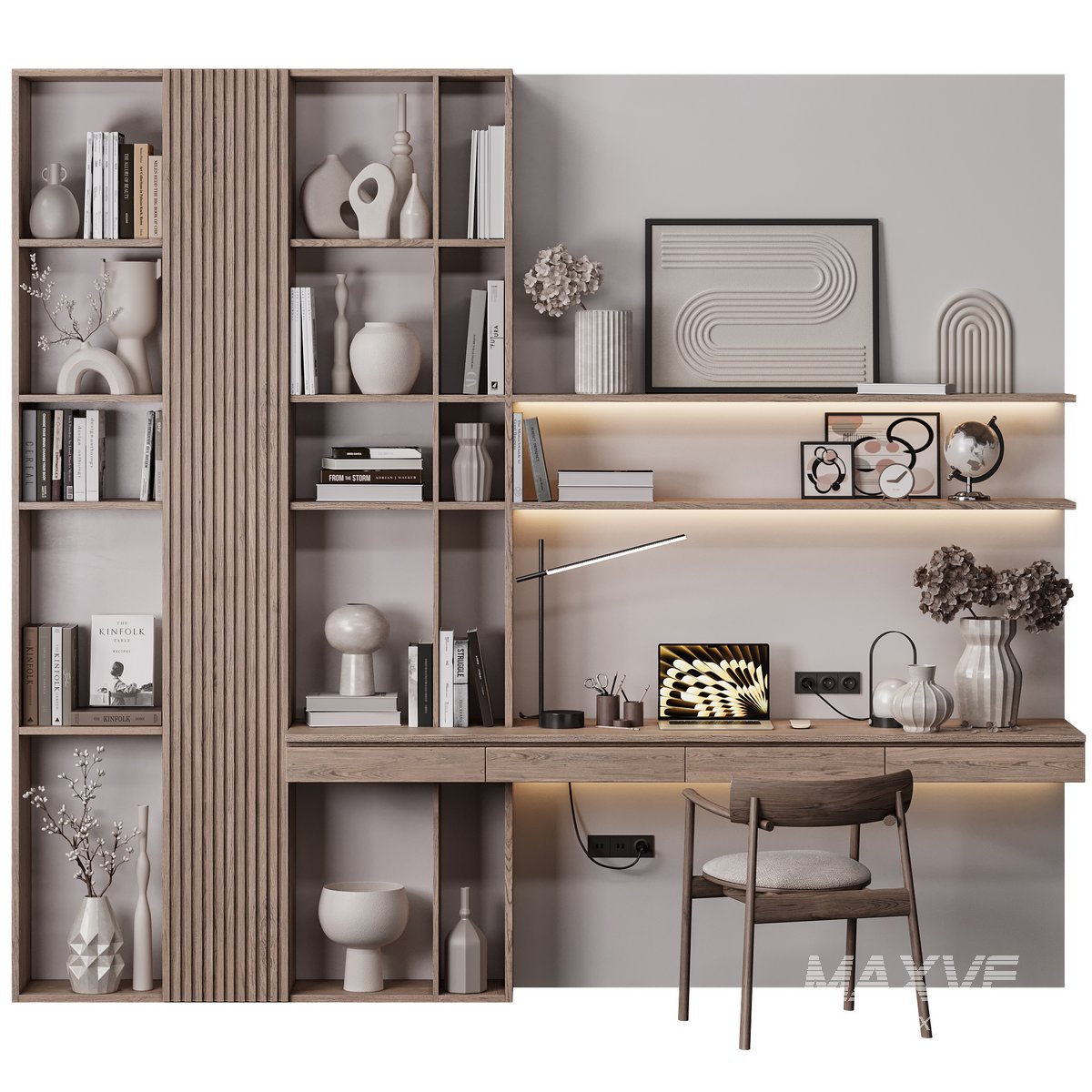 This unique modern minimalist study unit combines a wall-mounted desk with beautiful wooden shelves, enhanced by subtle LED backlighting for a warm and inviting atmosphere. Featuring a practical layout with sleek, modern decor, it??s perfect for both small and large spaces. The built-in wall shelves are ideal for organizing books and displaying modern ornaments, while the natural wood finish combined with neutral colors creates a calming and elegant look. Suitable for minimalist, modern, and Scandinavian interior styles.
