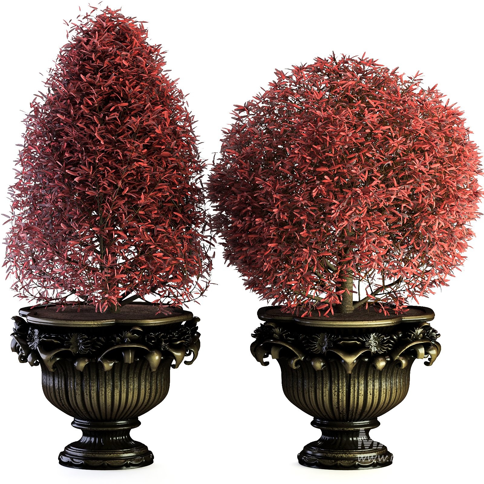 Outdoor Plant 02 is a premium-quality 3D asset designed specifically for luxury exterior and classic interior visualizations. This model includes two elegant ornamental topiary shapes with rich red foliage, placed inside a highly detailed antique-style metal urn planter. The sculpted floral motifs and ribbed body of the urn give the model a strong classical and artistic character, making it ideal for historical architecture, hotel entrances, upscale gardens, palaces, courtyards, and stylish terraces.