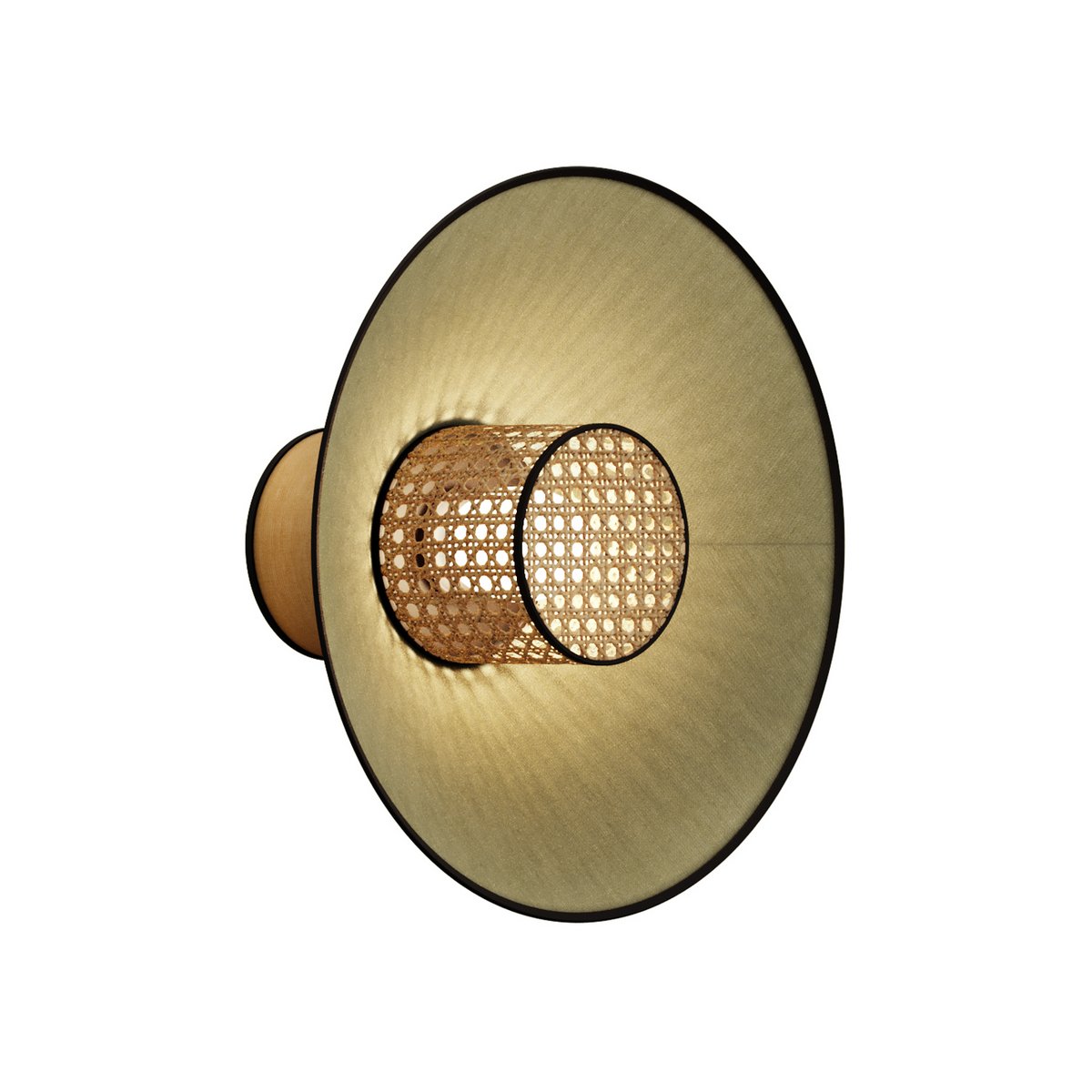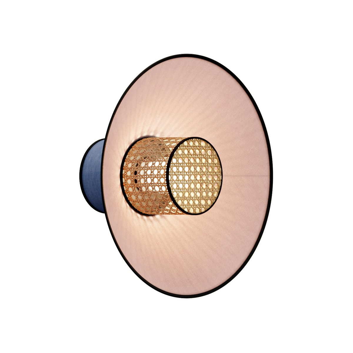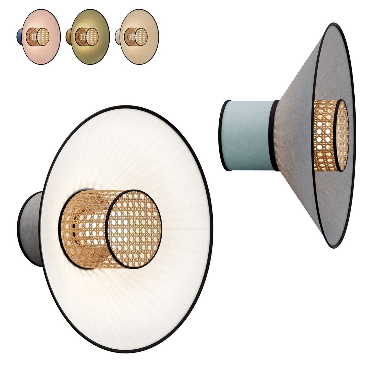 A series of wall lamps with diffusers made of colored textiles and woven rattan