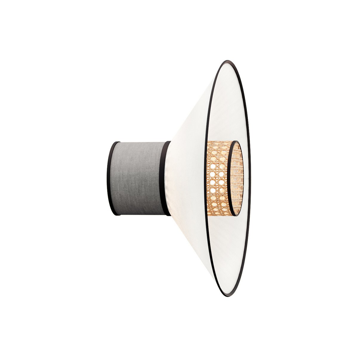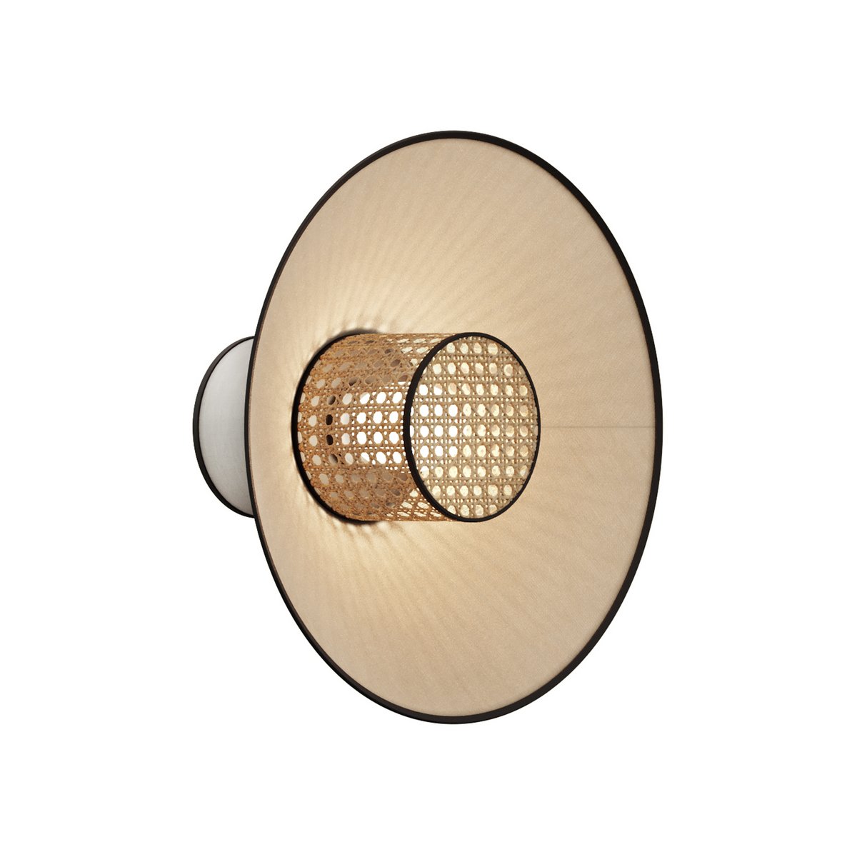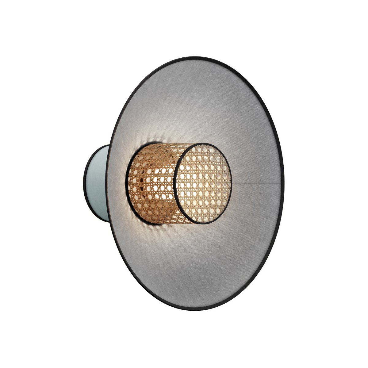 A series of wall lamps with diffusers made of colored textiles and woven rattan