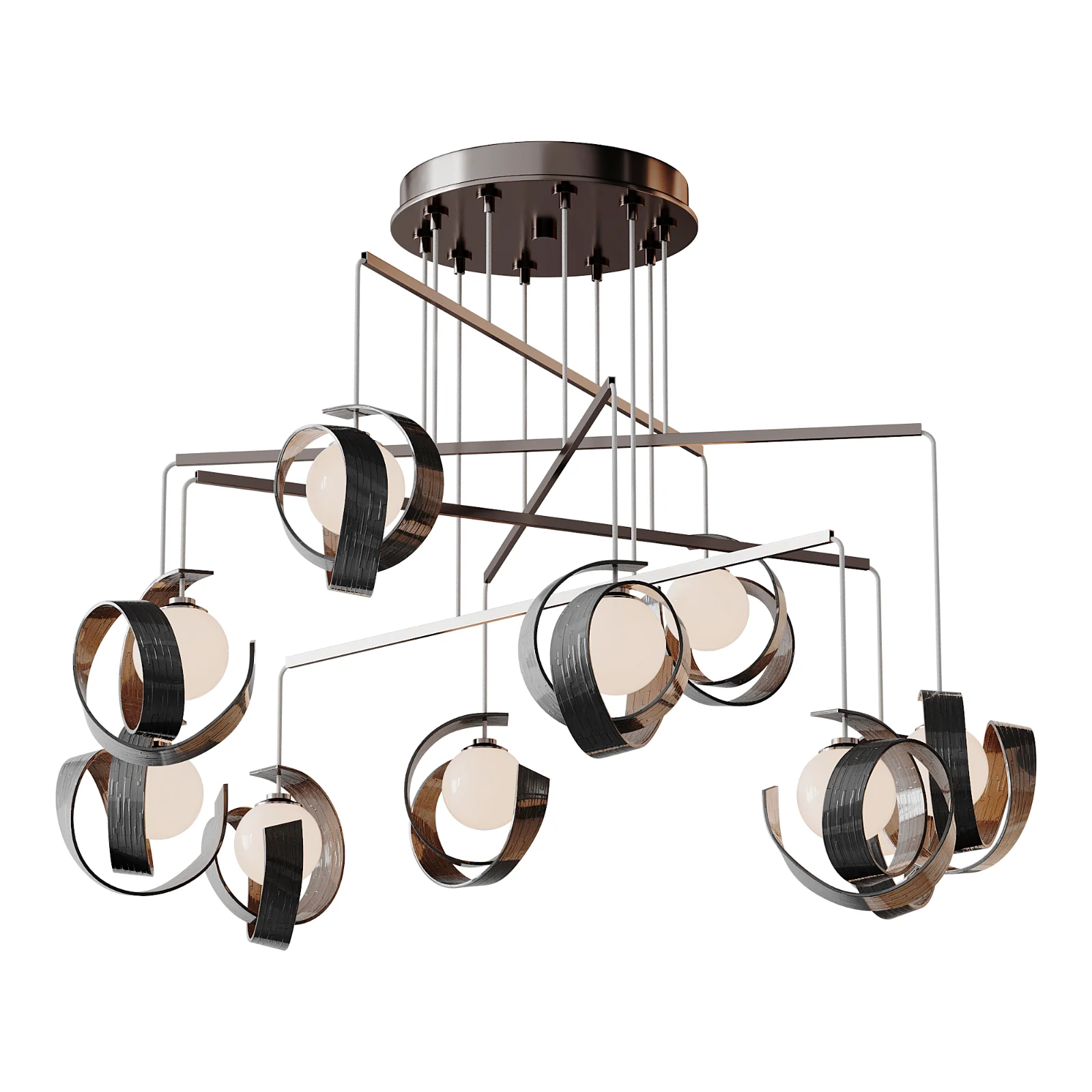 Description: Riza 10 Light Mobile Pendant: a sculptural mobile pendant light 3D model featuring a dynamic arrangement of curved metal bands and glowing spherical diffusers. The balanced, kinetic composition creates an artistic statement while providing soft ambient illumination, ideal for dining areas, living spaces, and luxury architectural visualizations. Optimized for Corona and V-Ray rendering with detailed, production-ready geometry.