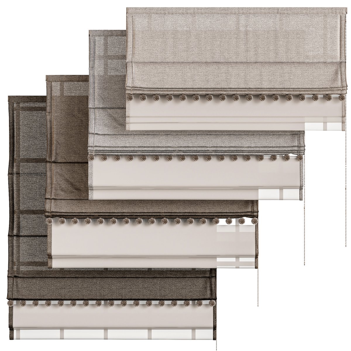 This elegant and versatile set of Roman curtains, adorned with delicate pom-poms, is a perfect addition to any interior. Crafted with attention to detail, these curtains feature a soft, textured fabric in neutral tones, ensuring they complement various design styles, from contemporary to classic. The curtains provide excellent light control and privacy while adding a decorative touch to windows.