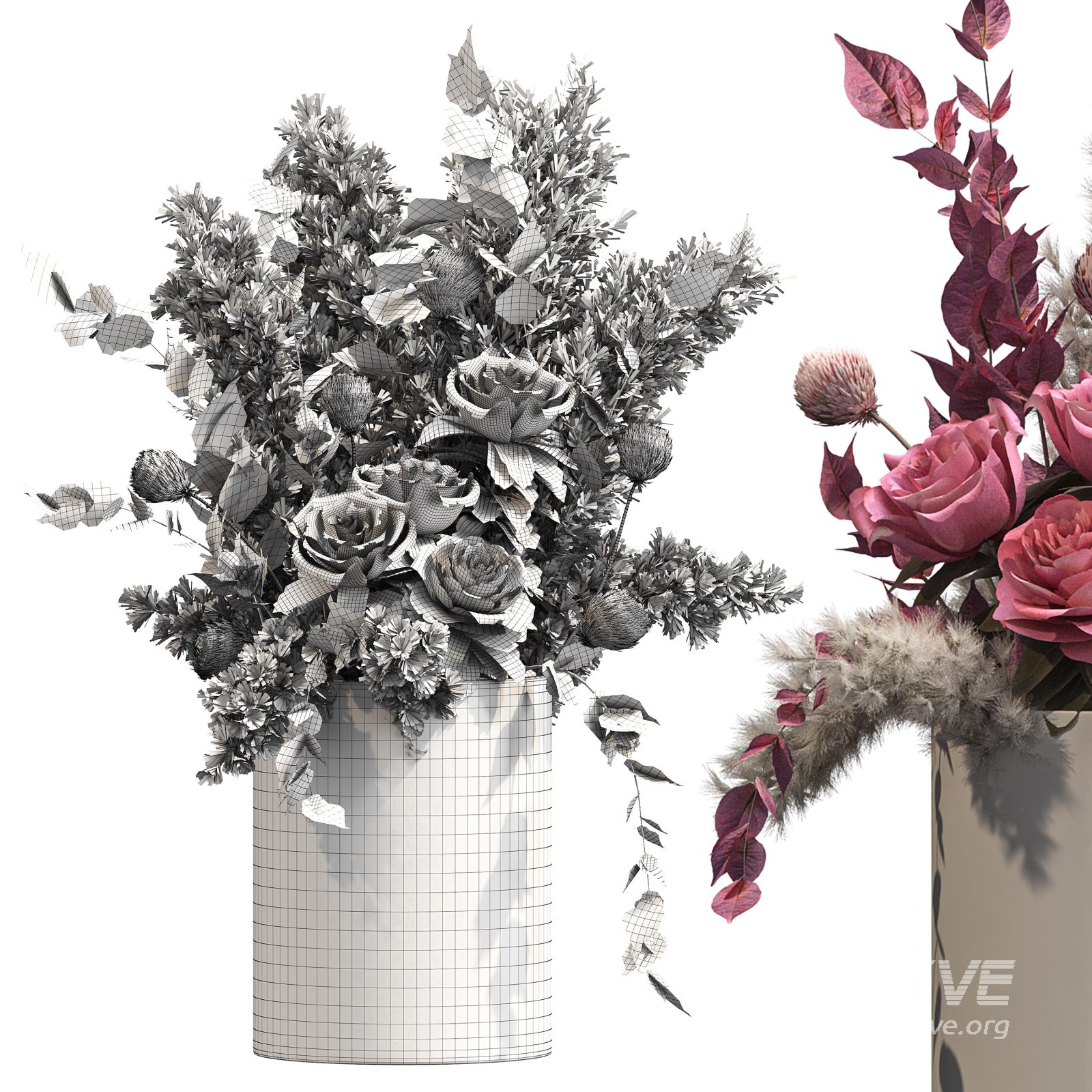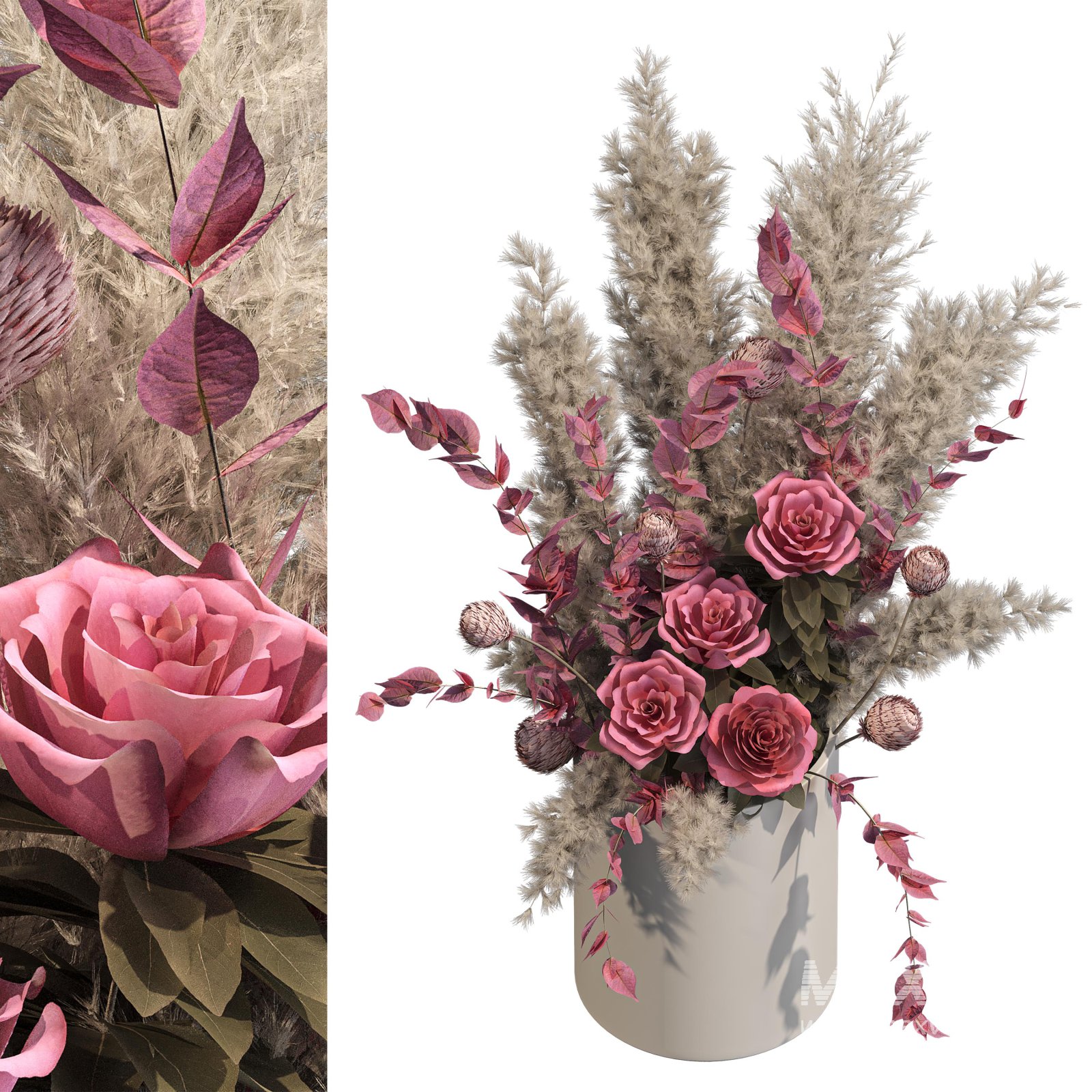 Romantic Pink Roses with Pampas in Ceramic Vase. Bouquet of flowers set 003