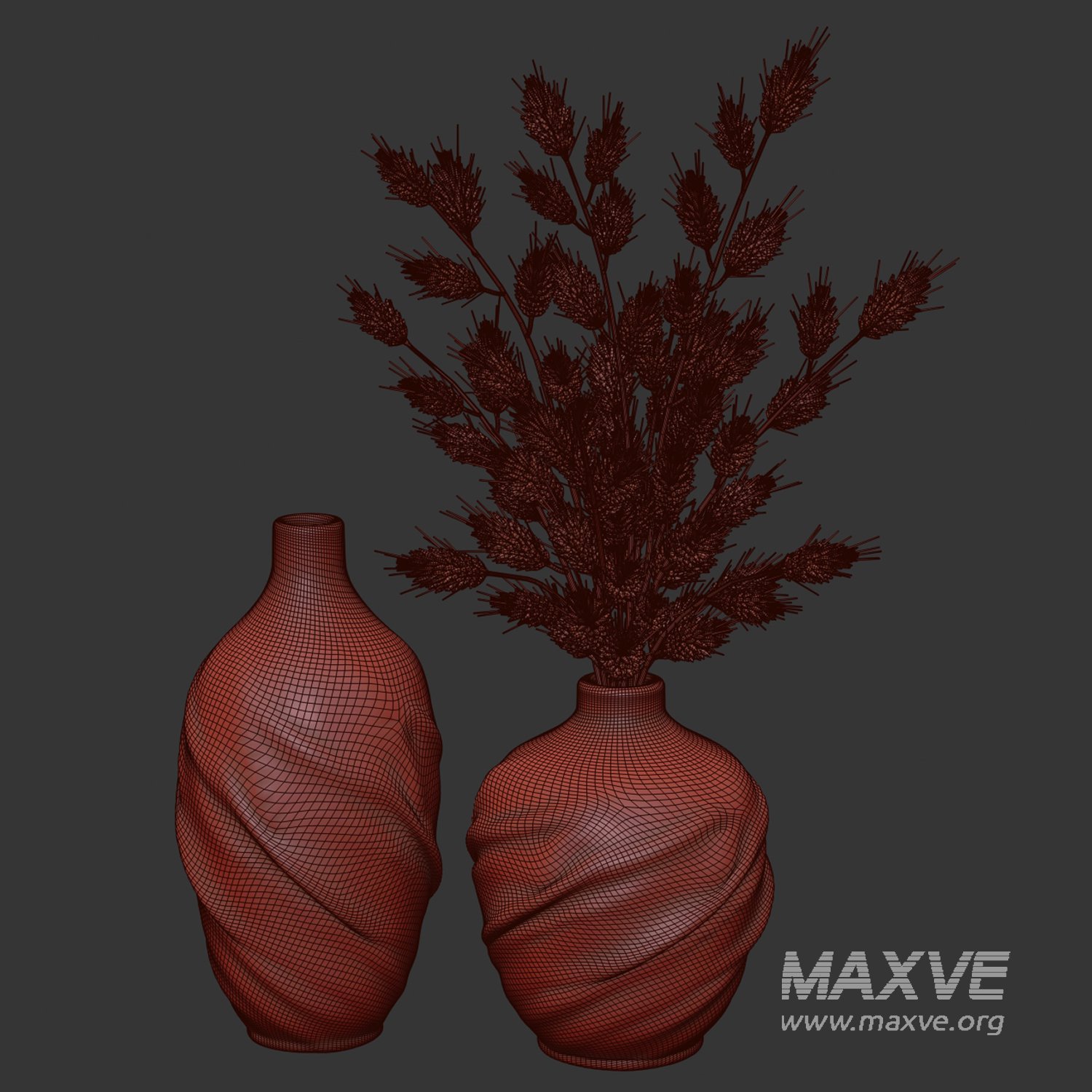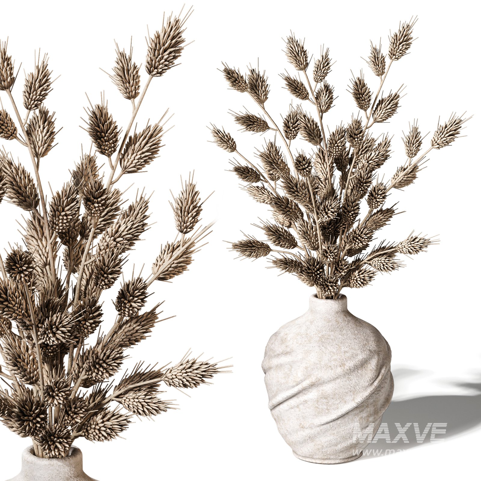 A realistic 3D model featuring two handcrafted stoneware vases with natural, twisted forms and matte ceramic textures. The set includes one empty vase and another filled with a bundle of dried wheat stems, creating a warm and organic decorative accent. The slightly irregular surfaces and raw stone finish give the vases a rustic, handmade character, making them ideal for Japandi, Scandinavian, rustic, or neutral-toned interior scenes.