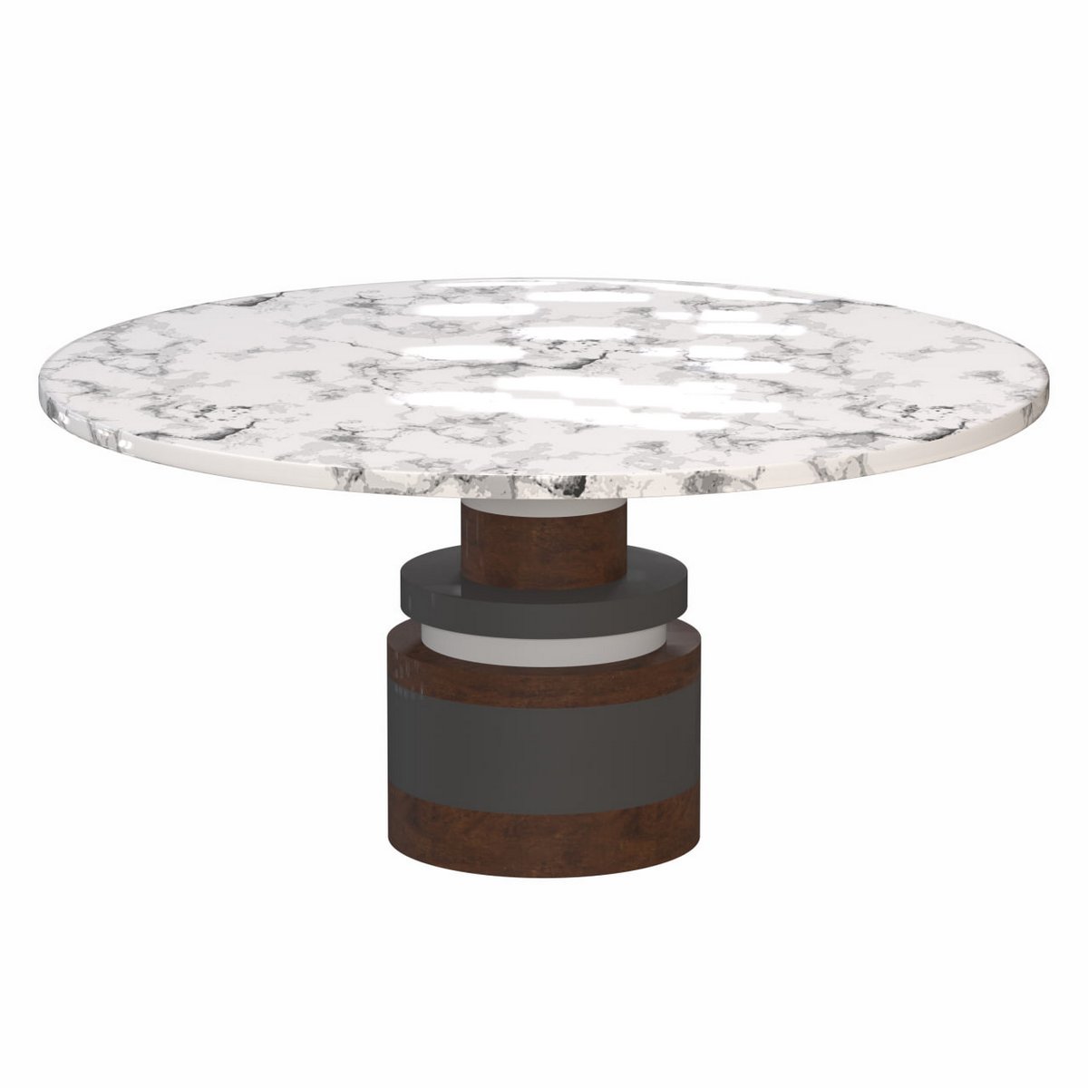 The Sottsass-inspired ???Sass Dining Table??? is a bold, graphic statement piece. A polished Nero Marquina marble top sits on an Amish-made base composed of painted and stacked wood circles.