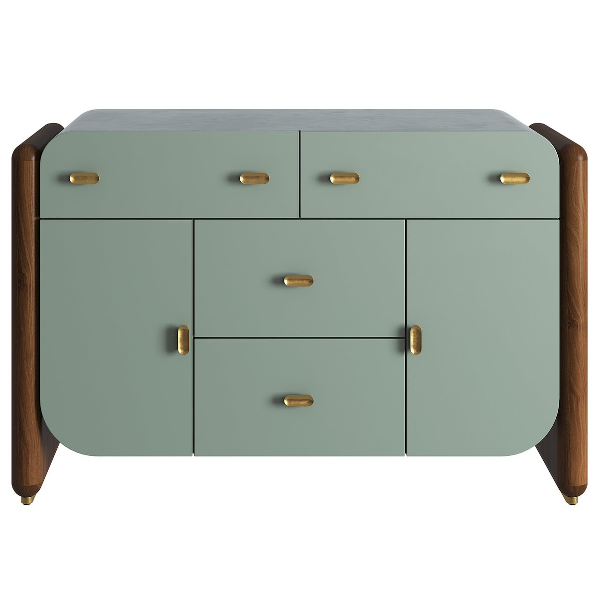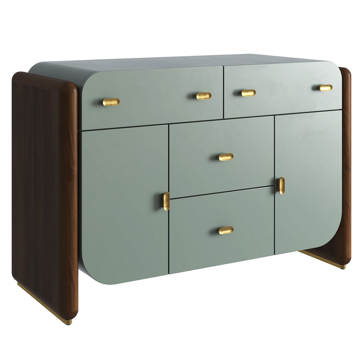Sleekly curved and full of refined details, the buffet is held by two Eucalyptus sides in a rich medium brown finish atop burnished brass plinths. The matching pill-shaped brass drawer pulls are scooped out with a concave pill effect, giving strong detailing to the medium sheen lacquer finish chest.