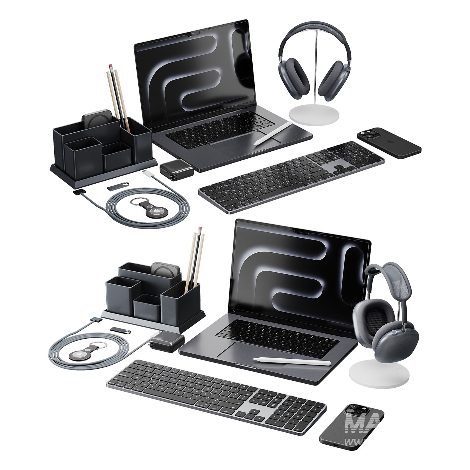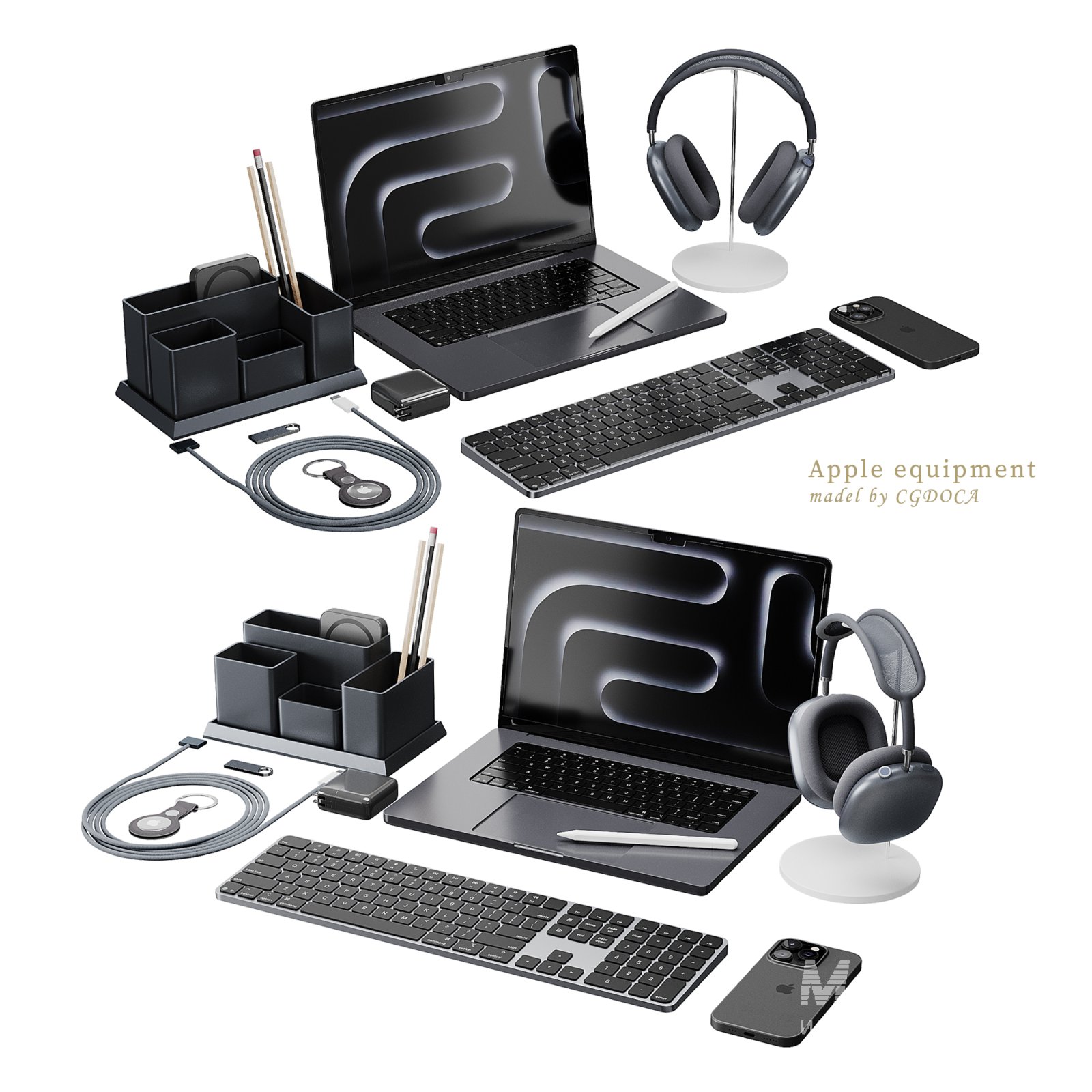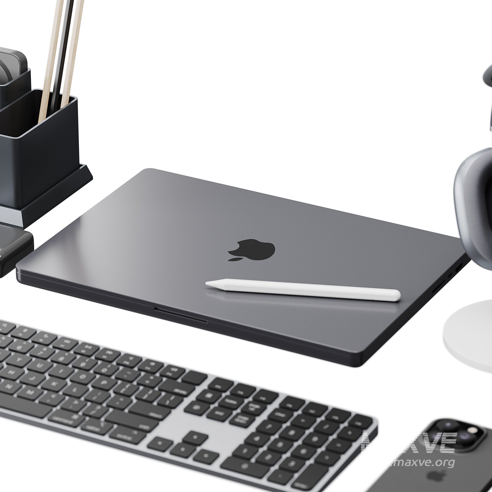 Tags: apple setup, workspace accessories, office equipment, laptop 3D model, headphones 3D, smartphone 3D, keyboard 3D, modern desk scene, corona render office, home office decor, technology mockup, 3ds max apple set, FBX tech set, OBJ gadgets, desk organizer, digital workspace, high poly electronics, Apple inspired, MacBook 3D, AirPods Max 3D