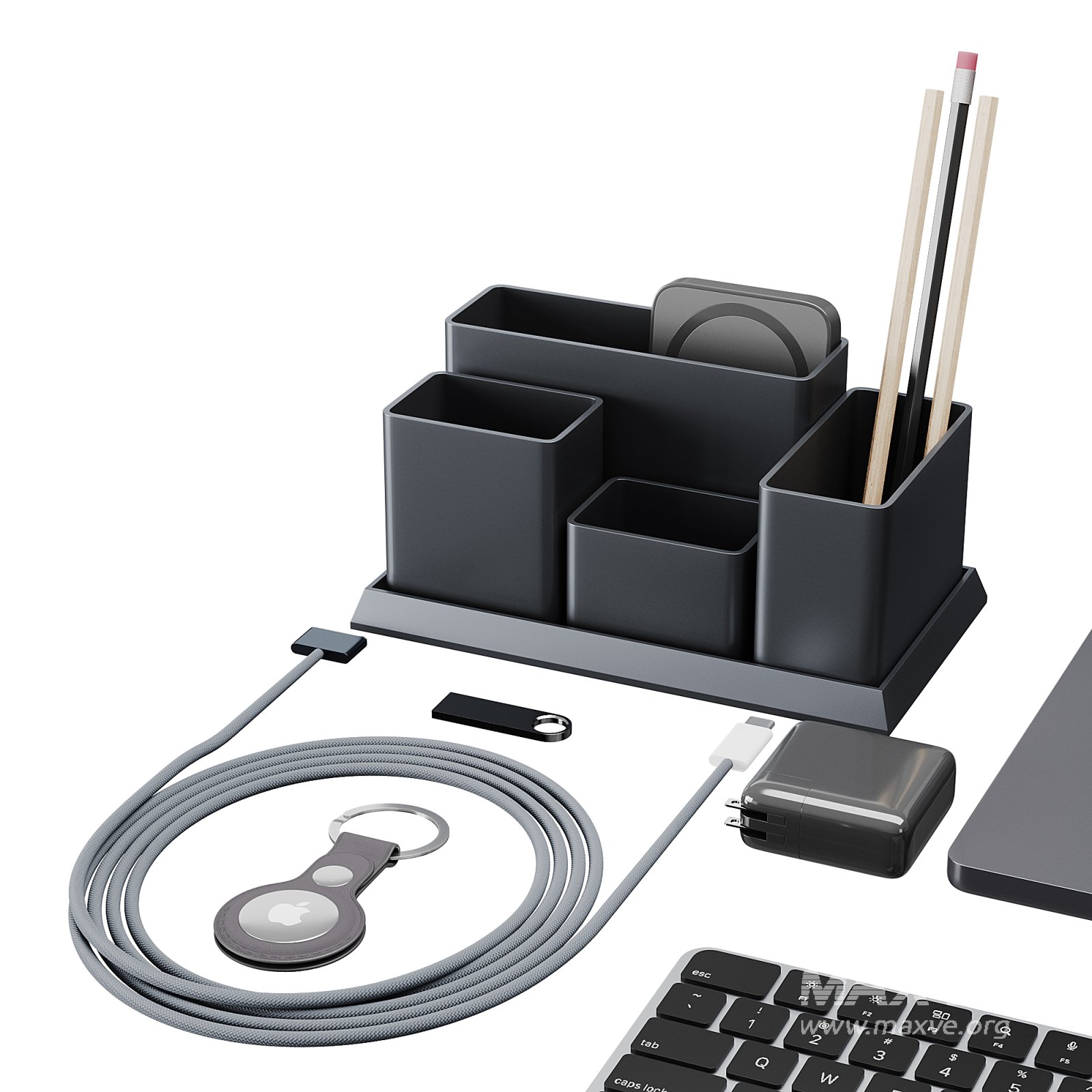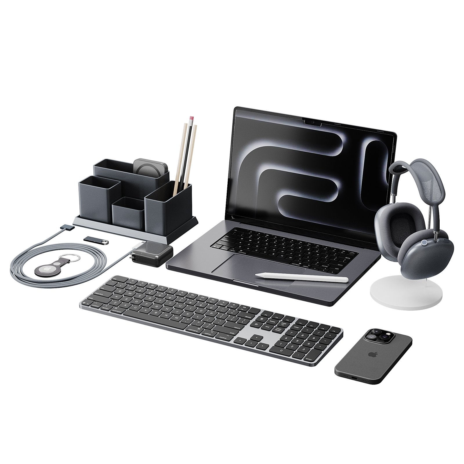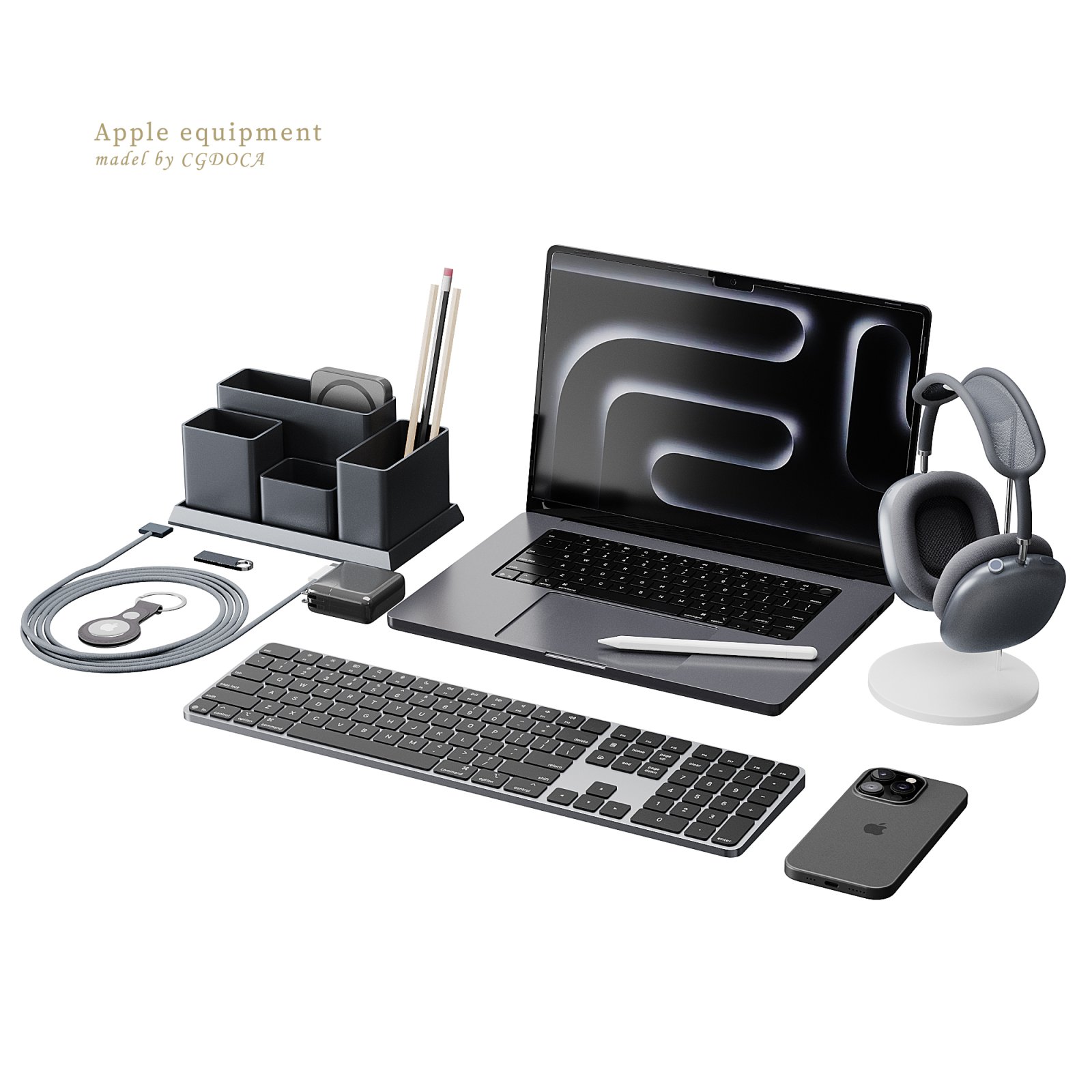 Tags: apple setup, workspace accessories, office equipment, laptop 3D model, headphones 3D, smartphone 3D, keyboard 3D, modern desk scene, corona render office, home office decor, technology mockup, 3ds max apple set, FBX tech set, OBJ gadgets, desk organizer, digital workspace, high poly electronics, Apple inspired, MacBook 3D, AirPods Max 3D