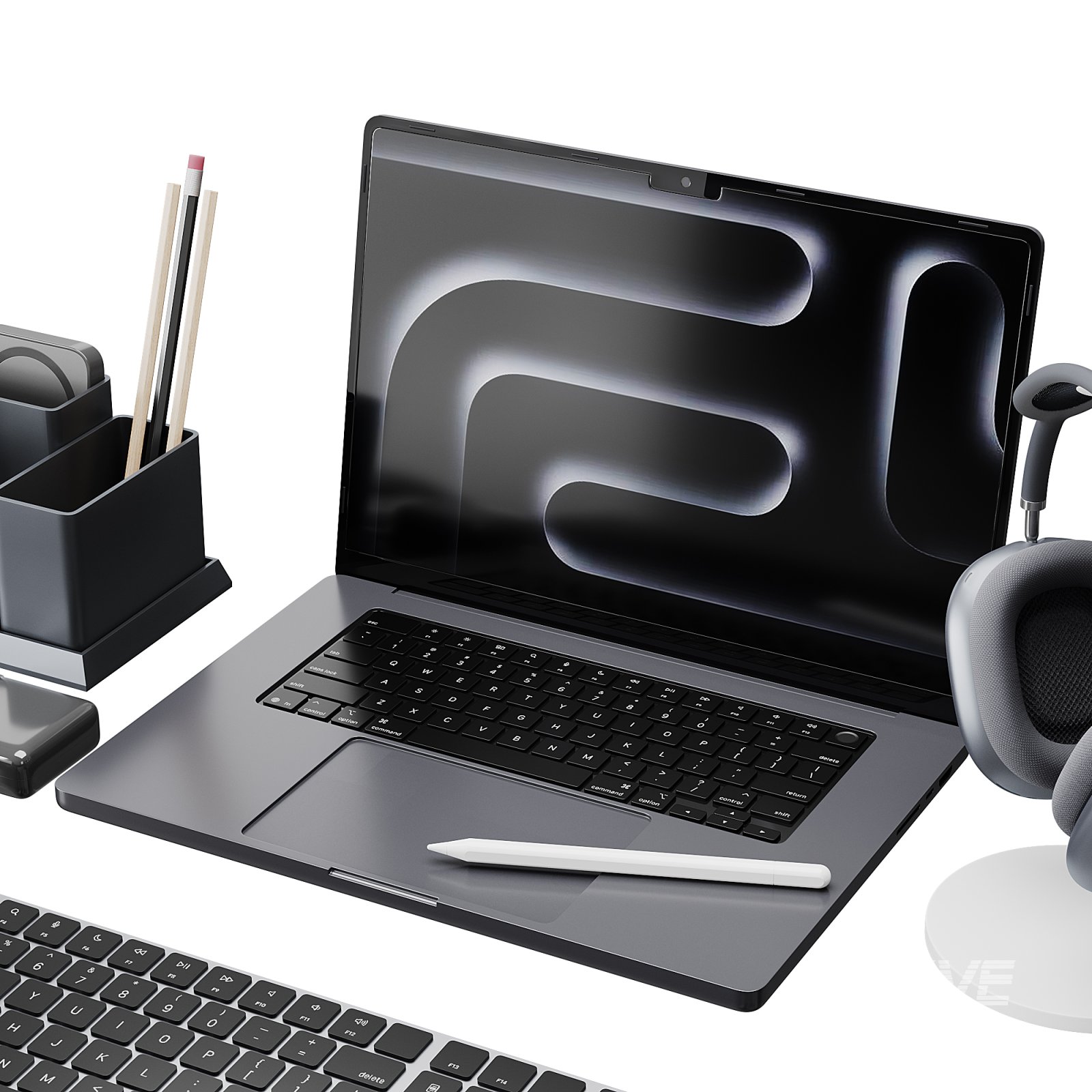 Description: This high-quality 3D model features a realistic set of Apple-inspired office equipment. The set includes a sleek laptop with a stylus, a wireless keyboard, over-ear headphones on a stand, a smartphone, charging accessories, and a stylish desk organizer with pencils and small devices. Perfect for visualization of modern workspaces, tech environments, or home office scenes. All objects are carefully modeled with attention to details, realistic proportions, and Corona material settings for photorealistic rendering.