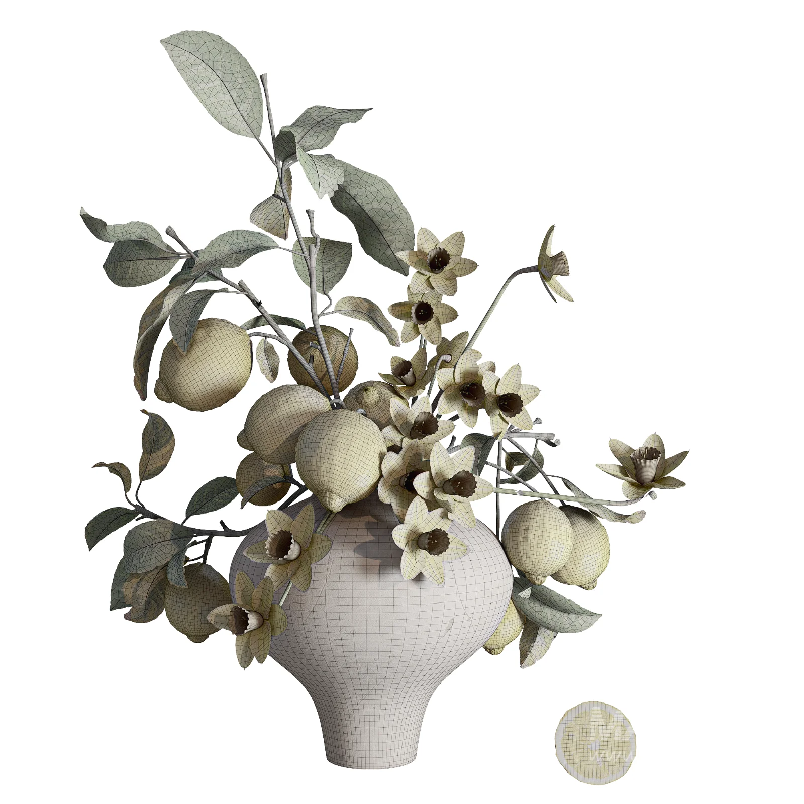 Geometry: High-poly mesh detailing the organic irregularities of the petals and the unique shape of each lemon, suitable for extreme close-up shots.
