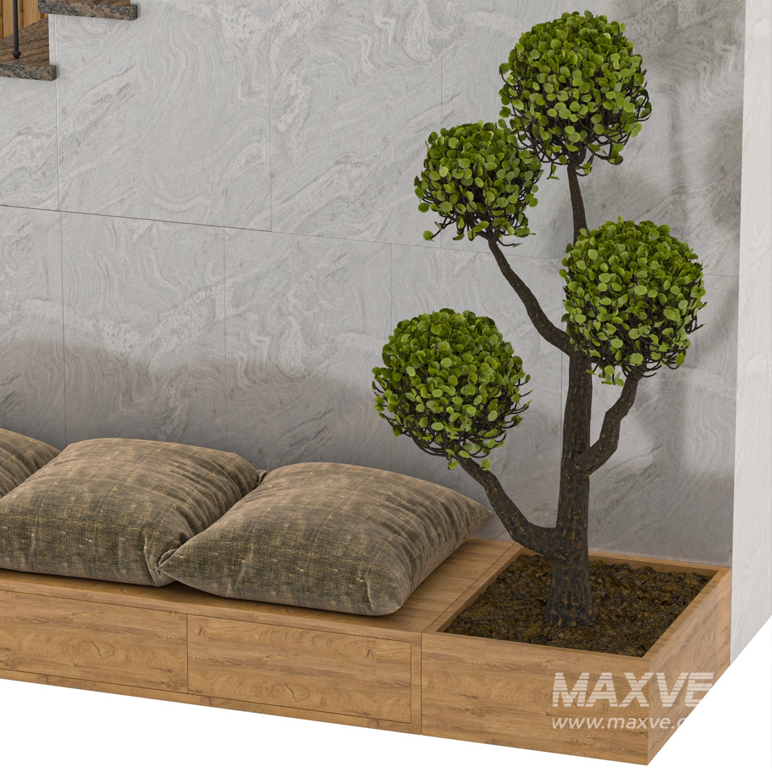 Description: A modern staircase with a wooden panel background, metal railing, and a built-in seating area with cushions. Includes decorative greenery. Suitable for interior visualization and architectural projects.