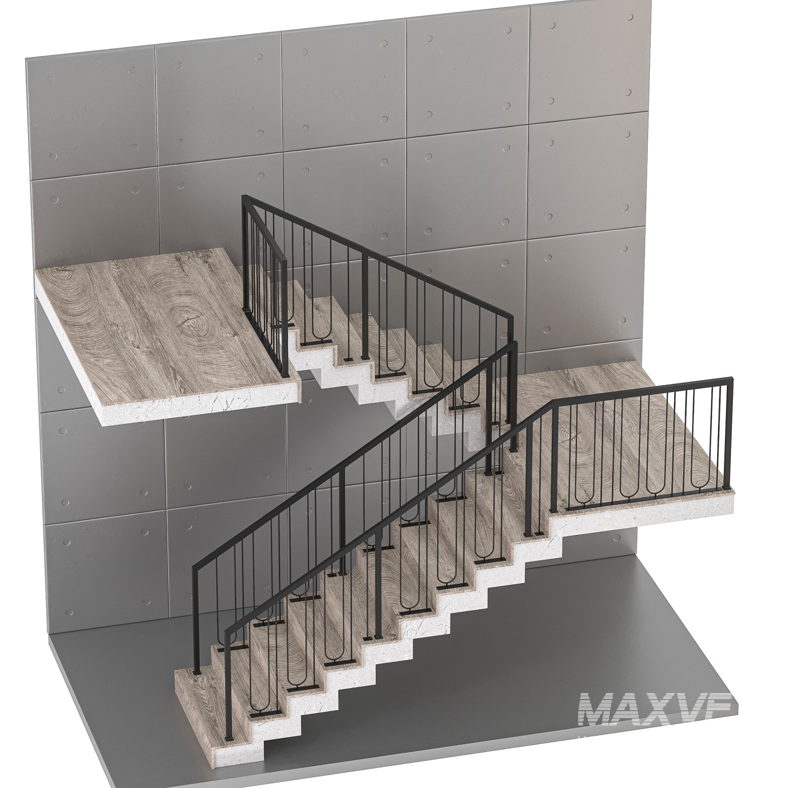 The Staircase 09 is a contemporary architectural stair model designed with a minimal industrial aesthetic. It features a combination of metal railings and wooden treads, set against a clean concrete wall backdrop, offering a perfect balance between functionality and style.