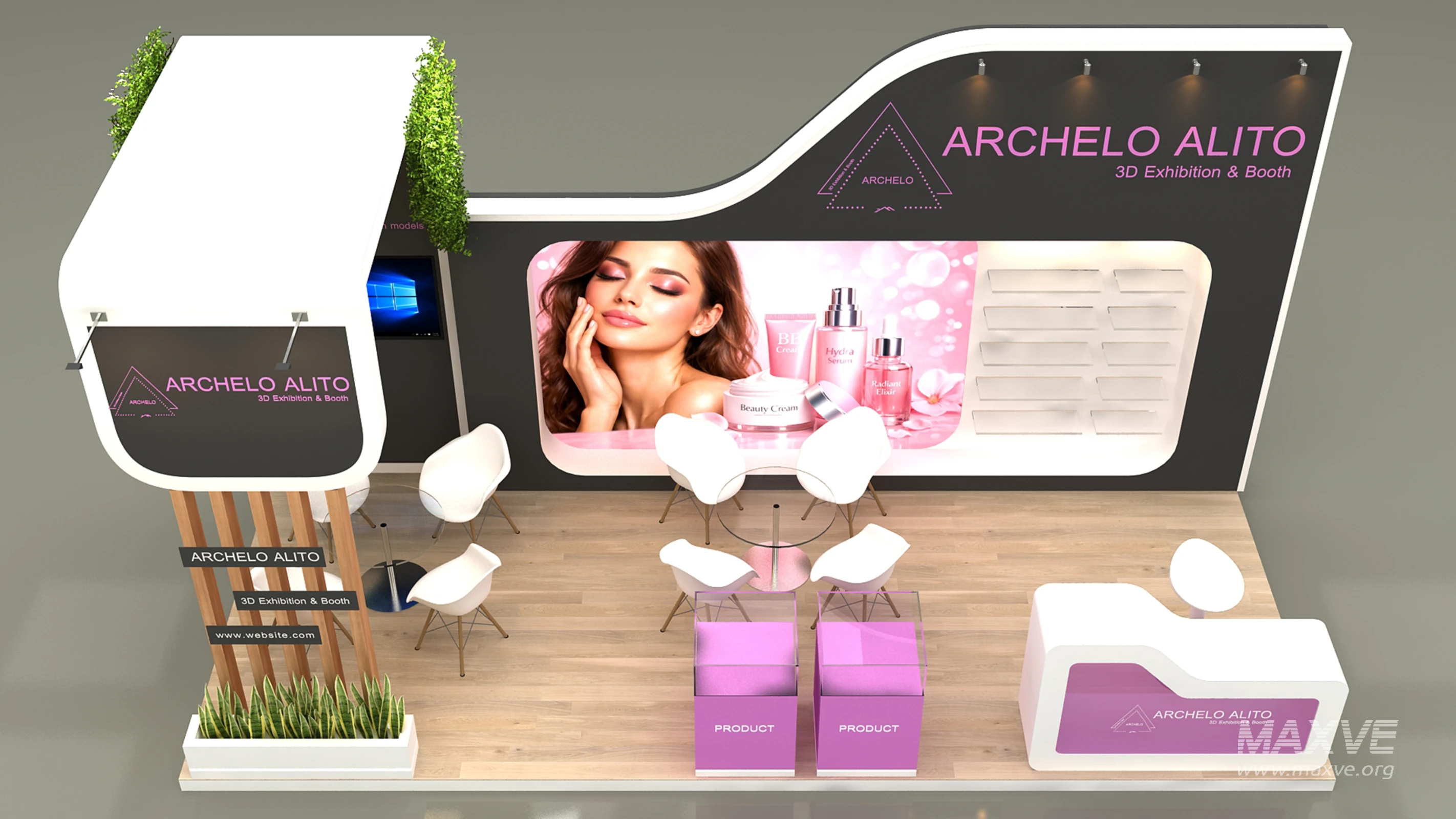 include design all necessary area in Exhibition and Booth Such as Vip and Storage and Counters and also Stand for products