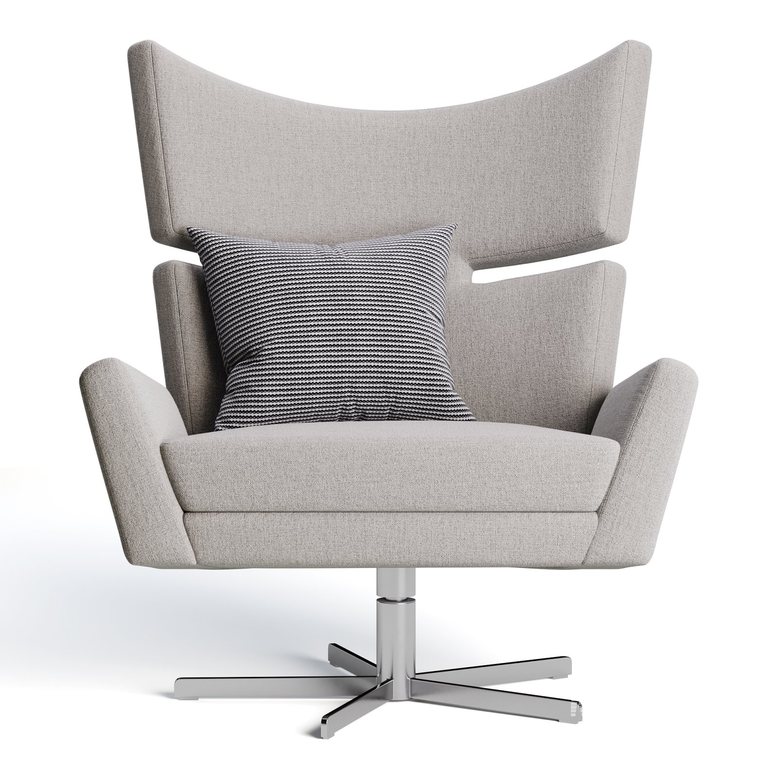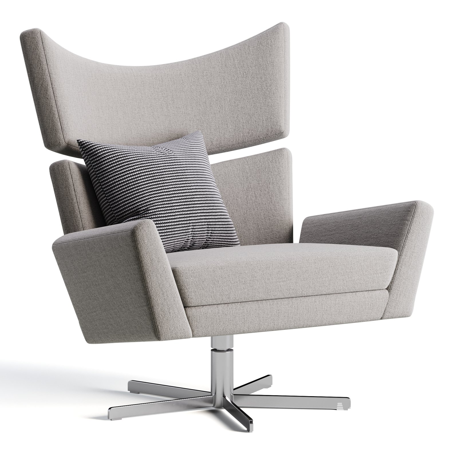 Description: Bold and sculptural, the Eduardo swivel chair features a high wingback silhouette with angular armrests and a solid chrome base. Upholstered in soft fabrics including boucle, linen, and wool blends, its form strikes a balance between mid-century modern and contemporary luxury. A striped accent pillow adds contrast and comfort. Perfect for statement lounge areas or modern hotel lobbies.
