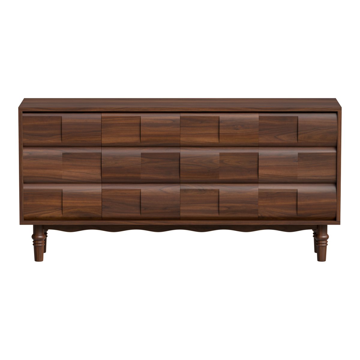 Sleek yet functional, this sideboard boasts contemporary design with dark wood finish. It features varied storage options with flush cabinet doors and drawers, complemented by stylized roman legs, enhancing its modern yet classic aesthetic