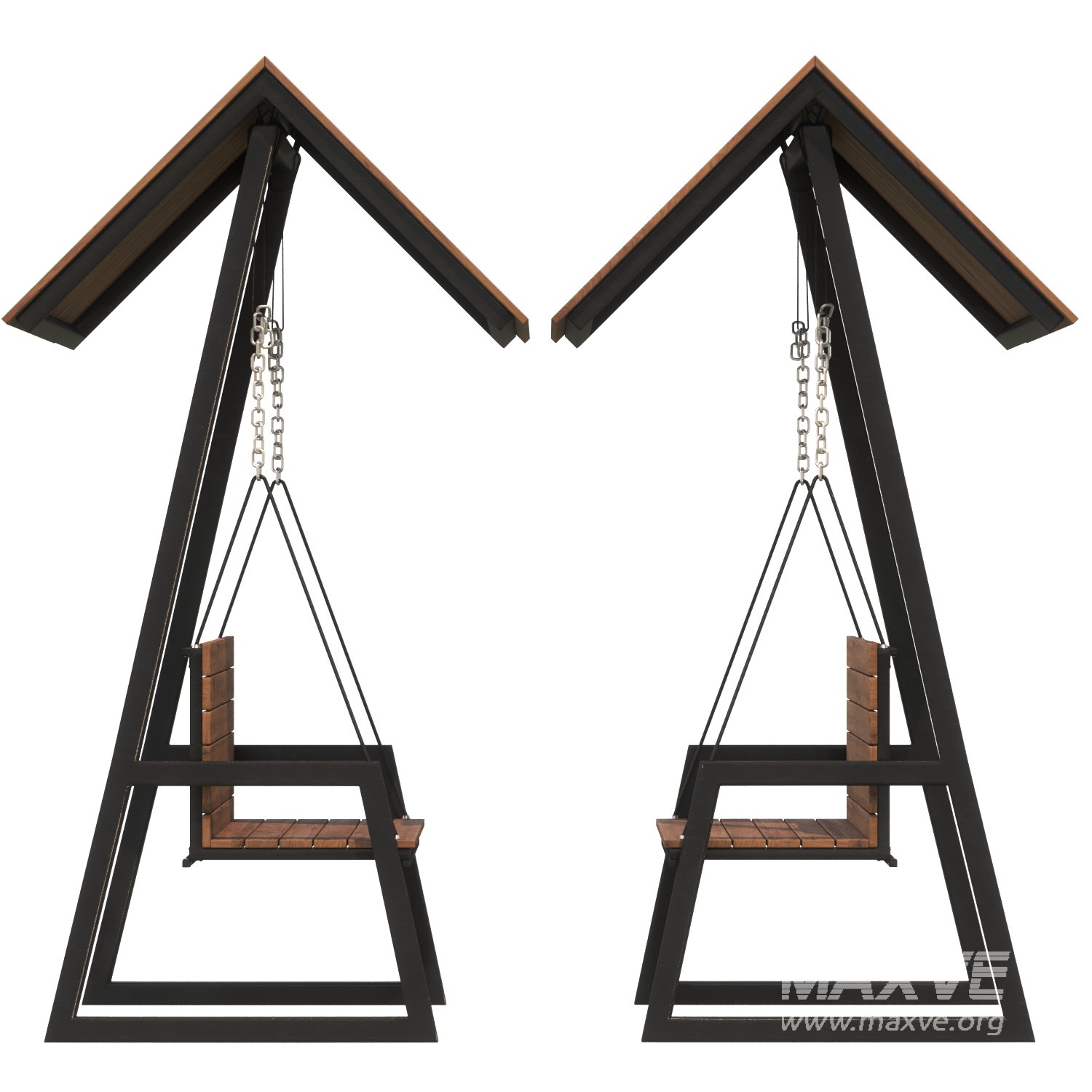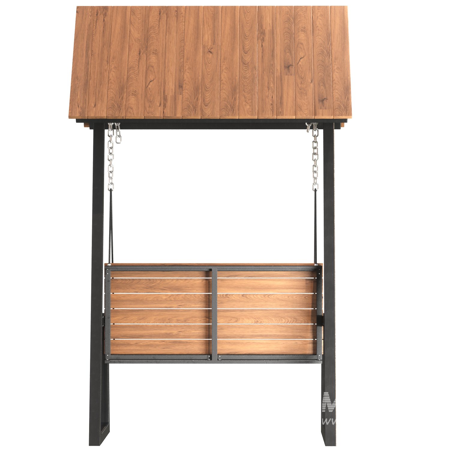 This stylish and functional swing bench is designed for urban outdoor environments such as parks, patios, or private gardens. The model features a modern A-frame structure with a pitched roof for shade and weather protection. The seat is suspended with metal chains and includes a slatted wood design for comfort and breathability. The frame is made of black-coated metal, adding contrast and durability to the piece.