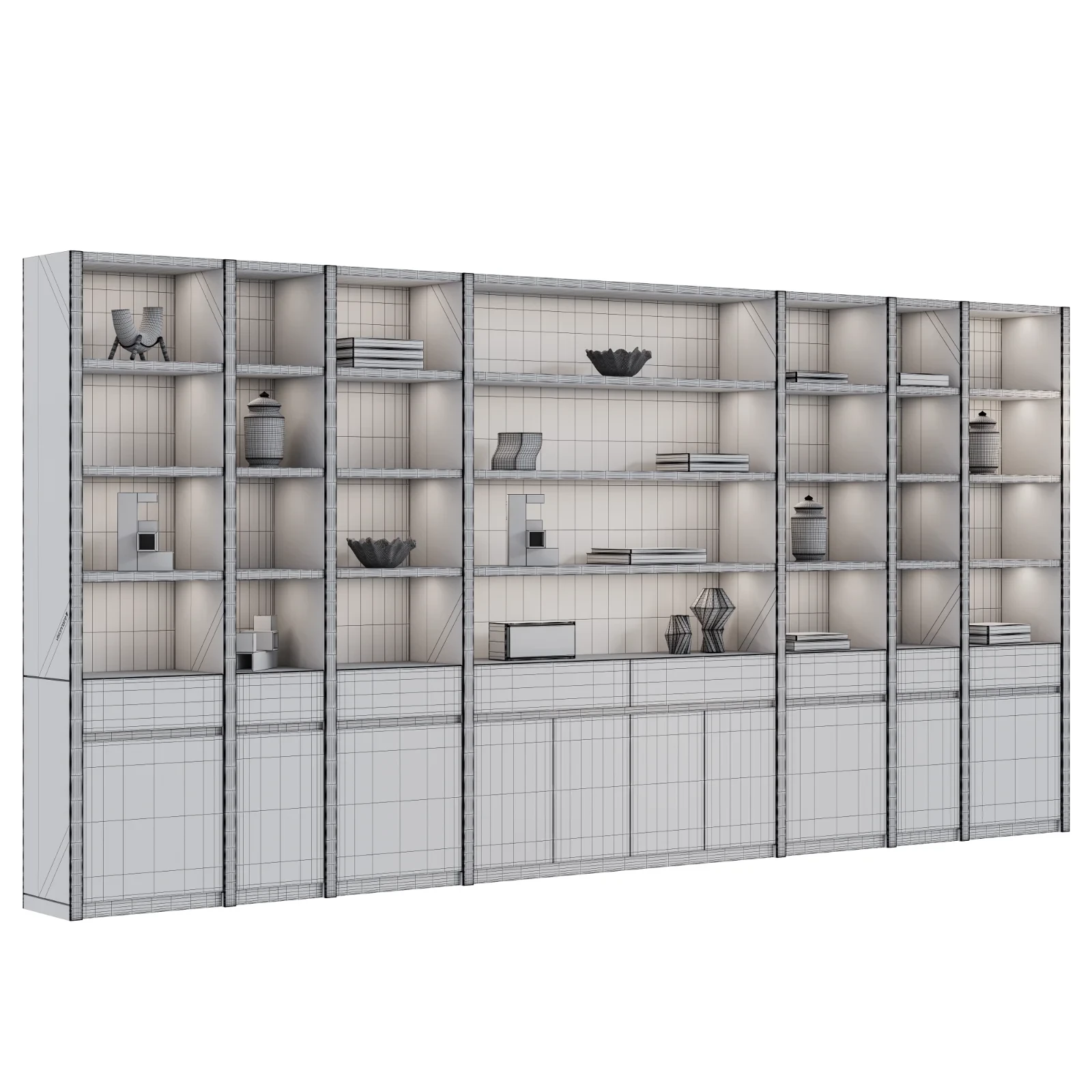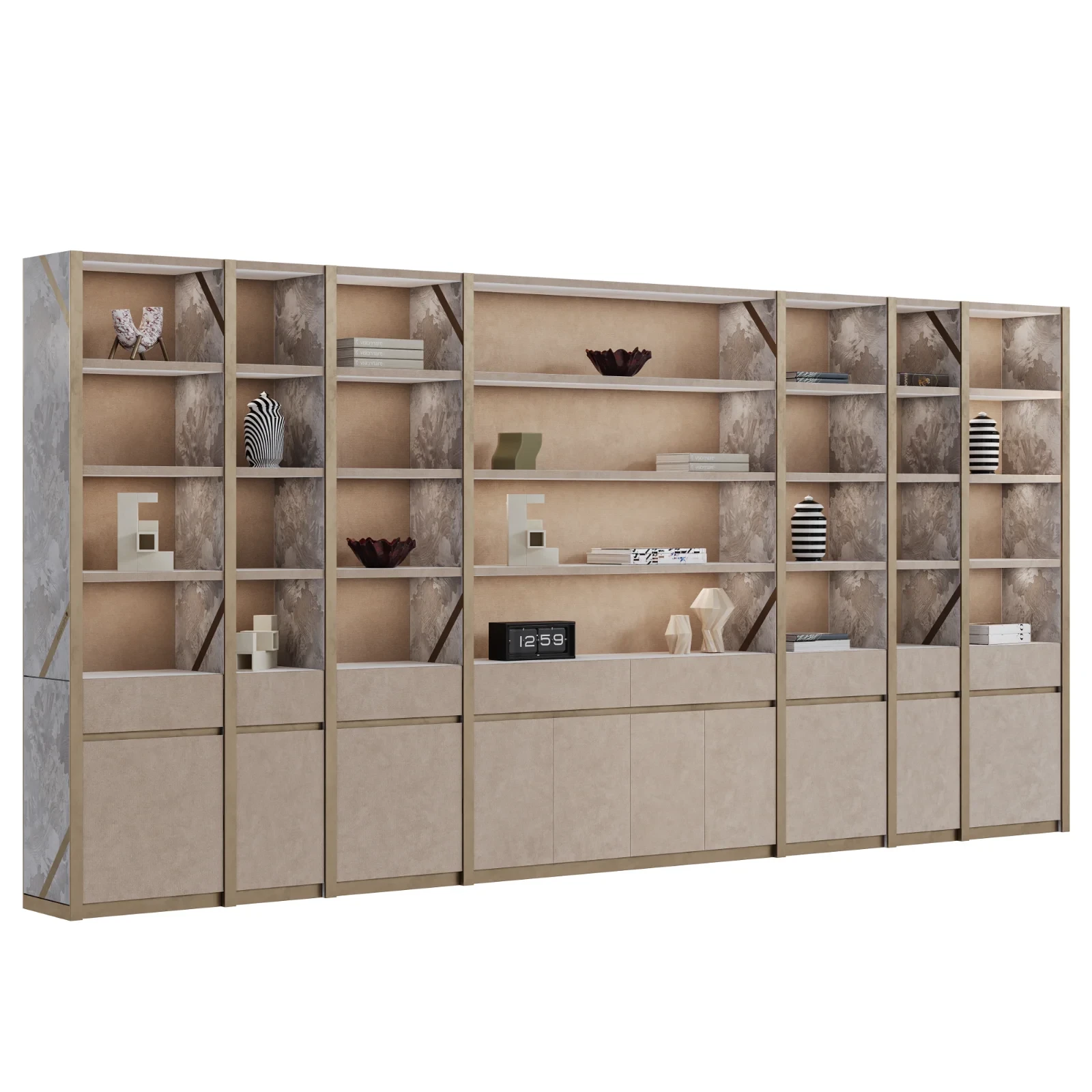 Modular bookcase system defined by vertical volumes in MDF veneered in wood essence. Shelves, back panels, doors, and drawers are all upholstered in leather or fabric, seamlessly integrated into the structure with material continuity. Satin-finished steel profiles, decorative trims, and base complete the design, with interiors in matte lacquer and metallic-finish details.