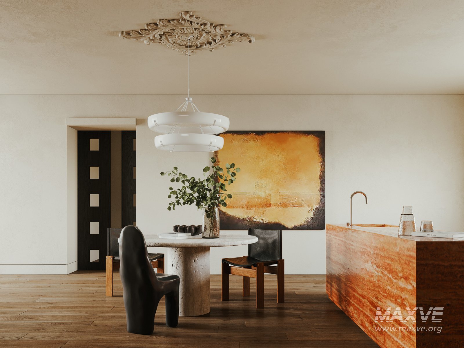 This Classic Wabi-sabi style restaurant 3D scene was built in 3ds Max 2021 and rendered using Vray. It includes clean geometry, proper scene organization, and is optimized for smooth rendering performance. The model setup follows standard practices, making it easy to import and adapt into a variety of workflows. Delivered in MAX format, it is well-suited for architectural visualization, concept development, or design presentation. Dominant color tones include: Orange tones, Gold tones, Beige tones, Silver tones.