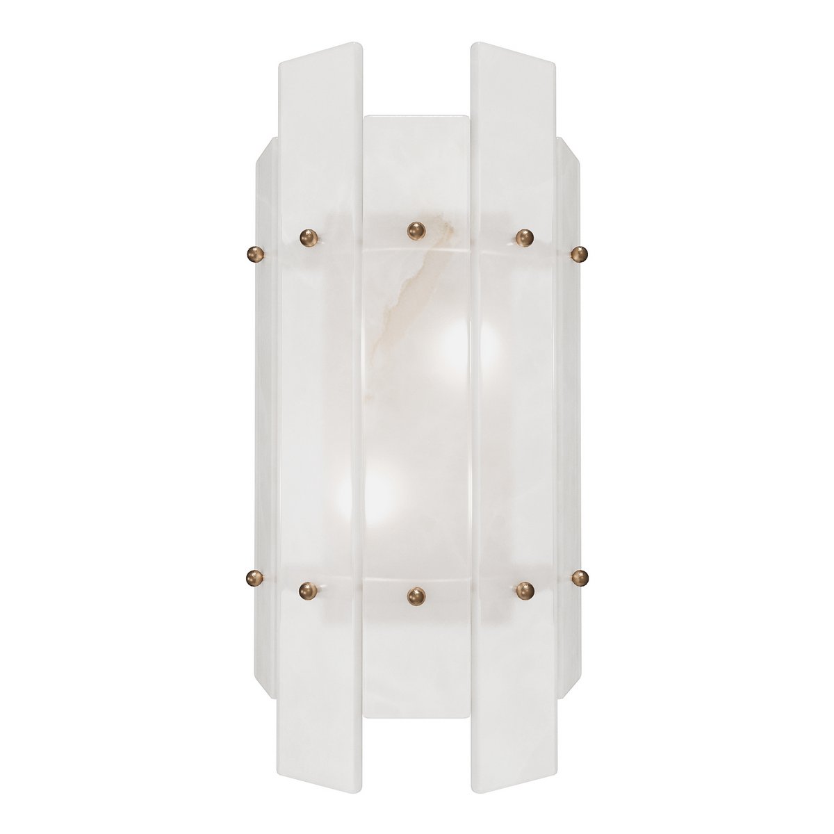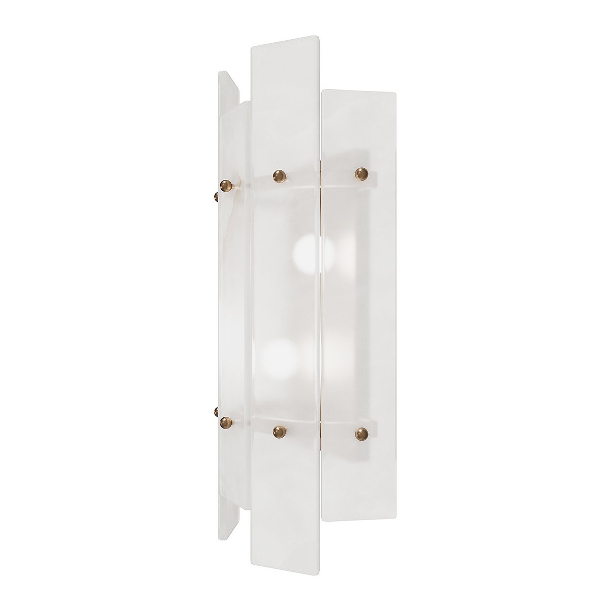 This 2-light wall sconce features an antique brass finish and a semi-circular shade of translucent alabaster plates.