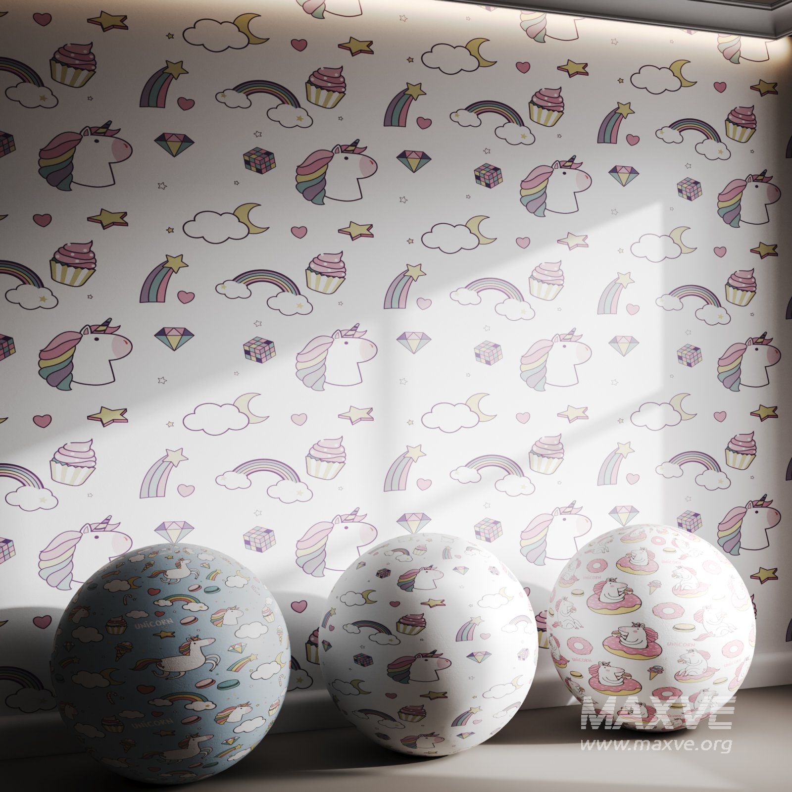 Tags: unicorn, rainbow, pastel, clouds, stars, hearts, cupcakes, kids room, fantasy, cute decor, whimsical, magical, dreamy, ice cream, donuts, macaron, girly wallpaper, cartoon, playful, soft colors