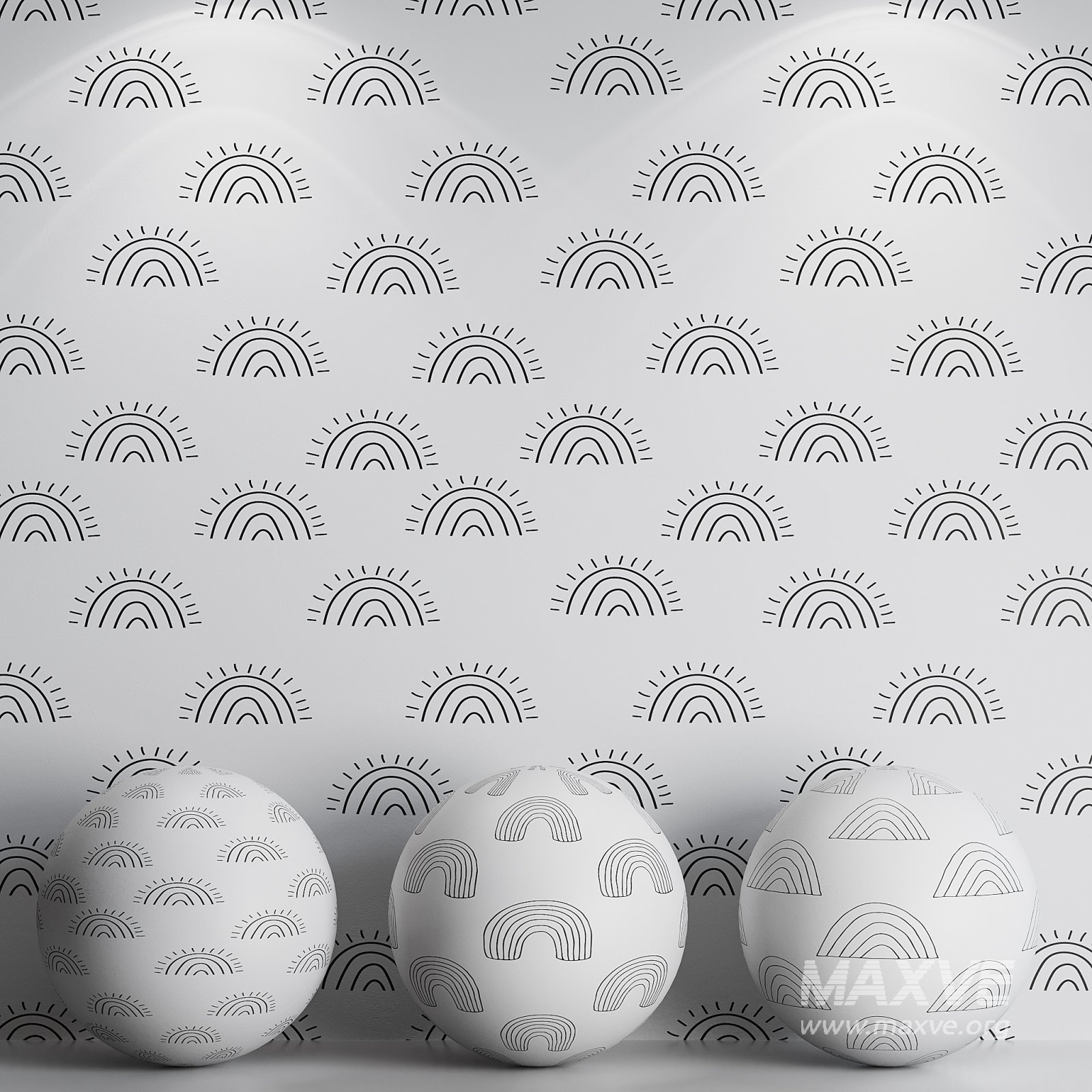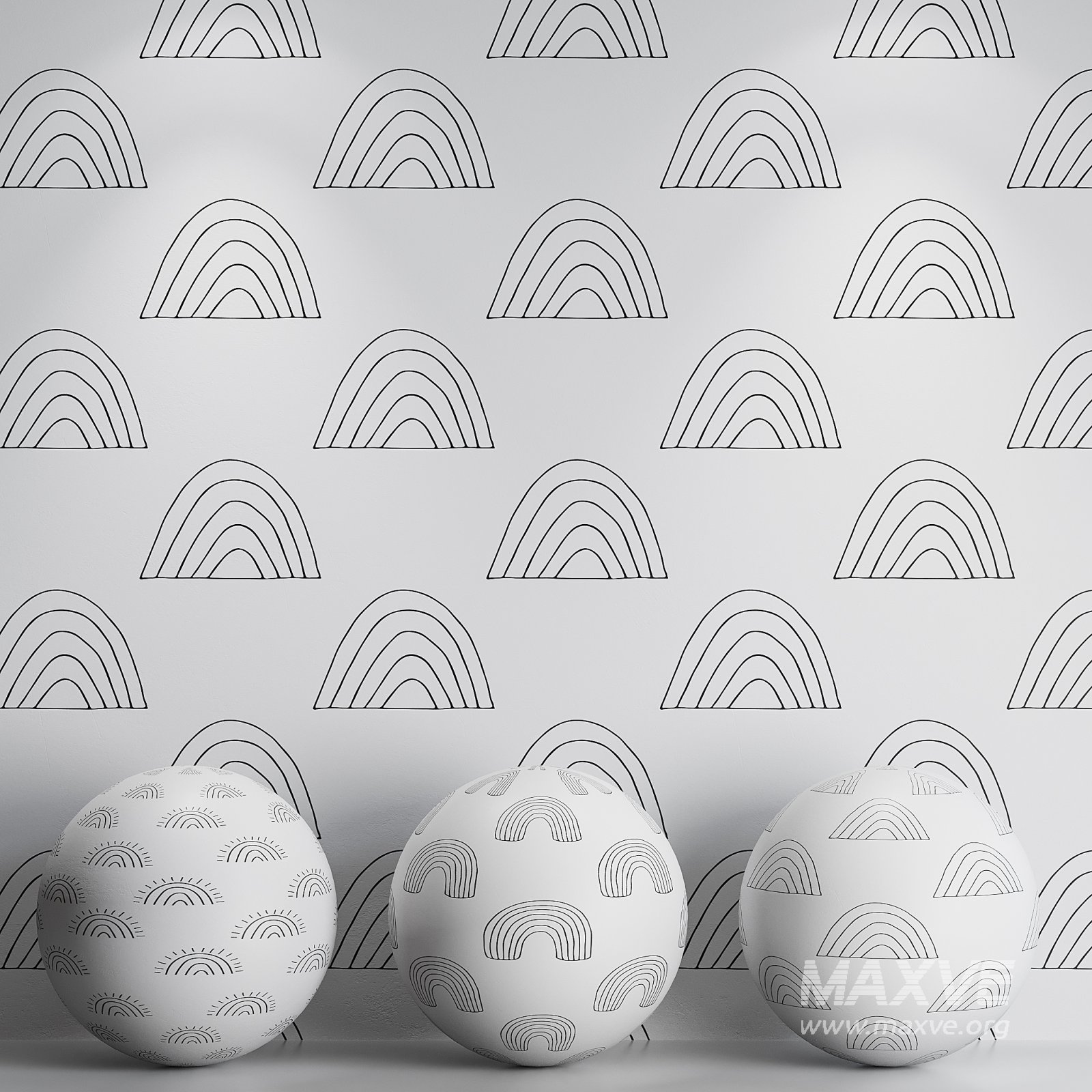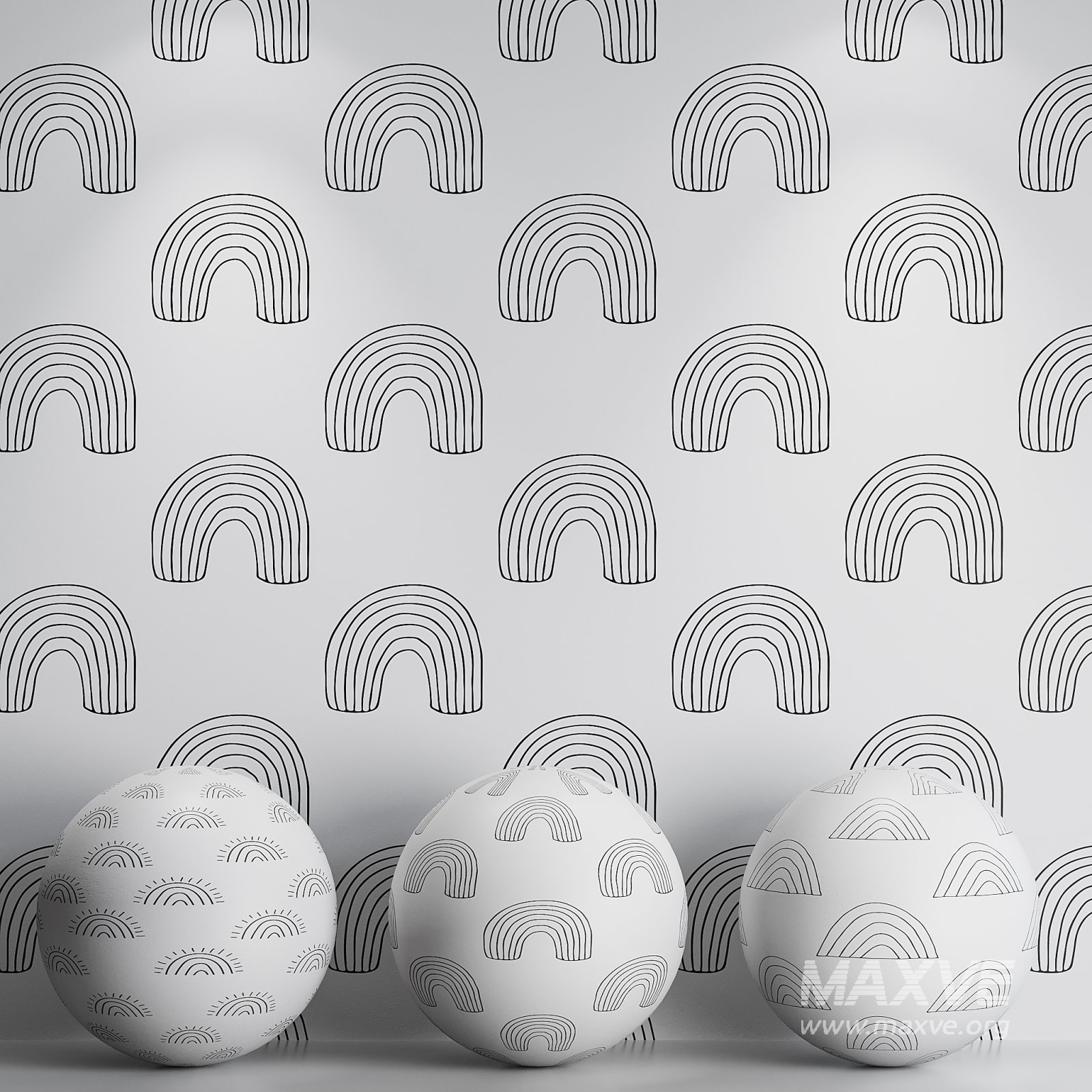 Tags: rainbow, minimal, kids room, nursery, modern wallpaper, Scandinavian design, black and white, geometric, hand-drawn, decorative pattern, 3D model, seamless wallpaper, Corona Renderer, interior decor, line art, soft design, neutral palette, playful, printable pattern, digital wall mockup