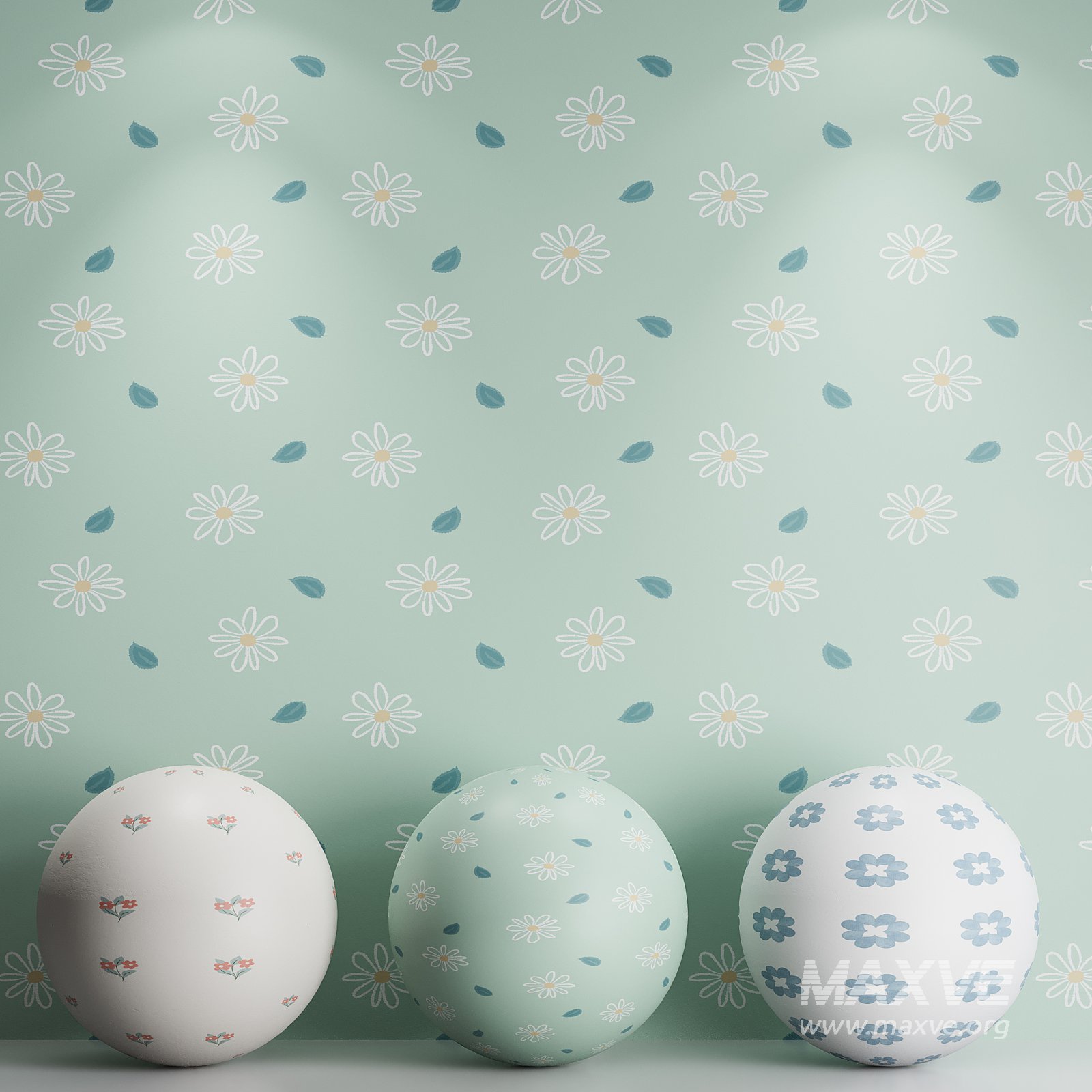 Wallpaper 70 is a charming and refreshing decorative model featuring a playful floral motif with scattered leaves, set against a soft pastel green background. The repeated pattern of delicate white daisies and stylized blue leaves creates a cheerful and harmonious atmosphere, ideal for children's rooms, nurseries, or creative studio spaces. Rendered with Corona Renderer 10 for high-quality visualization, the design showcases subtle shadows and gentle lighting that enhance the pattern’s whimsical nature. The model is fully compatible with FBX and OBJ formats, making it easy to integrate into any 3D interior scene for visualization, animation, or promotional use.
